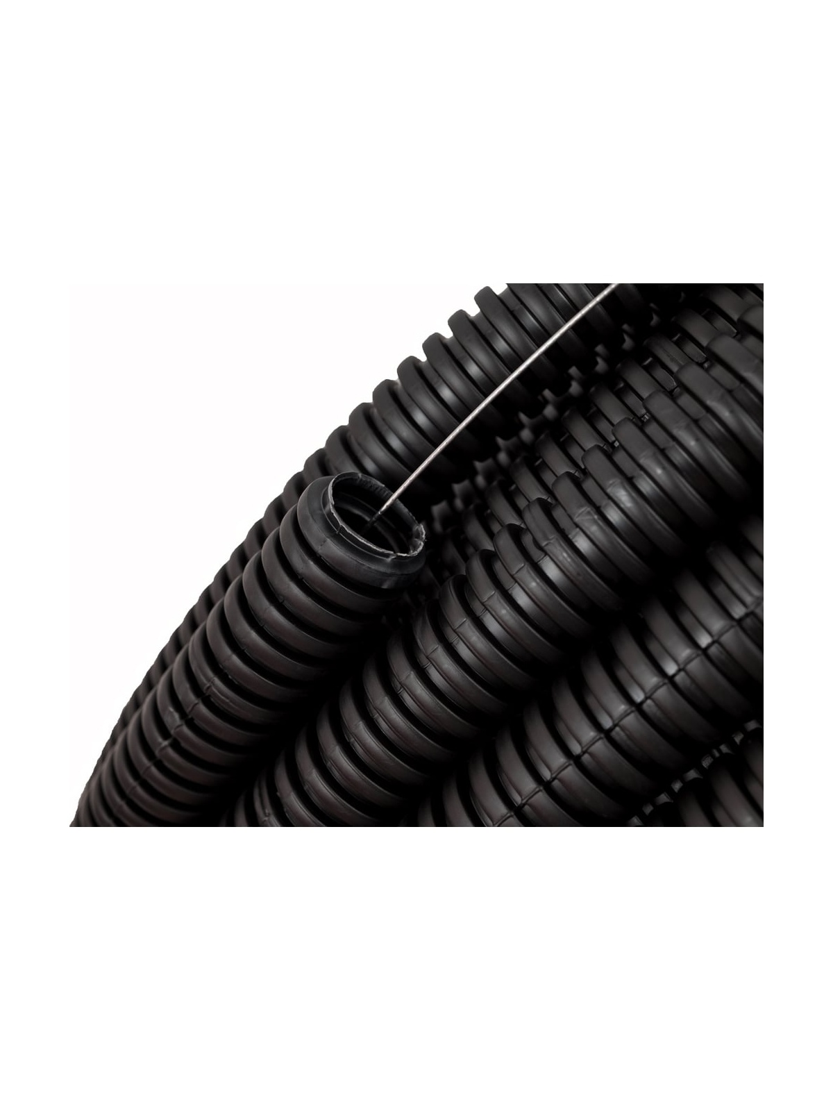 Гофрированная труба ПНД Gigant лёгкая черная D20 100м 20120-100GI предназначена для защиты изолированных проводов и кабелей от механических повреждений и агрессивного воздействия окружающей среды. Применяется для прокладки и защиты электрических, слаботочных, телефонных, компьютерных сетей, а также для огнестойких кабельных линий. Используется для монтажа как внутри помещений, так и снаружи. Преимущества: Не содержит галогенов, не выделяет вредных веществ при нагревании, соответствует ГОСТ IEC 60754-2-2015. Повышенная эластичность и ударная прочность. Стойкость к ультрафиолету. Удобство протяжки кабеля обеспечивается наличием зонда (протяжки). Срок службы труб из ПНД - более 50 лет.
