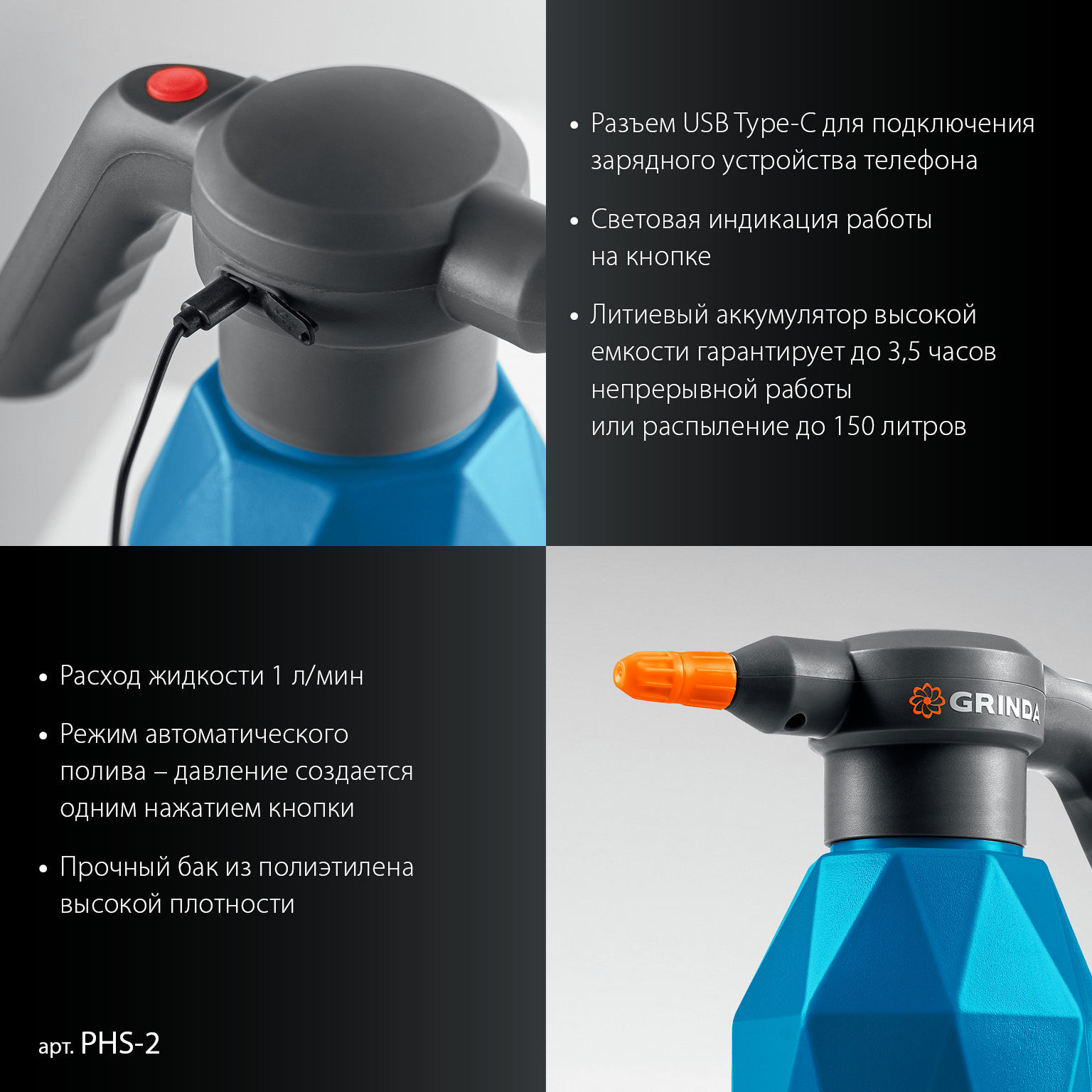 - Бак объемом 2 литра выдерживает работу с химикатами и удобрениями