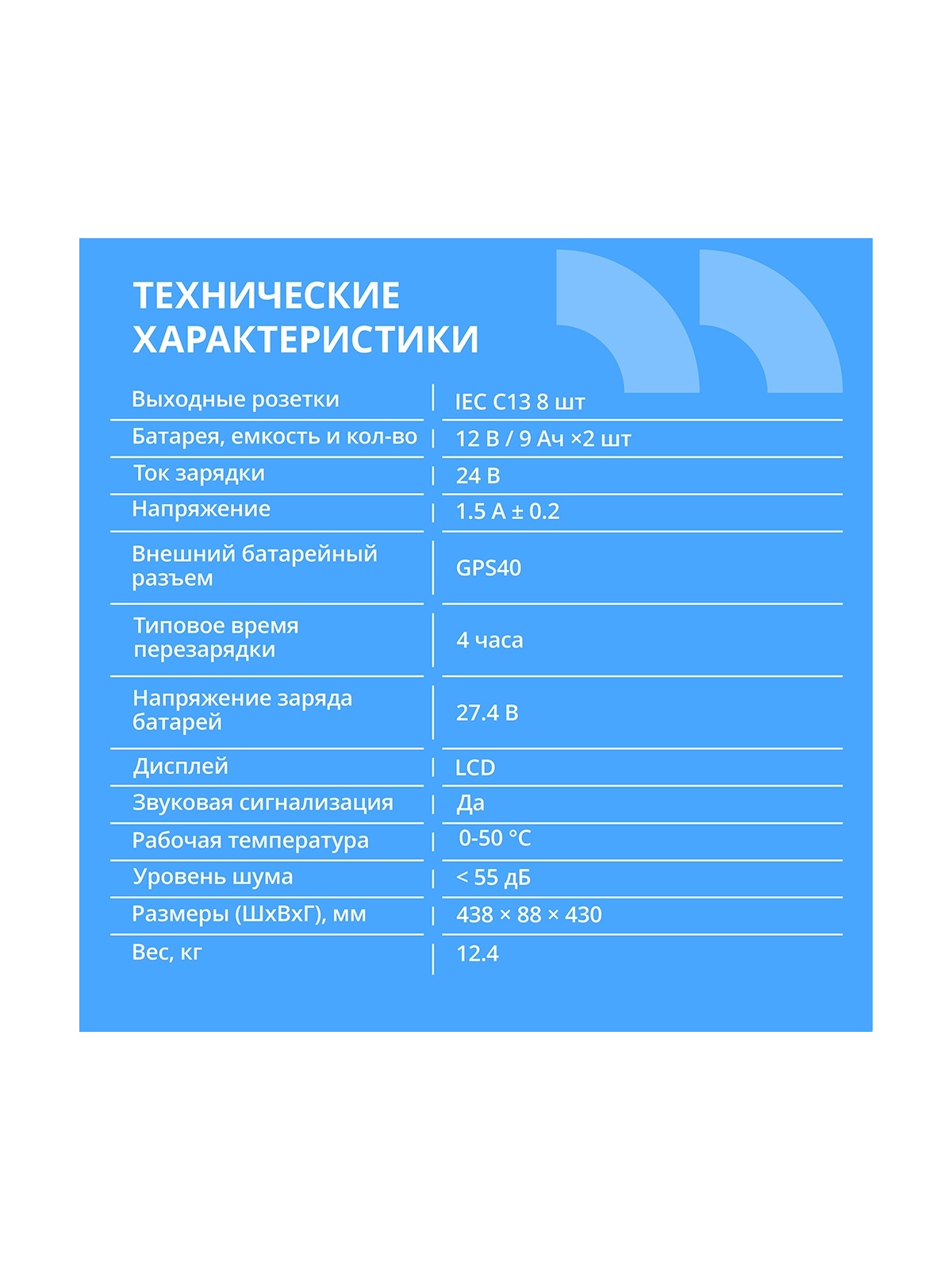 | Особенности ИБП | Холодный старт, Возможность замены батареи, Подключение внешней батареи, Индикация, Установка в стойку, Байпас, Звуковой сигнал |