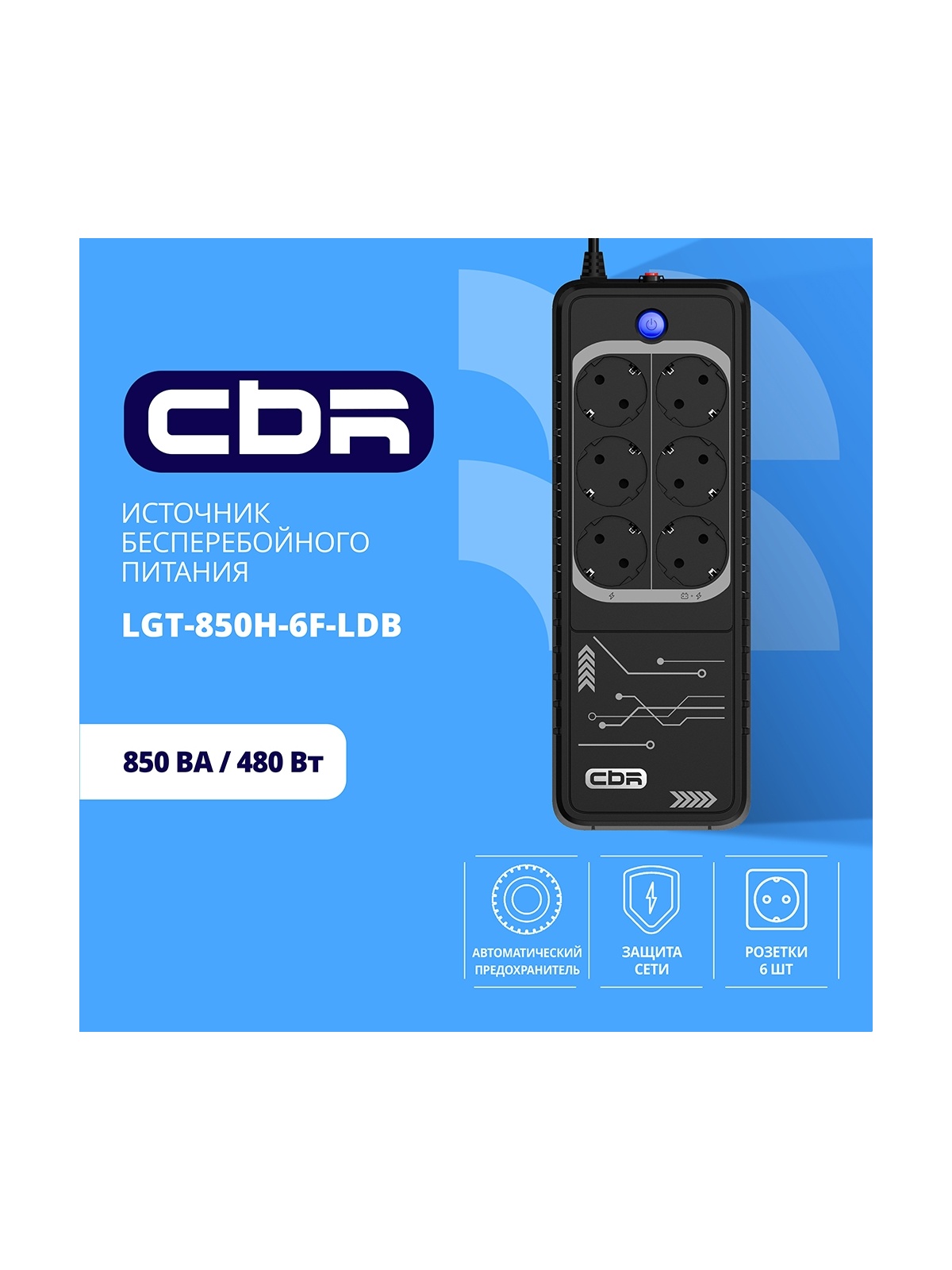 ИБП CBR LIGHT LGT-850 [850VA/480W 6 x EURO, 3 c фильтрацией + 3 с резервированием, Breaker]