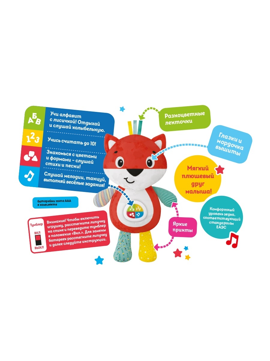 Специально разработанные звуковые функции развлекают и обучают одновременно: весёлые мелодии, забавные фразы, ритмичные стихи — всё это помогает малышу осваивать алфавит, учиться считать до 10, знакомиться с цветами и формами. Яркие принты и вышитые глазки добавляют игрушке живости и привлекательности, а комфортный уровень громкости соответствует стандартам ЕАЭС, заботясь о слухе ребёнка.