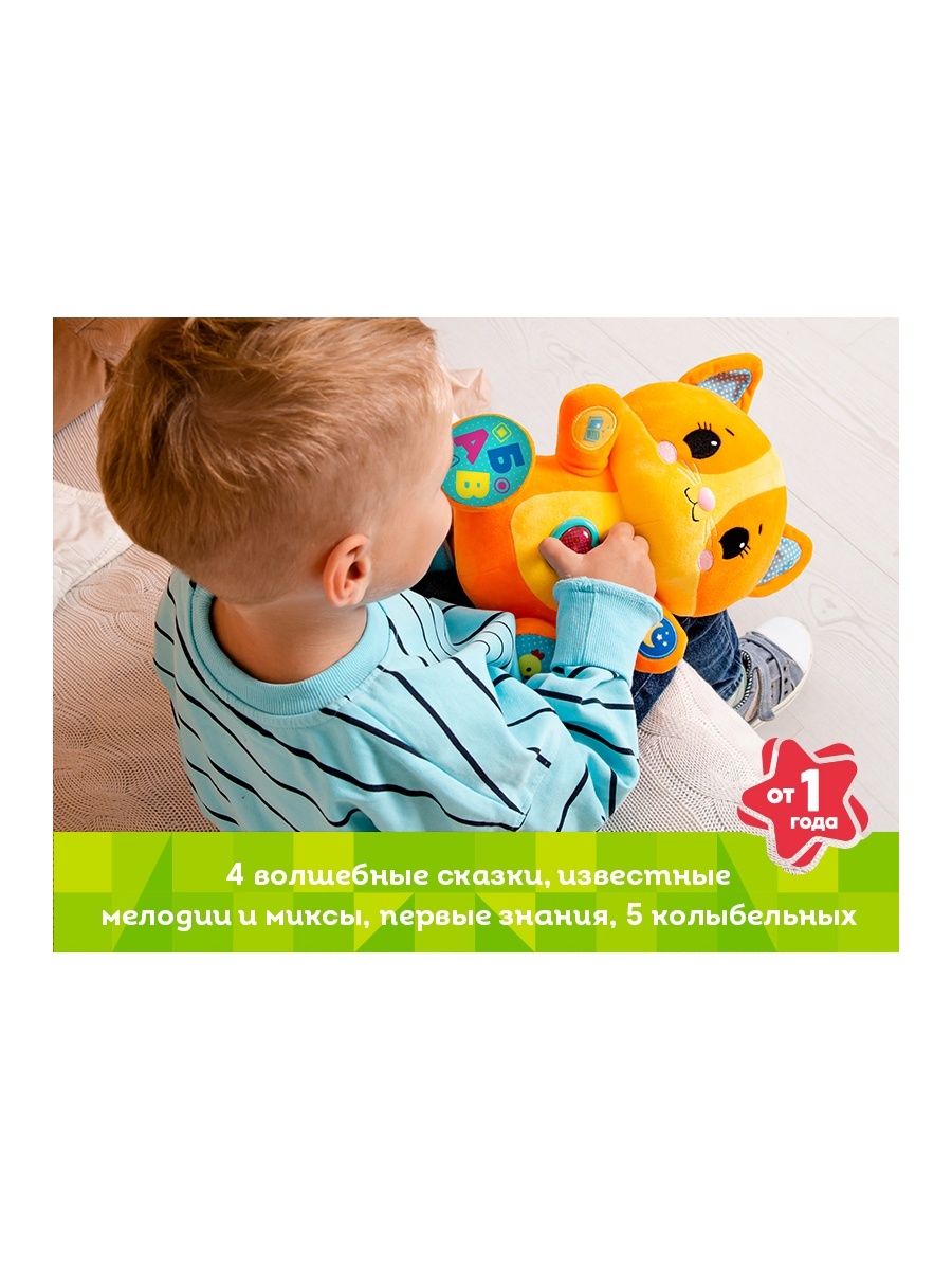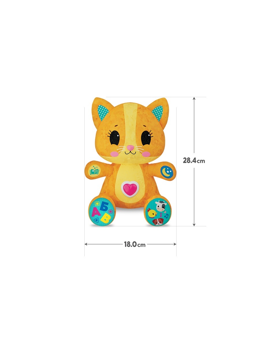 С его вышитыми глазками и милой мордочкой, ваш ребенок сразу же почувствует связь с этим умным другом. Нажимая на кнопку на животе, юный исследователь погружается в мир интересных заданий, слушает популярные мелодии и знакомится с забавными фразами. Лапка котенка активирует успокаивающие колыбельные, способствует созданию уютной атмосферы перед сном.