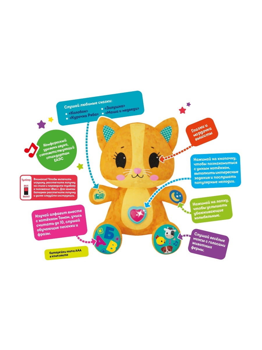 Котенок Том не только развлекает, но и обучает: вместе с ним можно изучать алфавит, учиться считать до 10 и слушать познавательные песенки. Озвученные любимые сказки развивают воображение и язык малыша. Благодаря комфортному уровню звука, соответствующему стандартам ЕАЭС, родители могут быть уверены в безопасности и качестве игрушки.