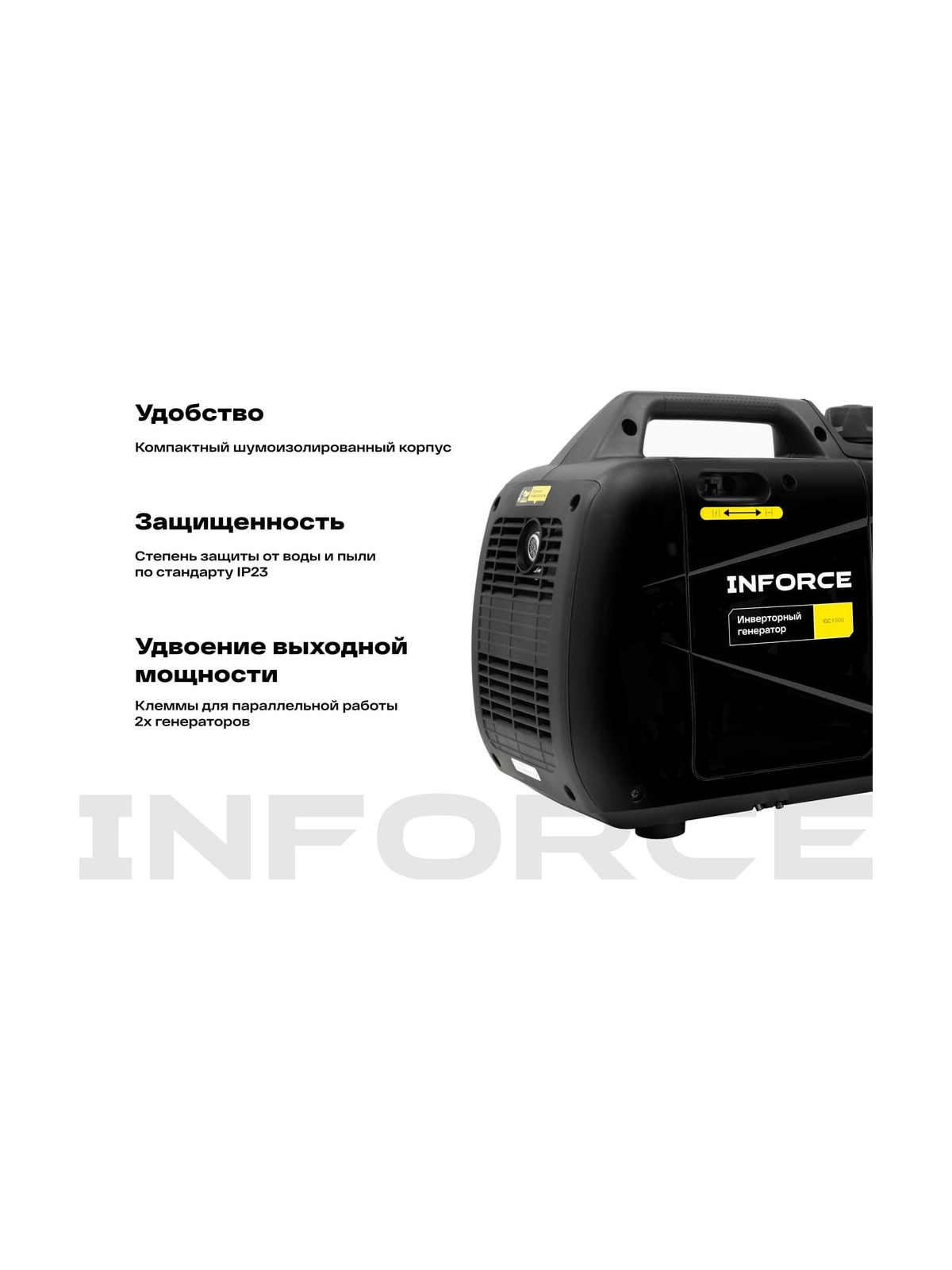 Инверторный генератор Inforce IGC 1000 предназначен для организации источника питания в условиях отсутствия центрального электроснабжения. Аппарат обеспечивает идеальное качество тока. Это дает возможность подключать электронные приборы напрямую без стабилизатора напряжения. Шумозащитный кожух отлично снижает уровень звукового давления.