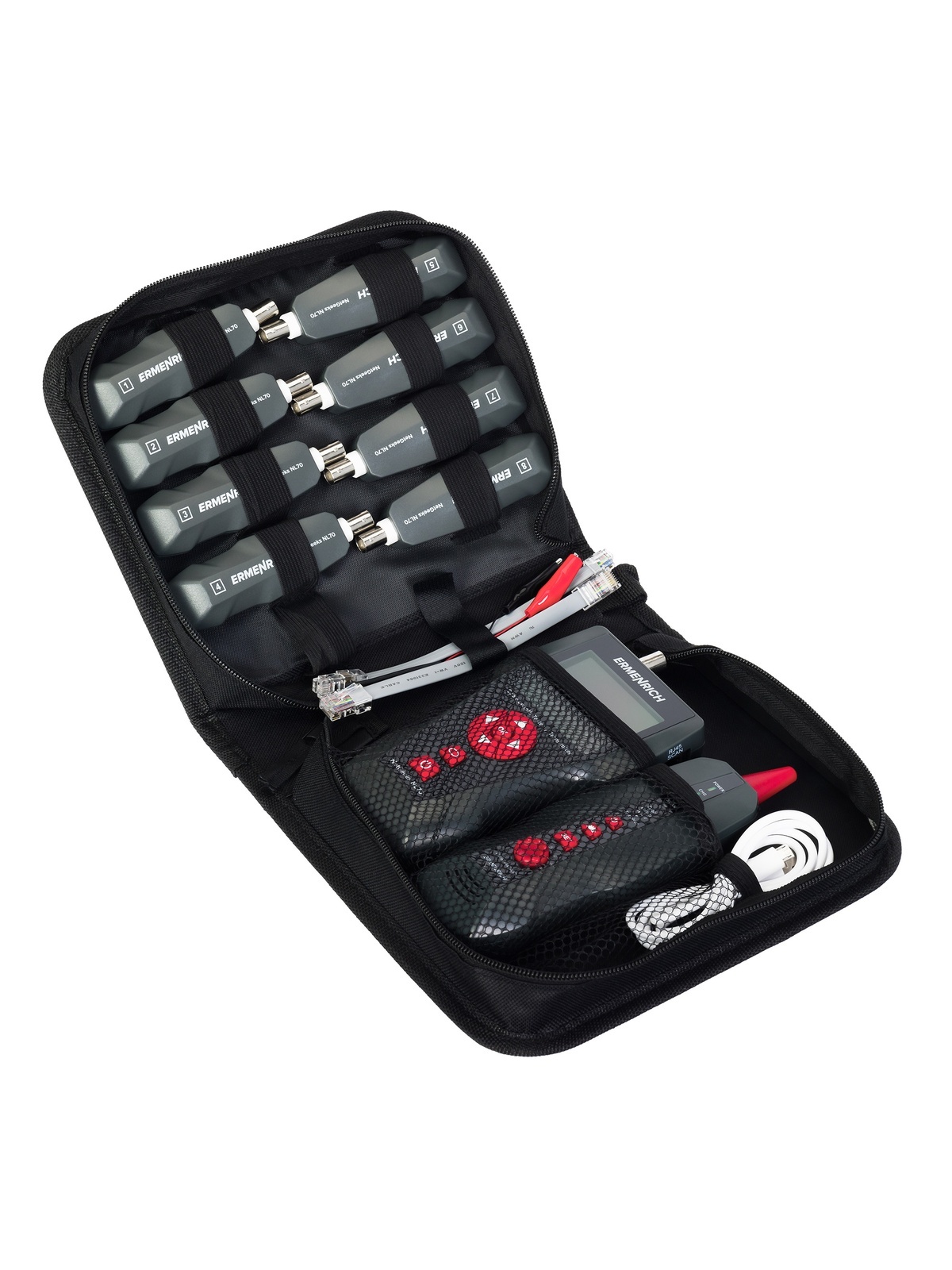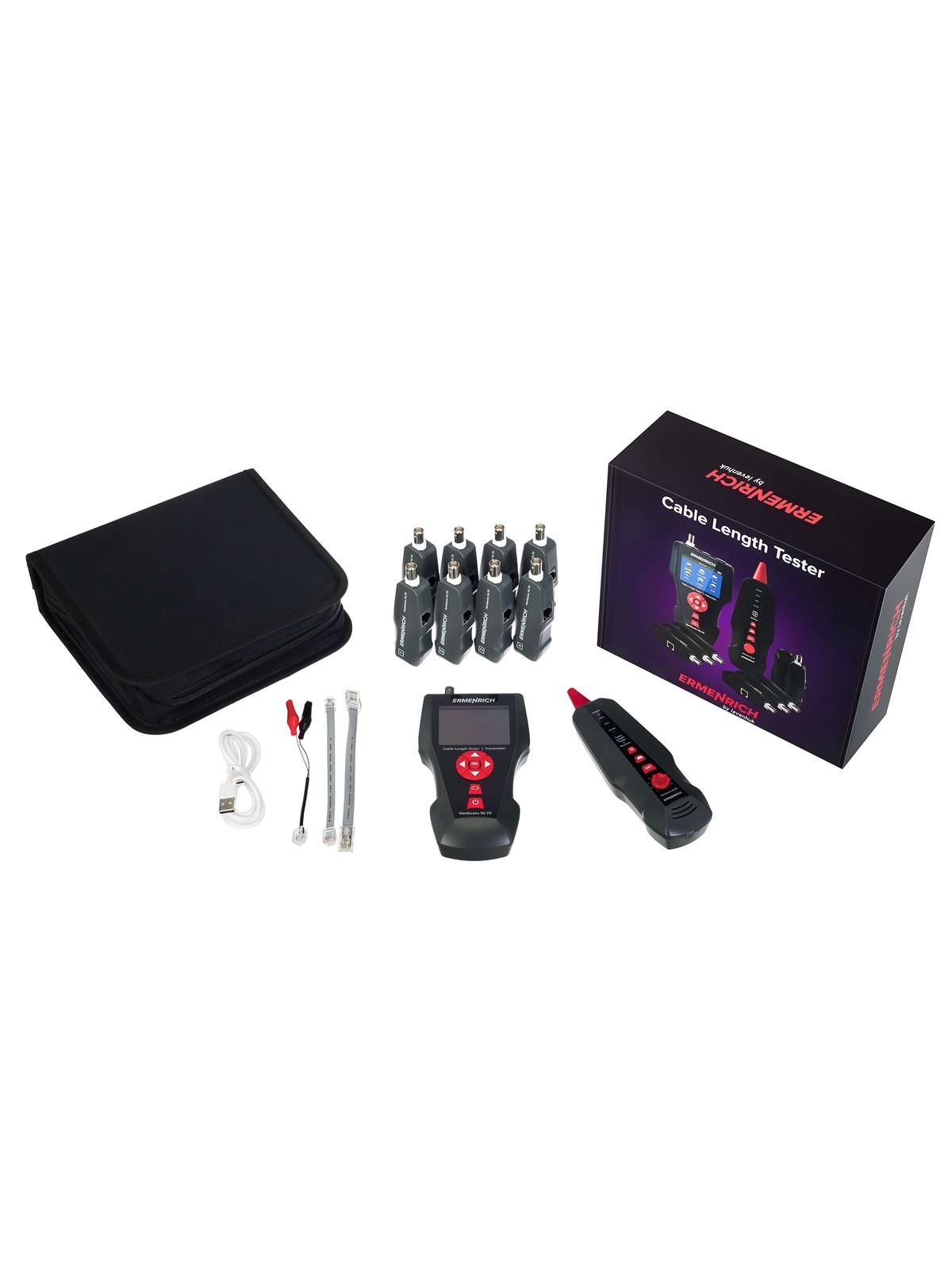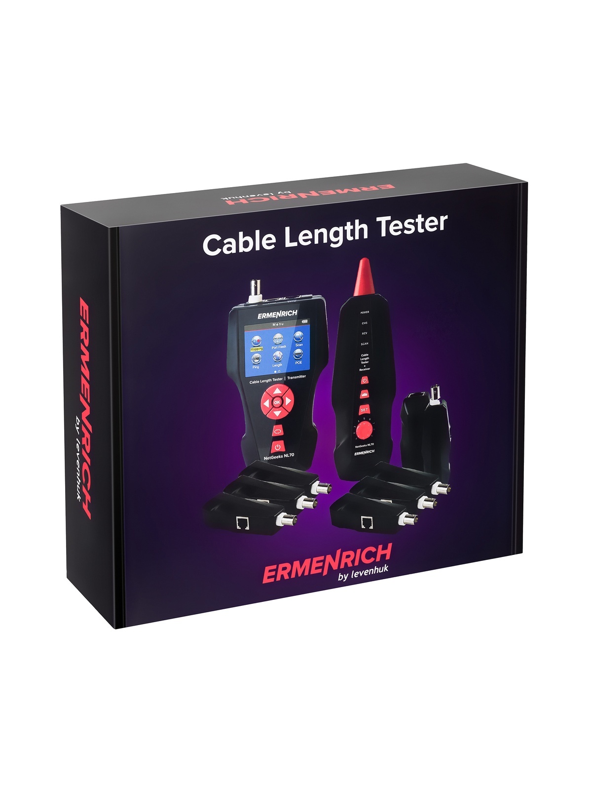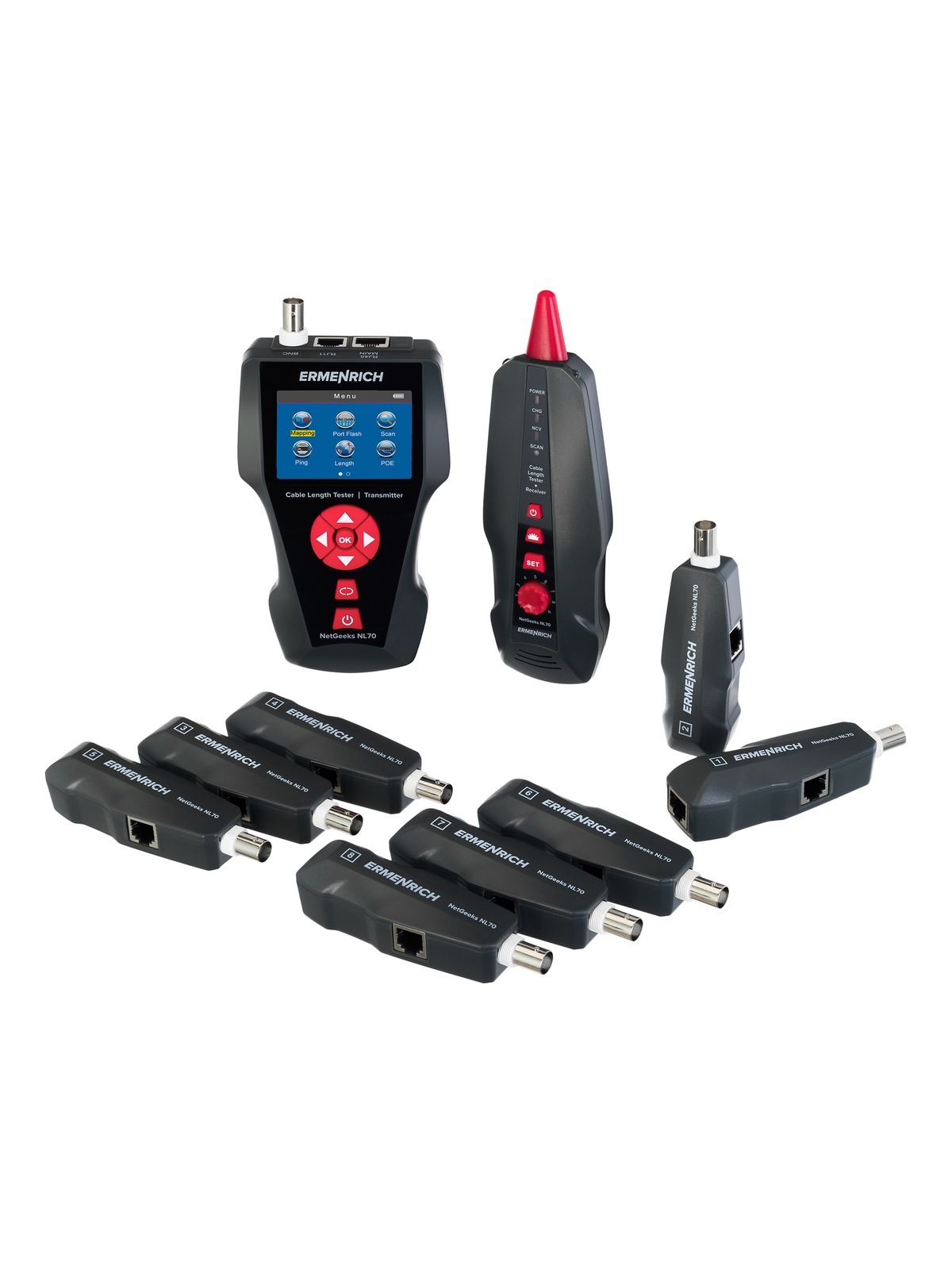 Используя Ermenrich NetGeeks NL70, можно обнаружить различные неисправности в электросети: короткое замыкание, обрыв линии, а также перекрещенные, расщепленные и перевернутые пары кабелей. Есть возможность определить, на каком расстоянии находится проблемное место. С помощью функции трассировки находят нужный кабель и определяют его направление. Порт подключения определяют с помощью функции Port Flash (проблесковая индикация). Прибор также позволяет выполнять тест PoE (проверку соединения Ethernet) и PING-тест (проверку скорости интернет-соединения), при этом результат можно сохранить на карту памяти.