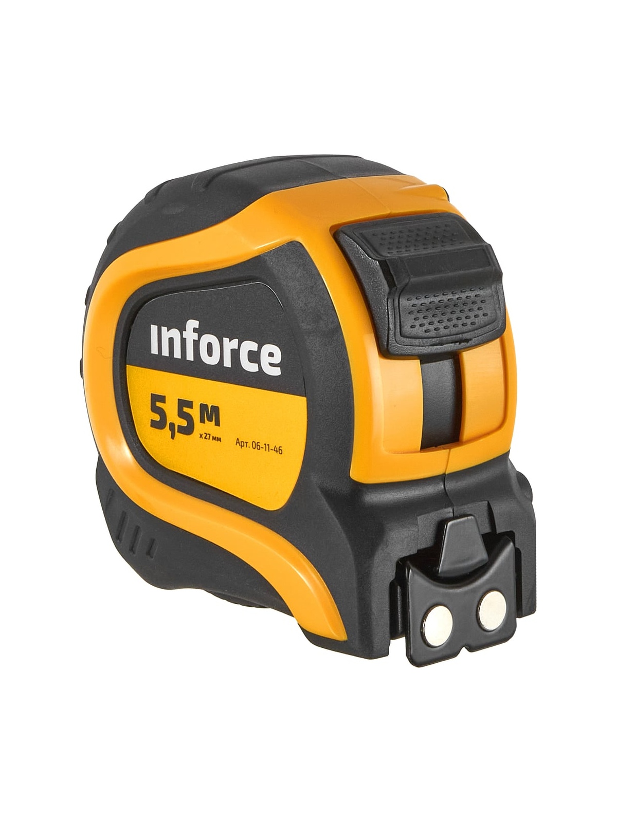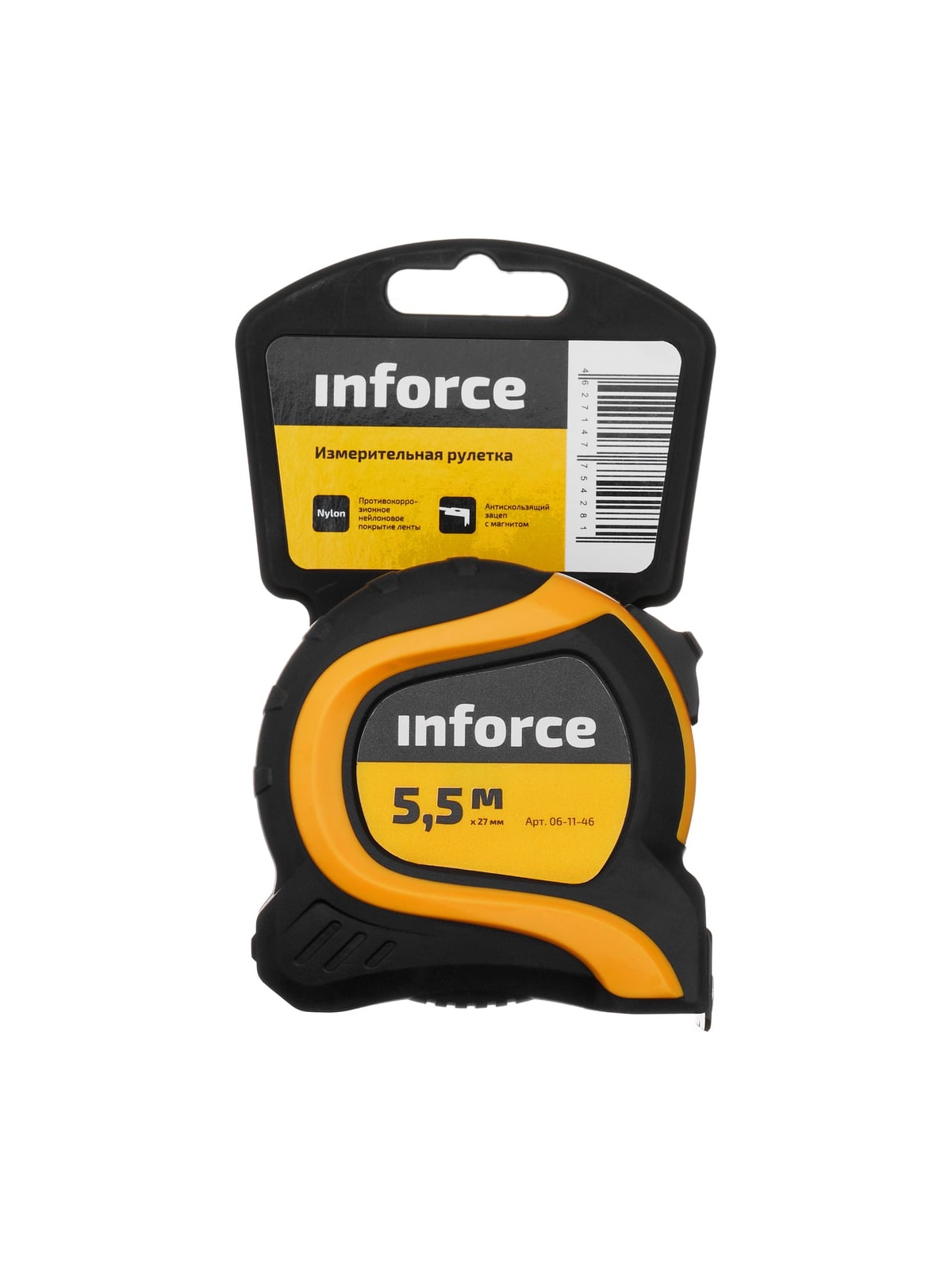 Измерительная рулетка с нейлоновой лентой и магнитным зацепом 5.5x27мм Inforce 06-11-46 - компактное и простое в использовании приспособление для измерения объектов на строительной площадке. Стальная нейлоновая лента, обладающая высокой прочностью, имеет длину 5.5 метра. Для предотвращения скручивания ленты в процессе эксплуатации предусмотрена специальная защелка.