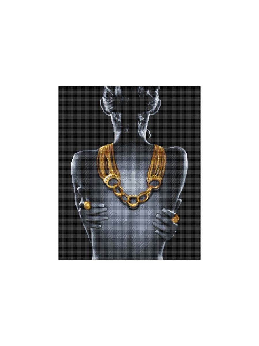 Монохромную алмазную мозаику в оттенках темно-серого и черного цветов с расставленными акцентами золотого цвета можно своими руками выложить на холсте с клеевой основой. Эффектная мозаичная картина украсит интерьер и сможет стать прекрасным подарком.