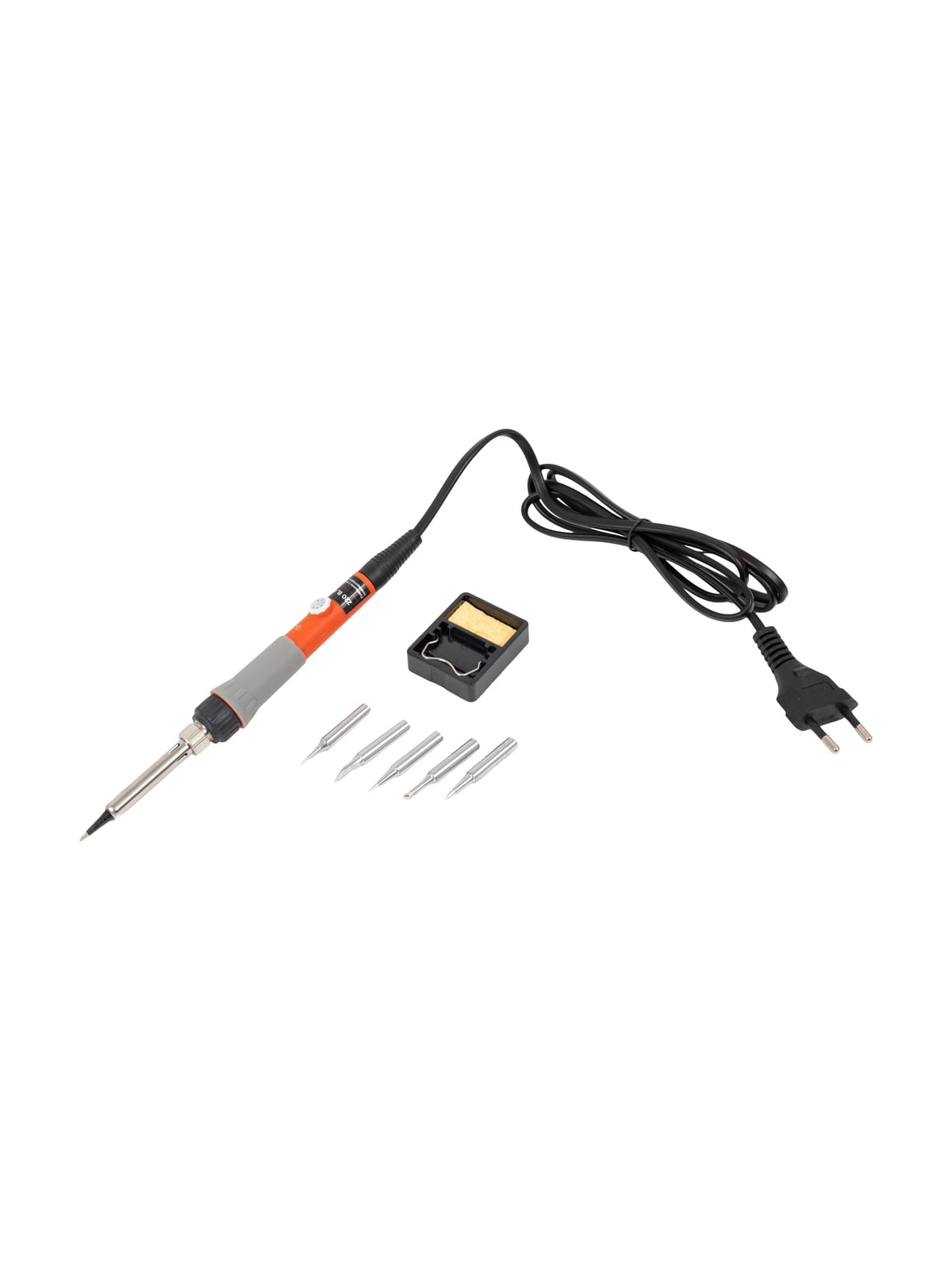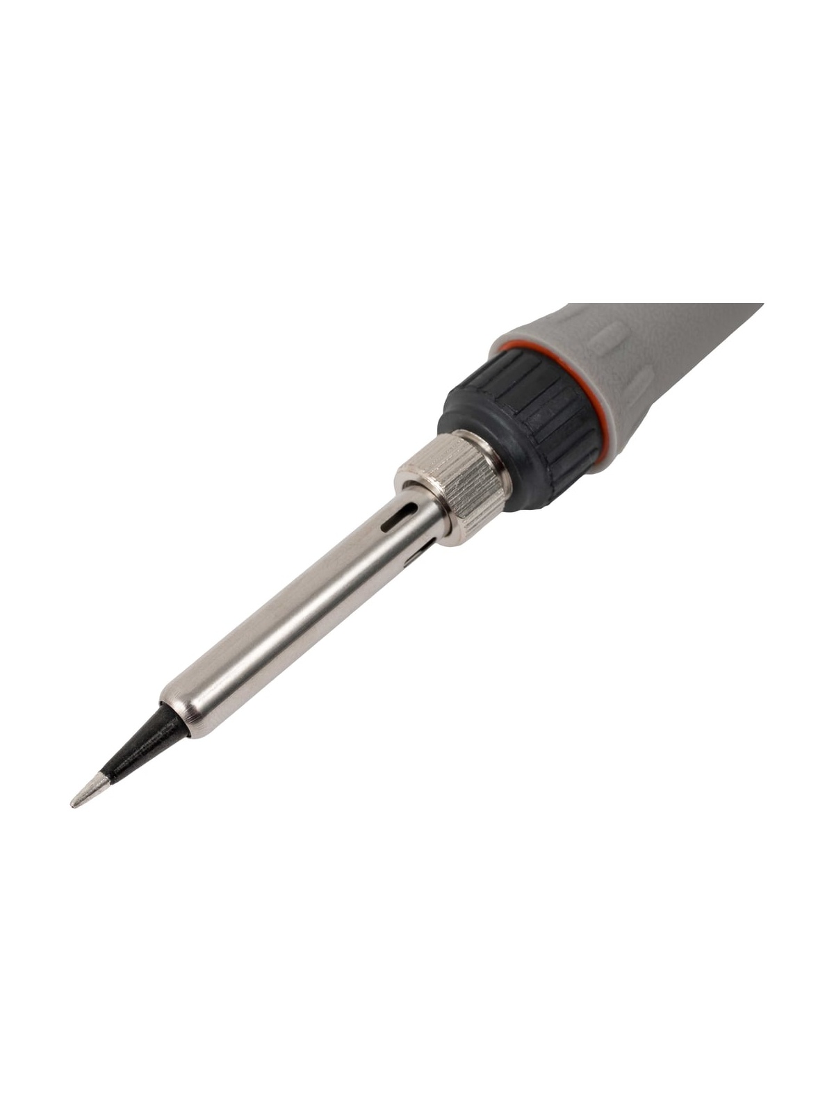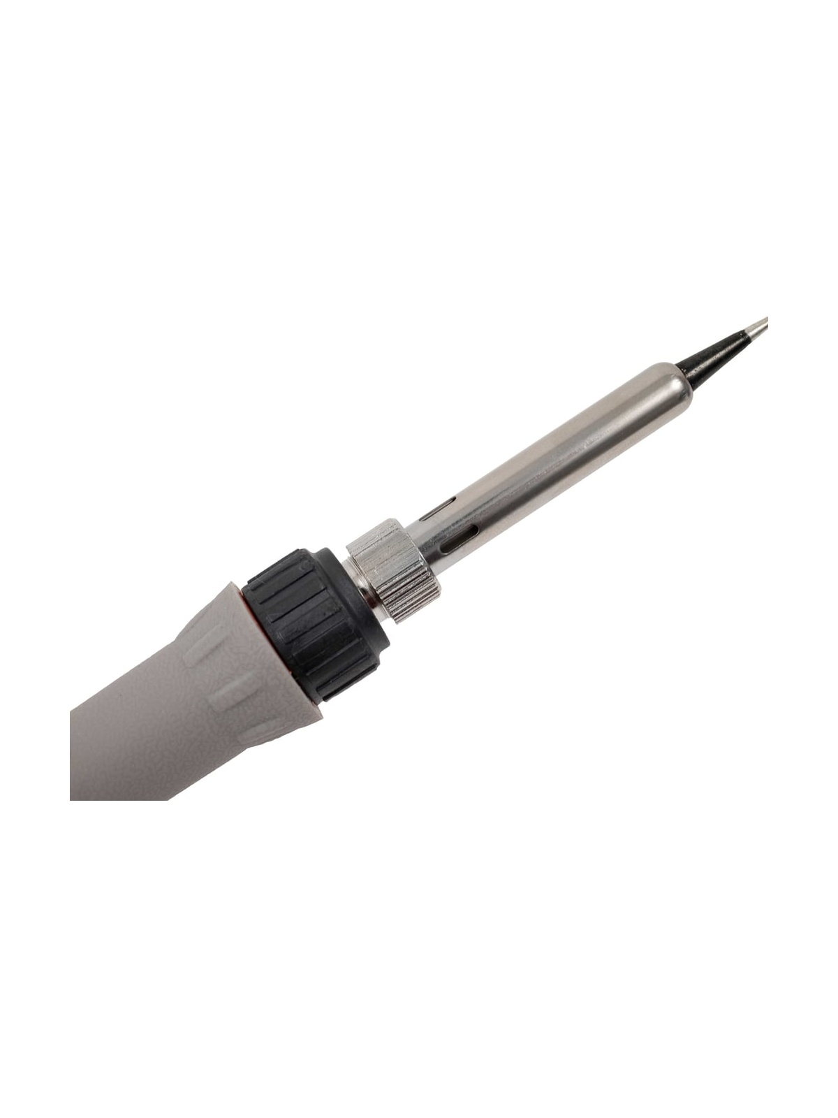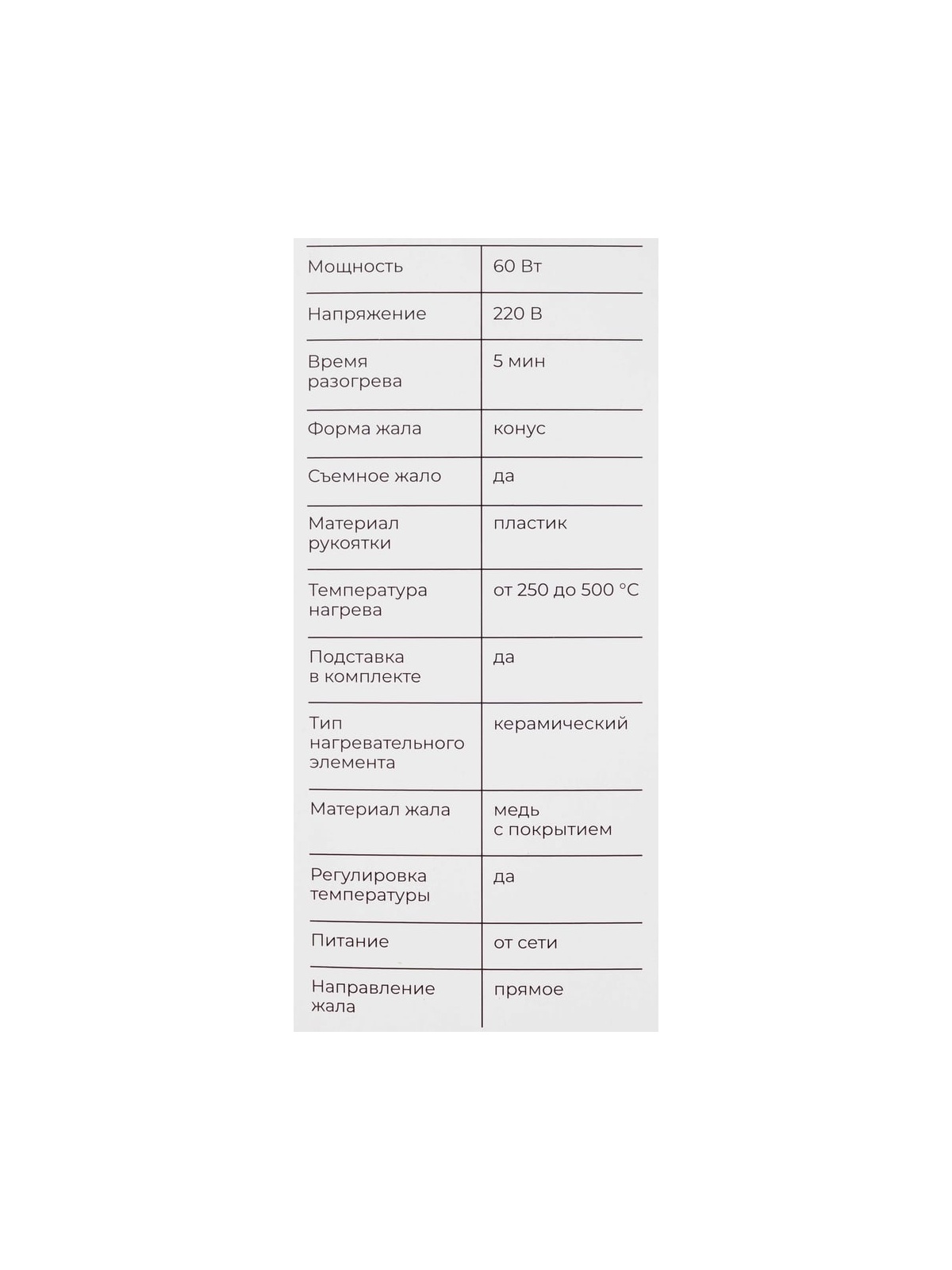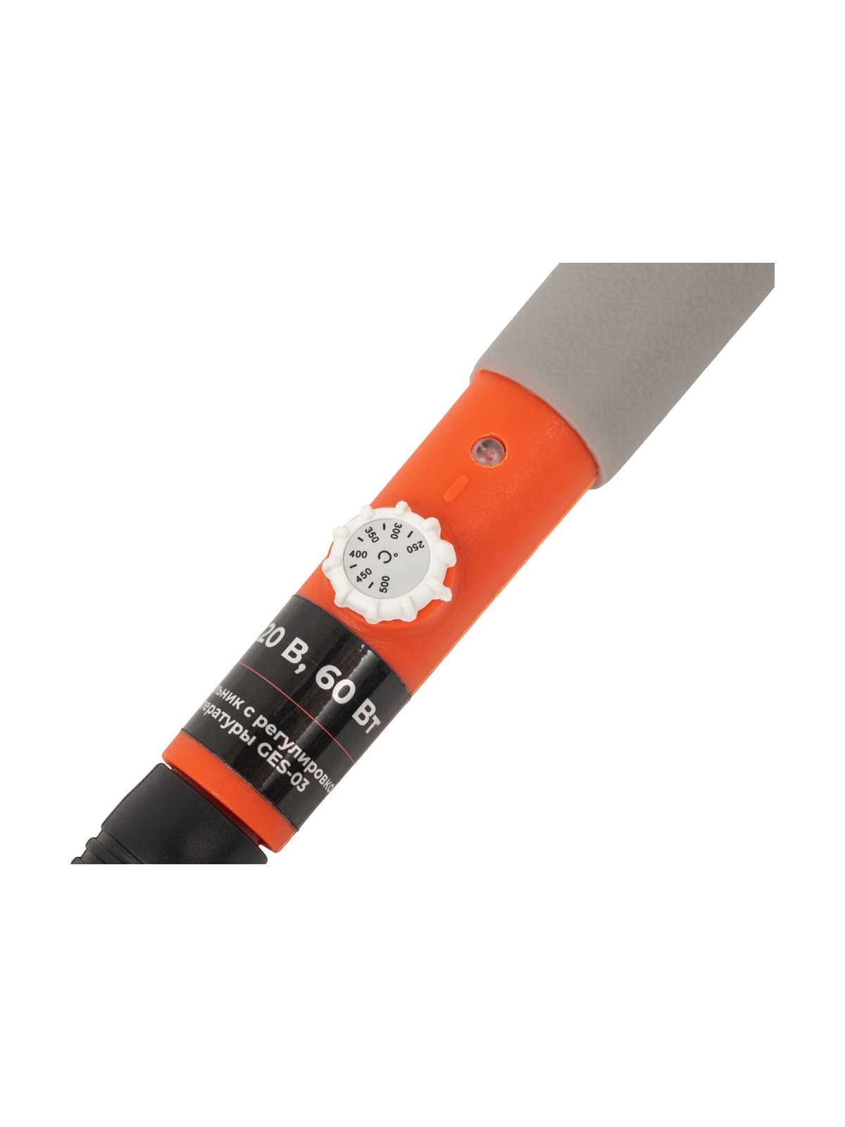 Керамический паяльник Gigant GES-03 мощностью 60 Вт — надежный и удобный паяльник с современной керамической нагревательной системой, предназначенный как для профессионалов, так и для домашних мастеров. Быстрый разогрев, широкие возможности регулировки температуры и расширенная комплектация делают его идеальным инструментом для точной электроники, ремонта техники, творчества и хобби. Особенности: Мощность: 60 Вт — быстрый выход на рабочую температуру для пайки большинства типов материалов. Керамический нагревательный элемент: обеспечивает стабильный нагрев и долгий срок службы без перегрева. Регулировка температуры (250–500°C): удобный плавный регулятор позволяет точно настроить температуру под каждую задачу. Пять сменных жал: подходят для различных работ — от пайки микросхем до монтажных работ. Эргономичная ручка: двухкомпонентное покрытие из нейлона и силикона надежно фиксируется в руке и не скользит. Компактная складная подставка: обеспечивает безопасность и удобство при перерывах в работе. Долговечное конусное жало: выполнено из меди и покрыто защитным лужением, устойчиво к износу и коррозии.