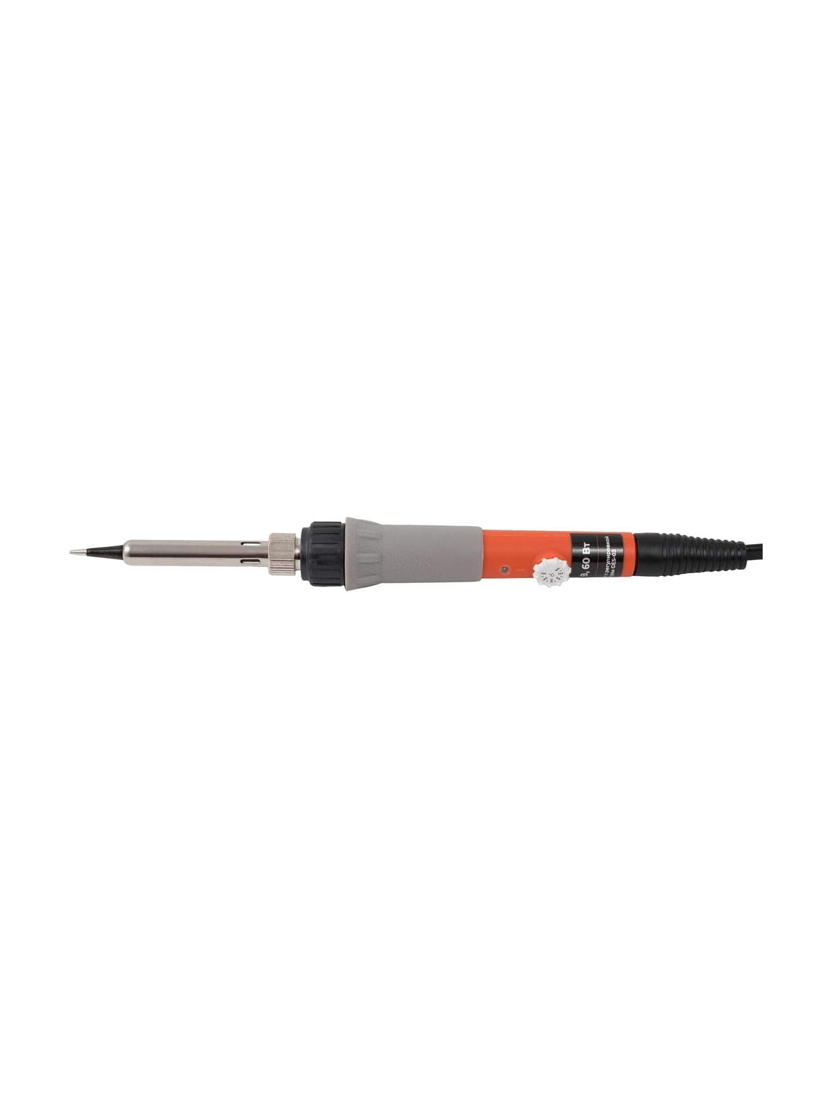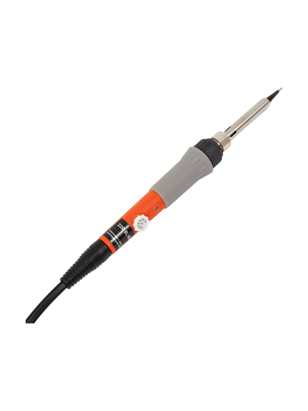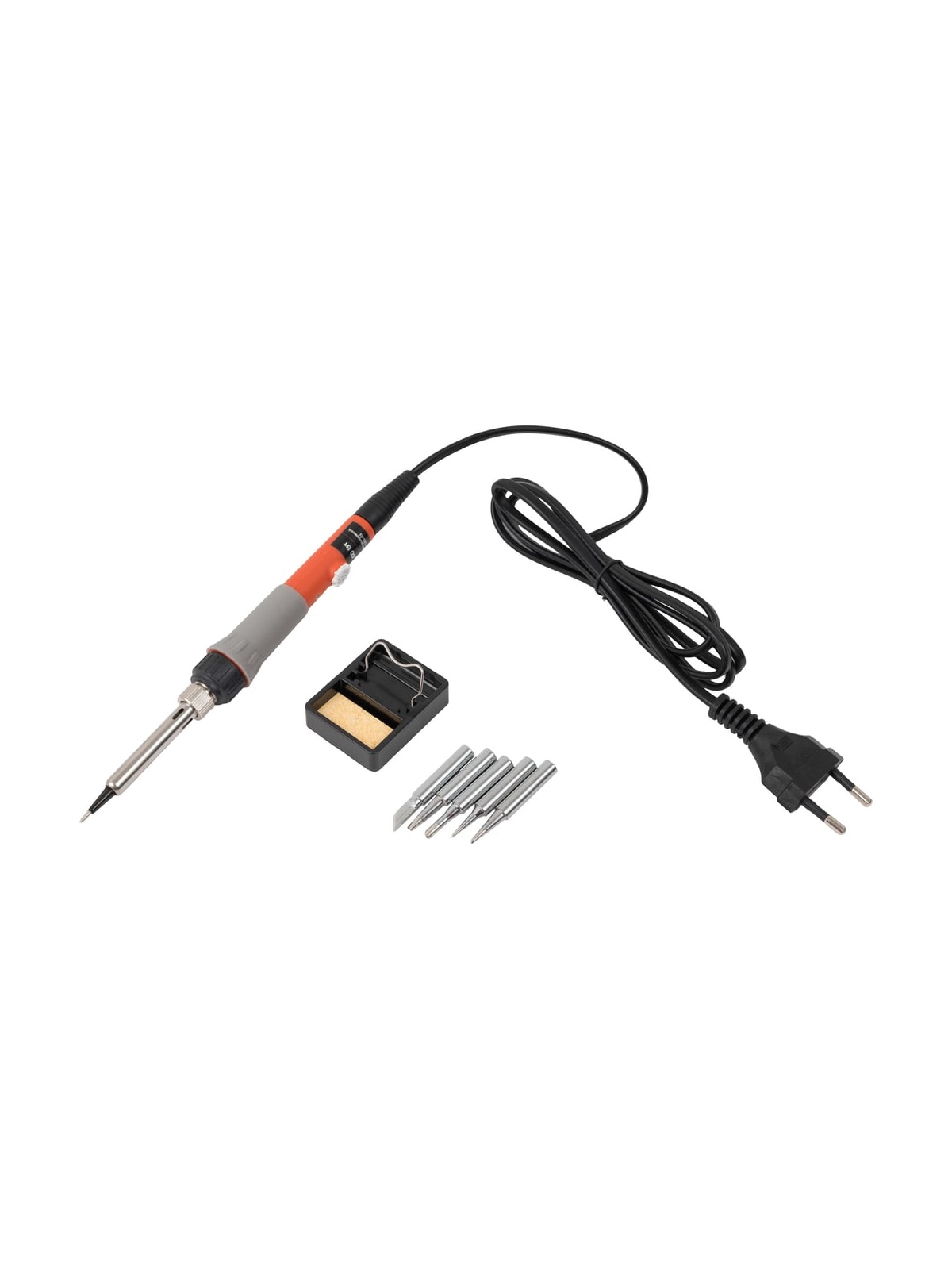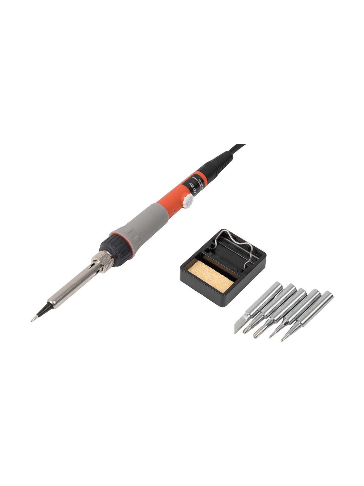 Керамический паяльник Gigant GES-03 мощностью 60 Вт — надежный и удобный паяльник с современной керамической нагревательной системой, предназначенный как для профессионалов, так и для домашних мастеров. Быстрый разогрев, широкие возможности регулировки температуры и расширенная комплектация делают его идеальным инструментом для точной электроники, ремонта техники, творчества и хобби. Особенности: Мощность: 60 Вт — быстрый выход на рабочую температуру для пайки большинства типов материалов. Керамический нагревательный элемент: обеспечивает стабильный нагрев и долгий срок службы без перегрева. Регулировка температуры (250–500°C): удобный плавный регулятор позволяет точно настроить температуру под каждую задачу. Пять сменных жал: подходят для различных работ — от пайки микросхем до монтажных работ. Эргономичная ручка: двухкомпонентное покрытие из нейлона и силикона надежно фиксируется в руке и не скользит. Компактная складная подставка: обеспечивает безопасность и удобство при перерывах в работе. Долговечное конусное жало: выполнено из меди и покрыто защитным лужением, устойчиво к износу и коррозии.