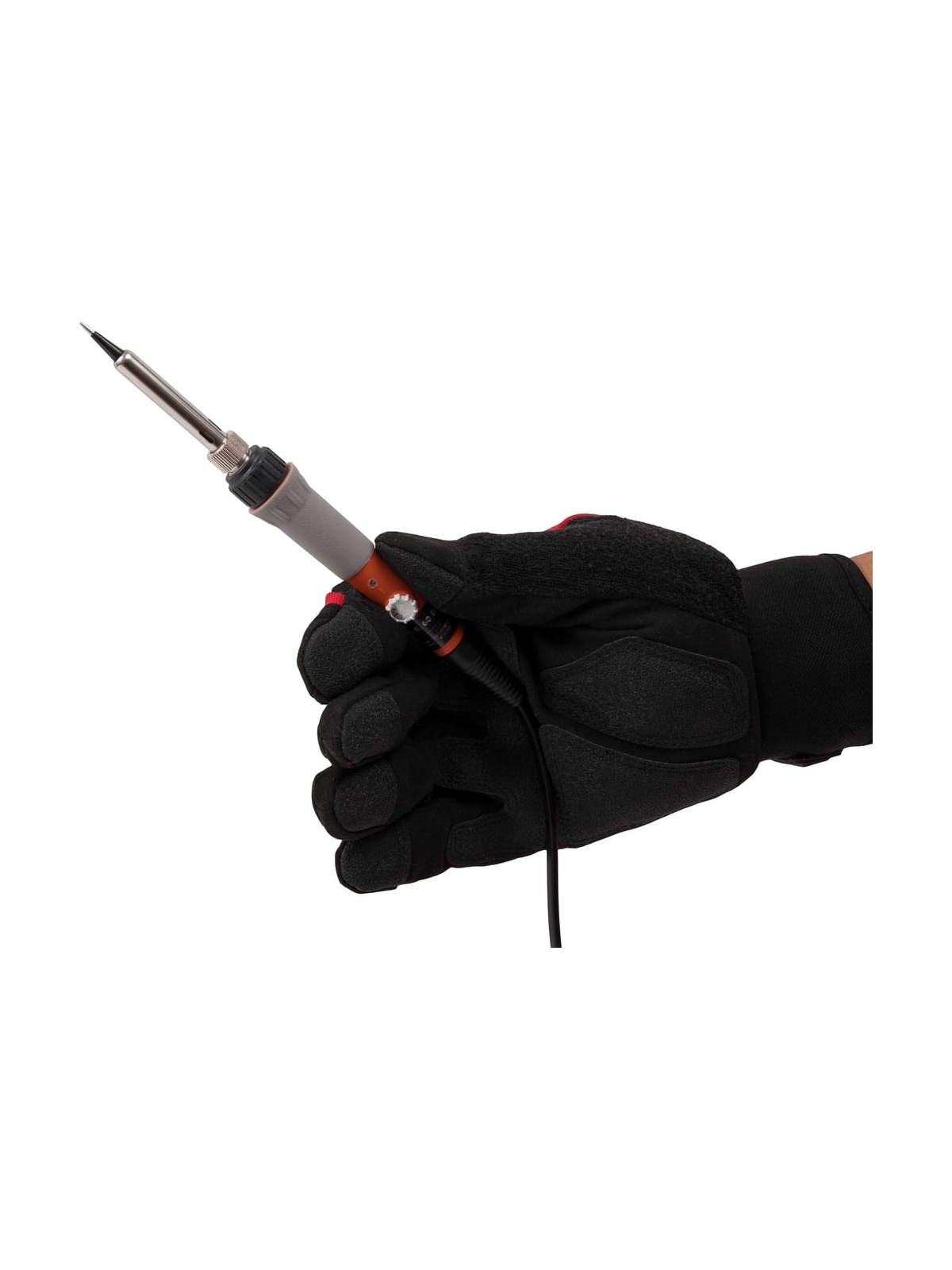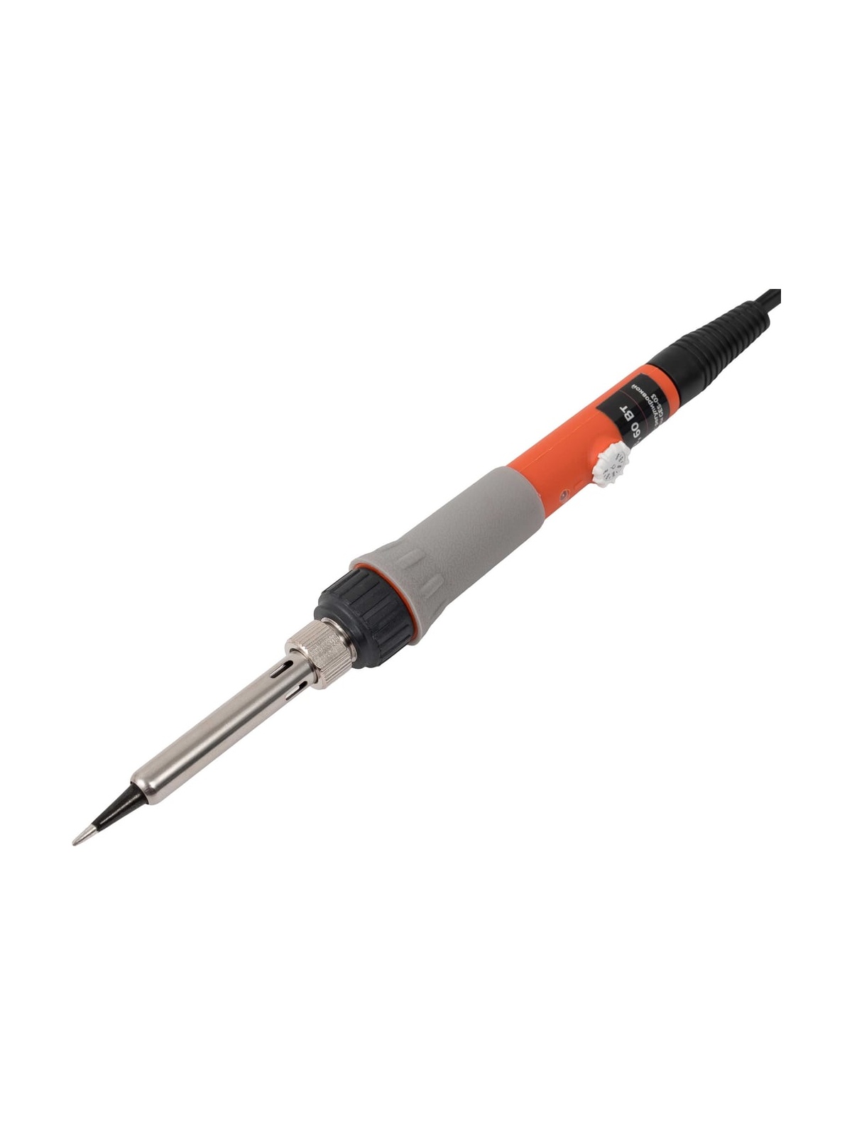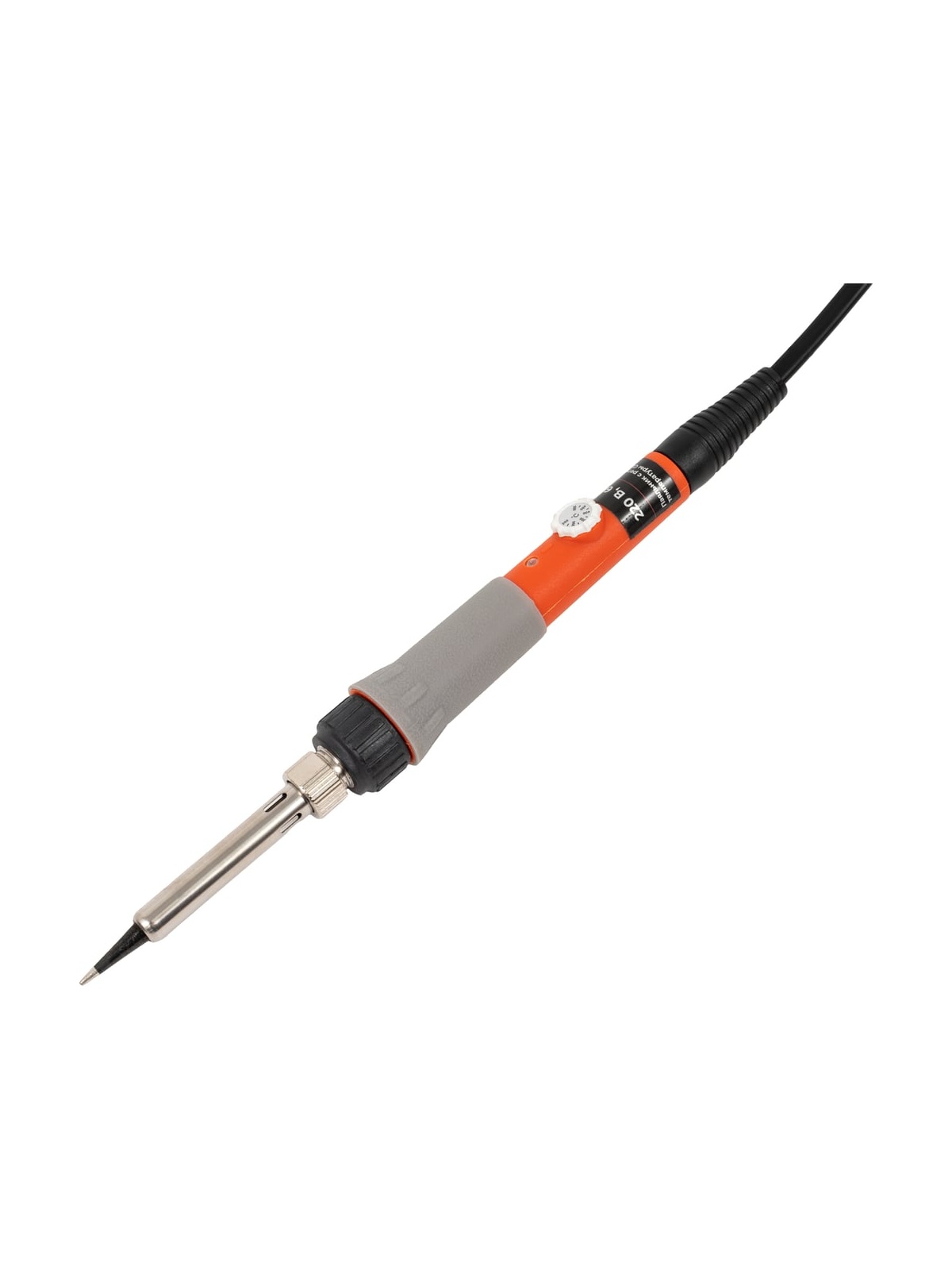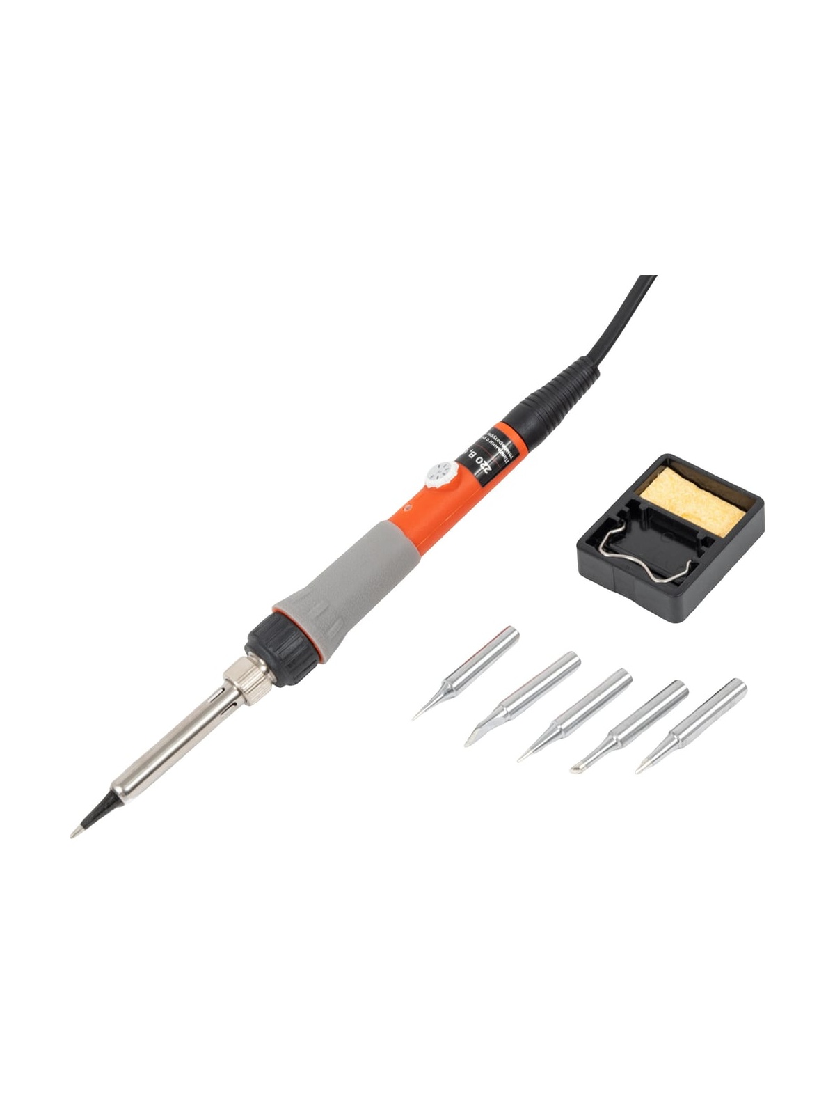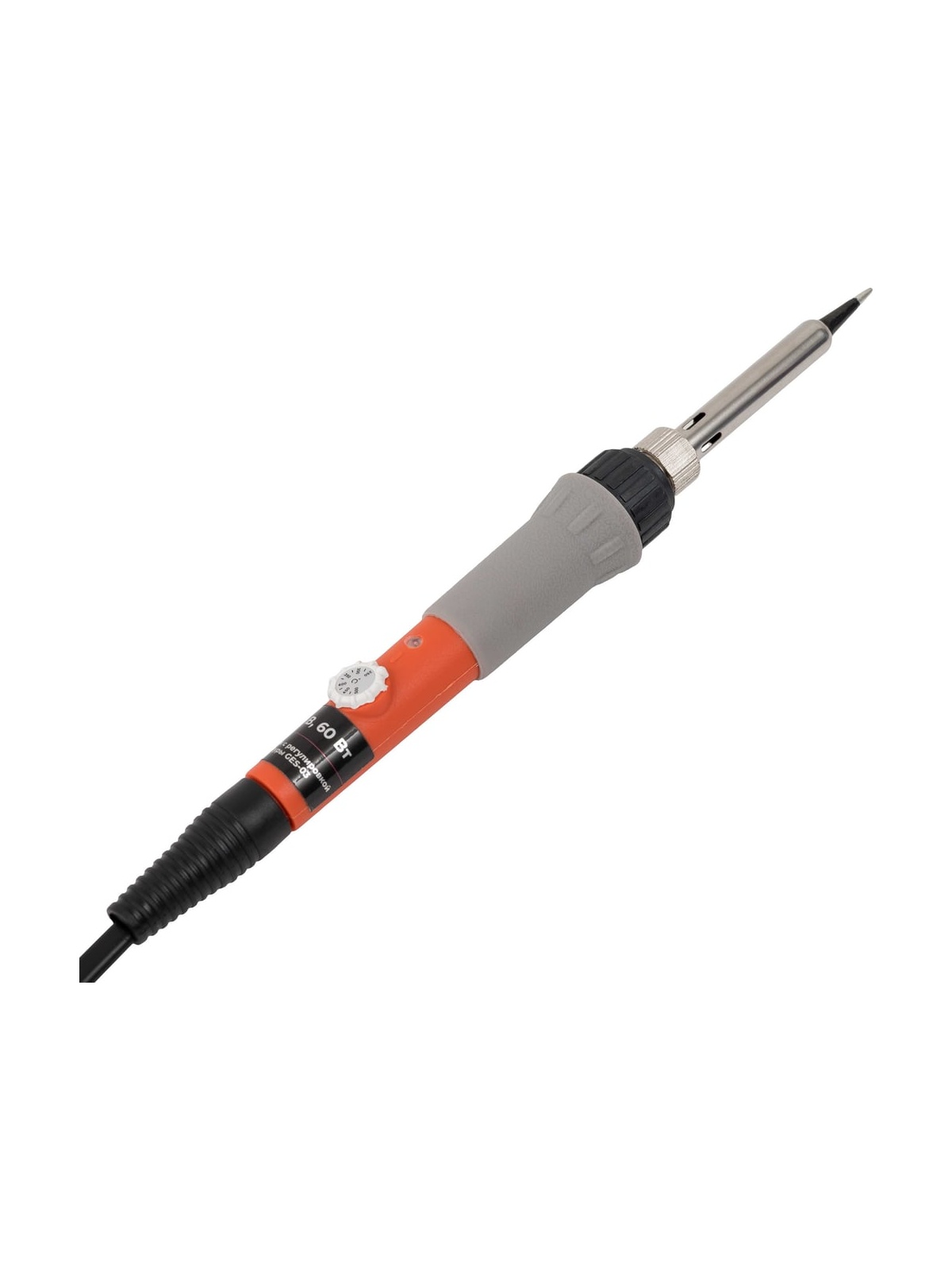 Керамический паяльник Gigant GES-03 мощностью 60 Вт — надежный и удобный паяльник с современной керамической нагревательной системой, предназначенный как для профессионалов, так и для домашних мастеров. Быстрый разогрев, широкие возможности регулировки температуры и расширенная комплектация делают его идеальным инструментом для точной электроники, ремонта техники, творчества и хобби. Особенности: Мощность: 60 Вт — быстрый выход на рабочую температуру для пайки большинства типов материалов. Керамический нагревательный элемент: обеспечивает стабильный нагрев и долгий срок службы без перегрева. Регулировка температуры (250–500°C): удобный плавный регулятор позволяет точно настроить температуру под каждую задачу. Пять сменных жал: подходят для различных работ — от пайки микросхем до монтажных работ. Эргономичная ручка: двухкомпонентное покрытие из нейлона и силикона надежно фиксируется в руке и не скользит. Компактная складная подставка: обеспечивает безопасность и удобство при перерывах в работе. Долговечное конусное жало: выполнено из меди и покрыто защитным лужением, устойчиво к износу и коррозии.