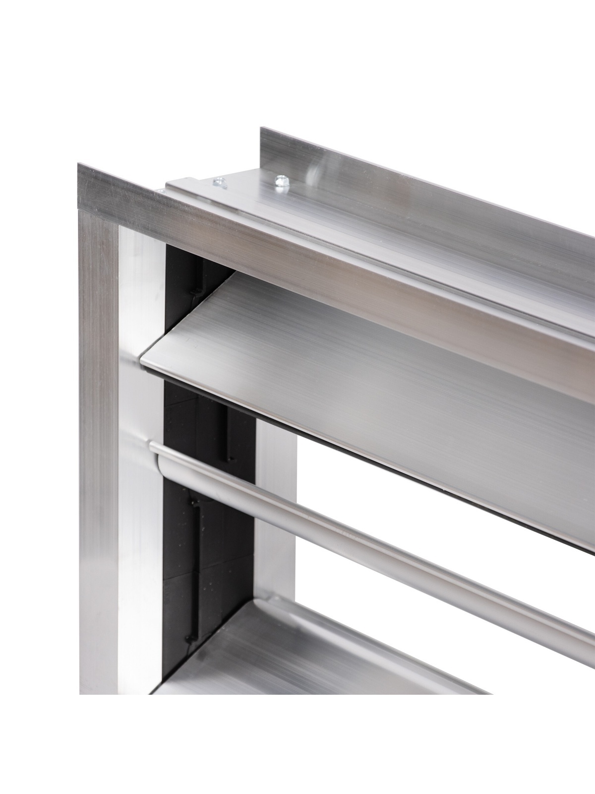 Клапаны изготавливаются из алюминиевого профиля, с шестернями, скрытыми внутри корпуса. За счет применения специального профиля высотой 150 мм увеличено проходное (живое) сечение в типоразмерах с высотой 150, 250, 350 и т.д. Герметичность клапана достигается за счет резинового уплотнителя, который установлен на каждой поворотной пластине. Клапаны оснащены квадратным штоком под привод. Ручной привод – опция.