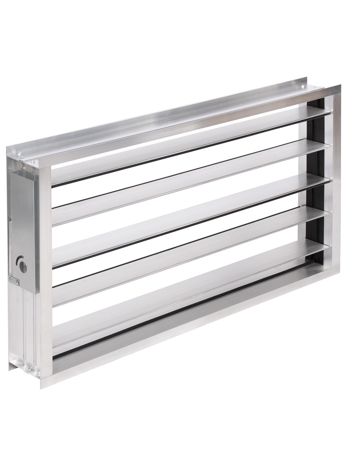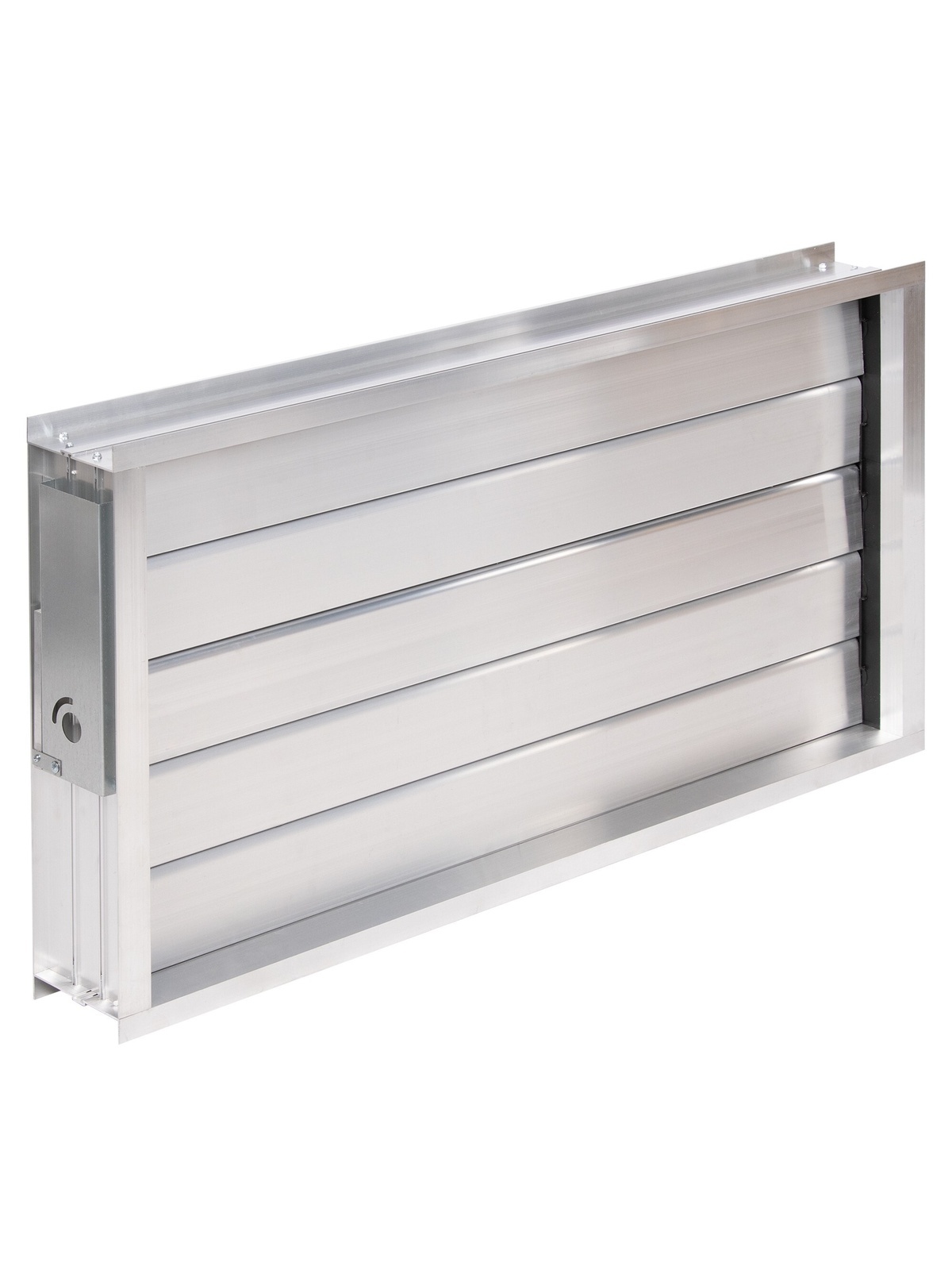 Клапаны изготавливаются из алюминиевого профиля, с шестернями, скрытыми внутри корпуса. За счет применения специального профиля высотой 150 мм увеличено проходное (живое) сечение в типоразмерах с высотой 150, 250, 350 и т.д. Герметичность клапана достигается за счет резинового уплотнителя, который установлен на каждой поворотной пластине. Клапаны оснащены квадратным штоком под привод. Ручной привод – опция.