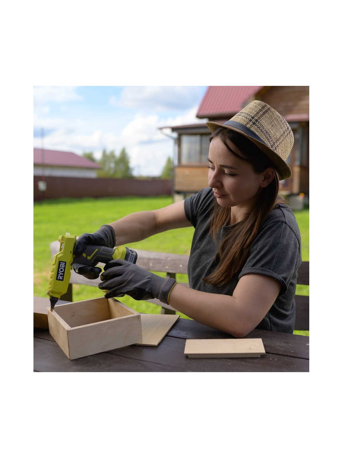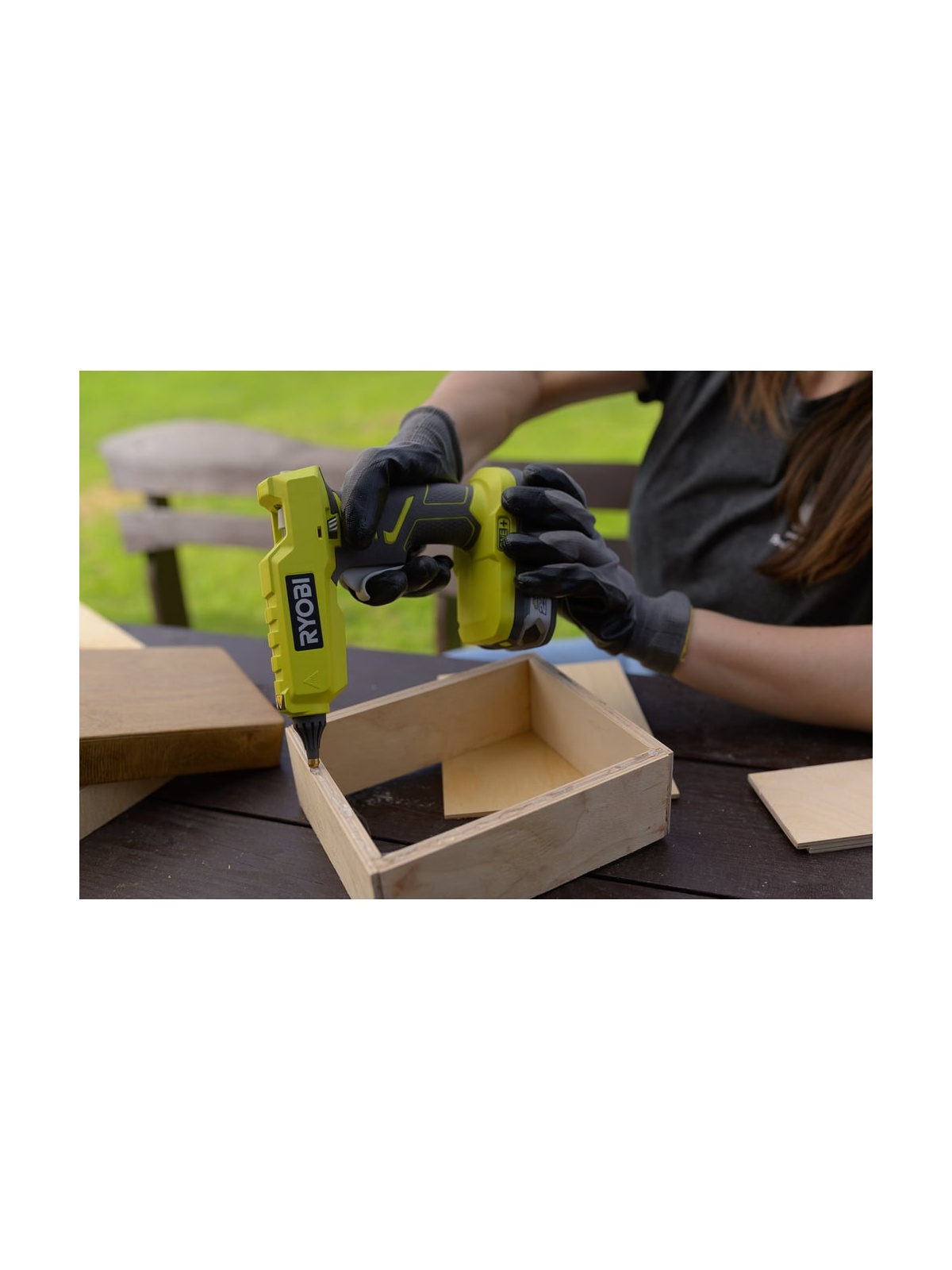 Клеевой пистолет Ryobi ONE+ R18GLU-0 5133002868 может использоваться для склеивания широкого спектра материалов, таких как бумага, картон, ткань, кожа, пластик, дерево, металл, камень или пробка. Двухпальцевая клавиша для улучшения контроля. Время разогрева до рабочего состояния 3 минуты. Совместим с любыми клеевыми стержнями диаметром 11мм. До 60 клеевых стержней на одной зарядке при использовании аккумулятора Lithium+ 5.0Ач RB18L50.