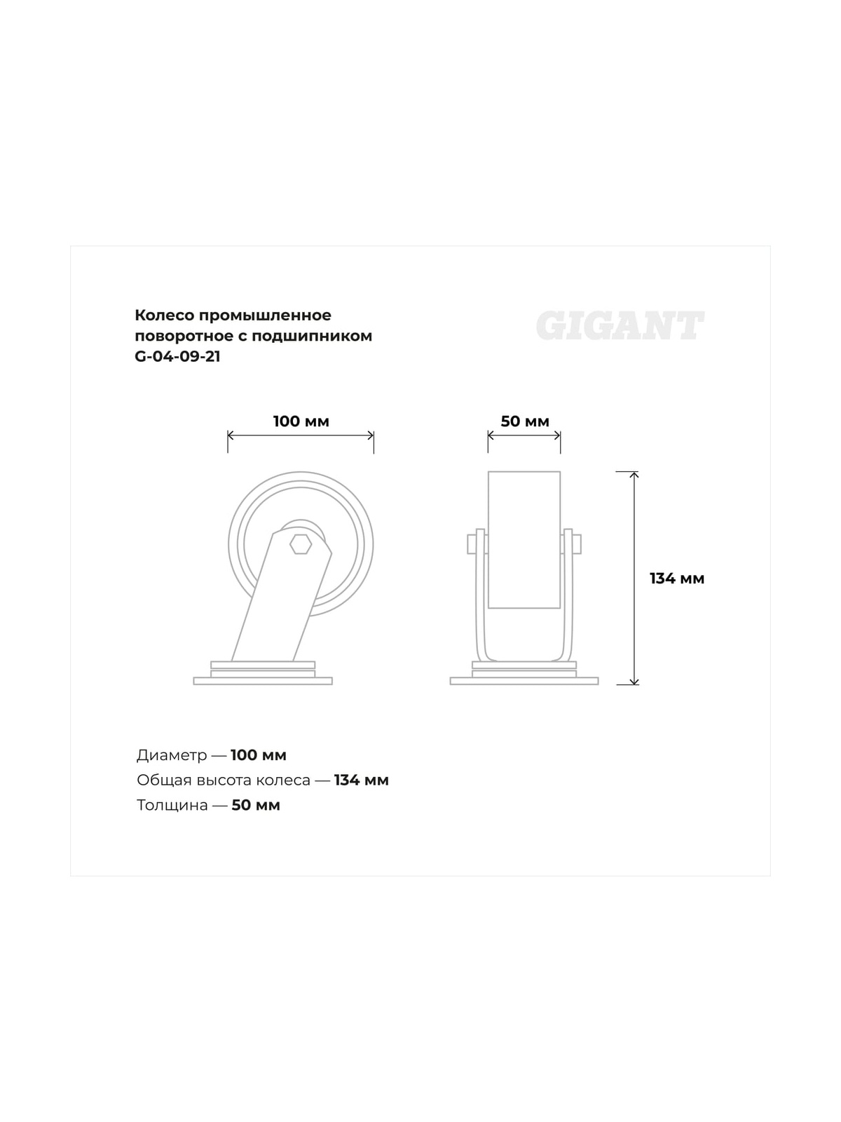 Колесо промышленное поворотное с подшипником 100мм ПУ/чугун Gigant G-04-09-21