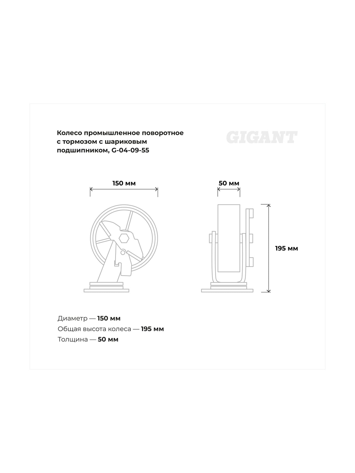 Колесо промышленное поворотное с тормозом с шариковым подшипником ПУ/чугун Gigant G-04-09-55