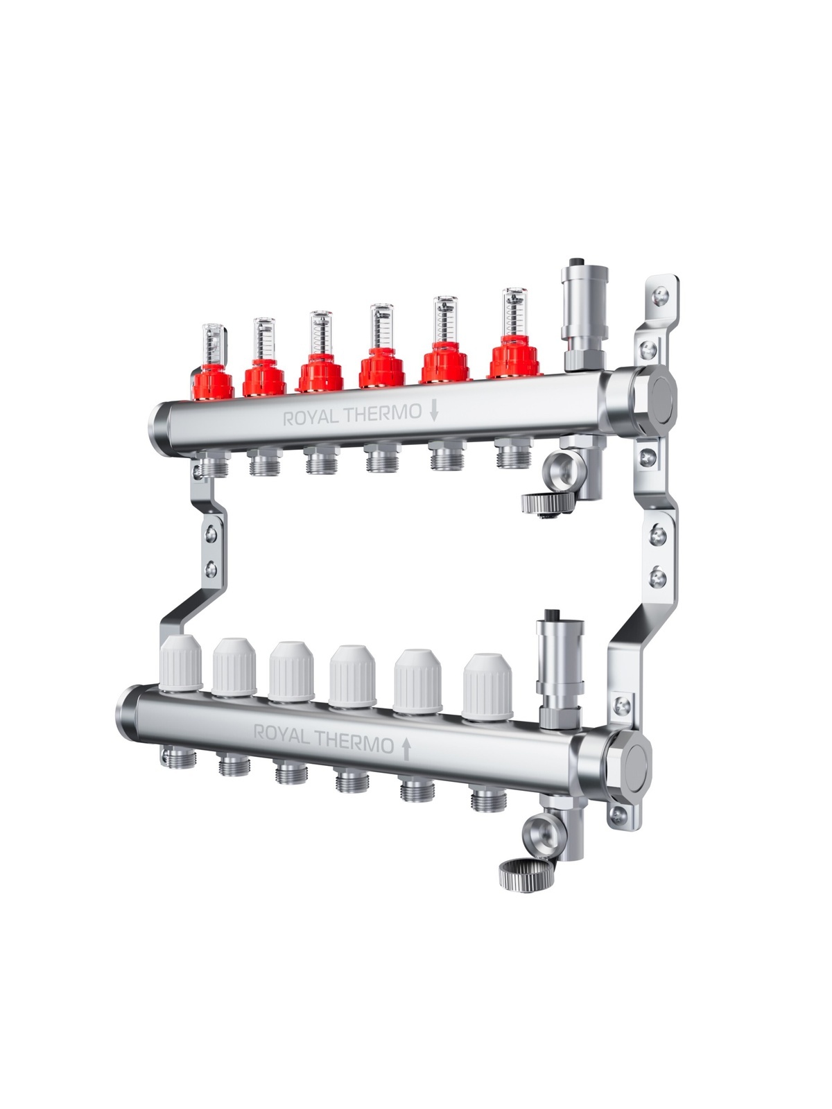 Коллекторы Royal Thermo поступают в сборе и включают подающий и обратный коллекторы, регулировочные вентили с встроенными расходомерами, термостатические вентили с возможностью установки сервопривода, воздухоотводчики и сливные краны и заглушки.