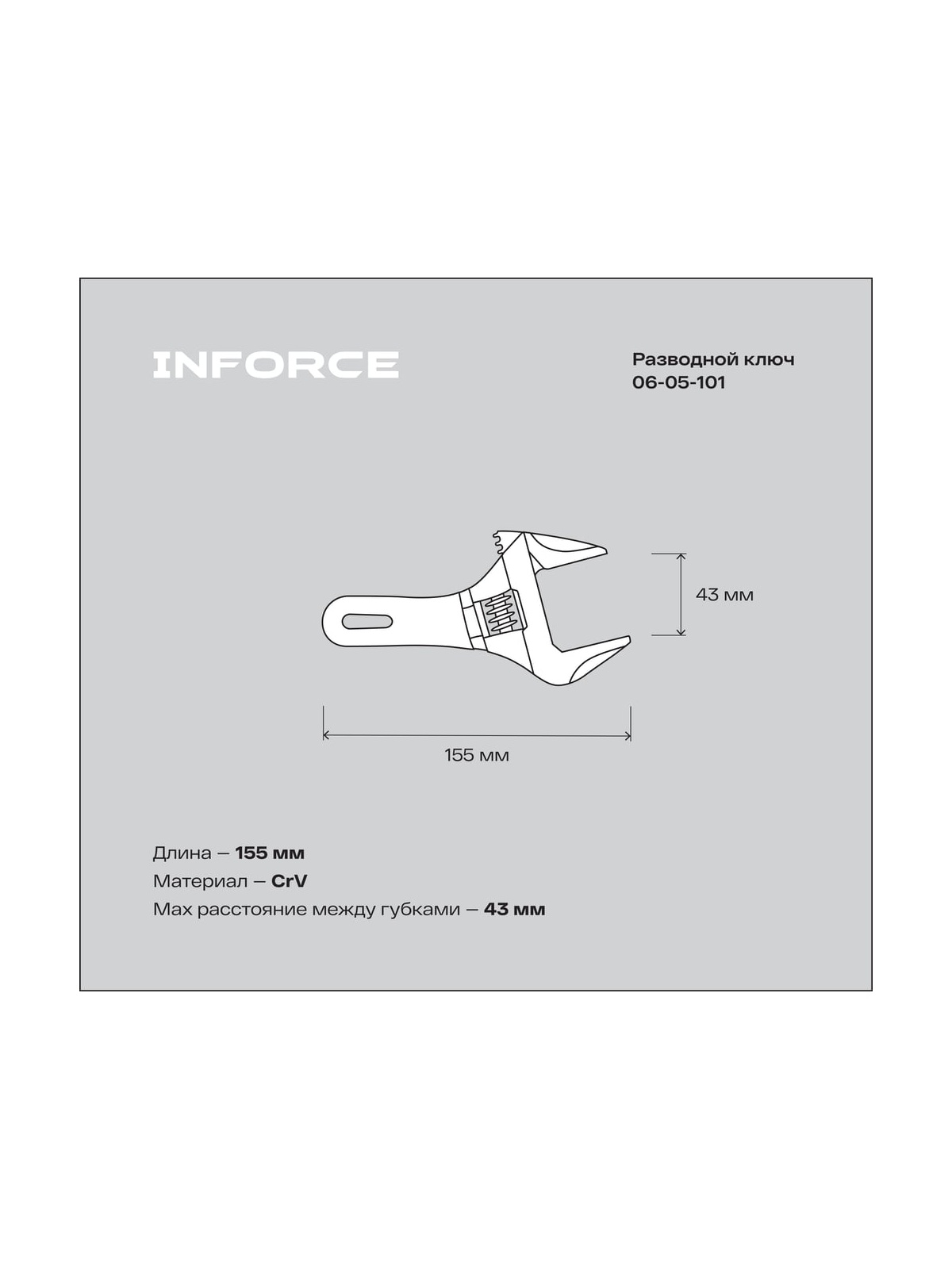 Компактный разводной ключ 155 мм Inforce 06-05-101 используется при выполнении монтажных и демонтажных работ. Рабочая часть инструмента выполнена из хром-ванадиевой стали, поэтому отличается особой прочностью и устойчивостью к коррозии. Ключ оснащен удобной рукояткой, которая не скользит в руке во время работы.