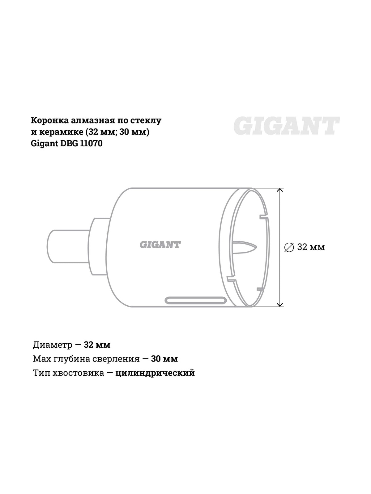 Коронка алмазная Gigant DBG 11070 предназначена для сверления отверстий в стекле и керамике. Изготовлена по современным технологиям и отвечает высоким требованиям специалистов. Максимальная глубина сверления составляет 30 мм, диаметр коронки - 32 мм. Данный товар поставляется взамен модели: Коронка алмазная по стеклу и керамике (32 мм; 30 мм) Inforce 11-01-070. Центрирующее сверло повышает точность сверления отверстий, не позволяя коронке сдвигаться в сторону. Держатель в комплекте. Подходит для мокрого сверления. Продукция представлена профессиональными и бытовыми инструментами, имеет доступную цену и высокое качество. При изготовлении товаров Gigant используется современное оборудование и прочные материалы. Производство осуществляется на современных предприятиях России и Азии. Тестирование товаров осуществляется в два этапа, каждая партия инструментов проходит проверку на соответствие стандартам и заявленным техническим характеристикам. Это является залогом качества и надежности готового продукта. Продукция представлена широкой линейкой инструментов. У нас можно приобрести ручной инструмент, строительный, садовый, сантехнический, климатический, крепежный, автогаражный, а также станки, расходные материалы и многое другое.
