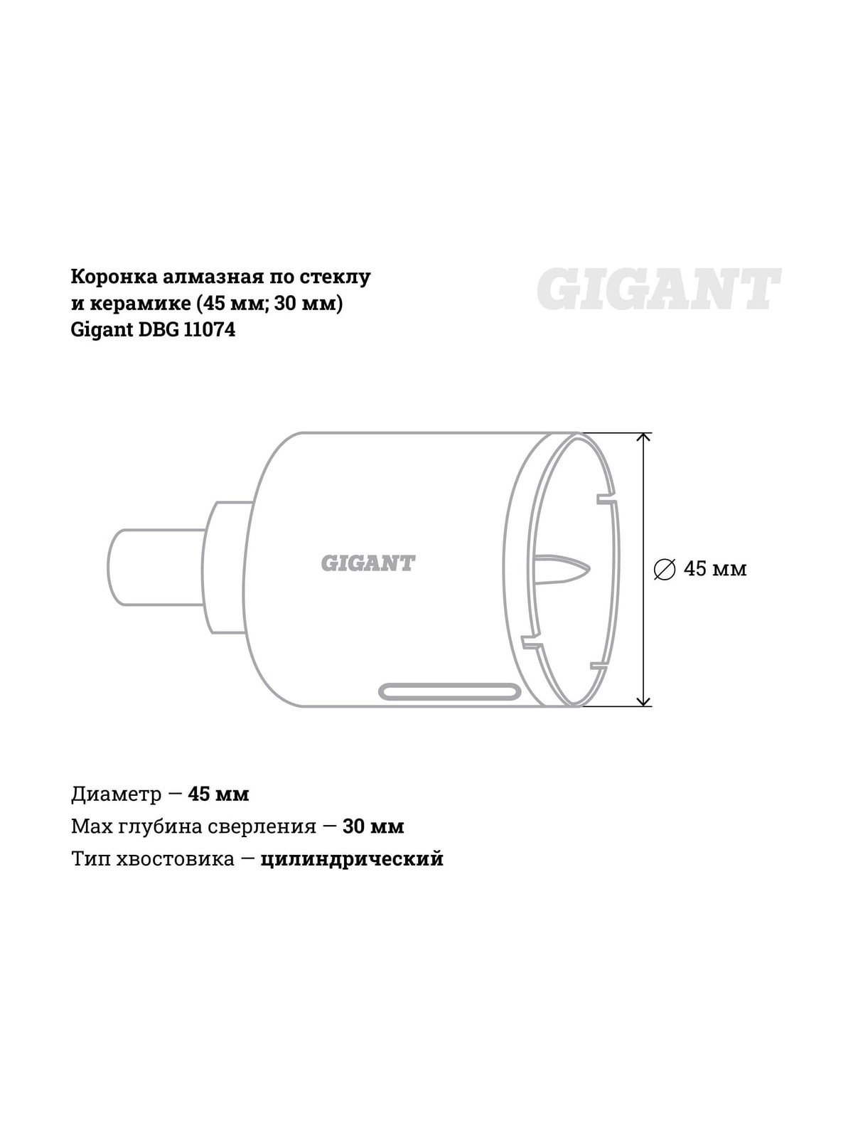 Коронка алмазная Gigant DBG 11074 предназначена для сверления отверстий в стекле и керамике. Изготовлена по современным технологиям и отвечает высоким требованиям специалистов. Центрирующее сверло повышает точность сверления отверстий, не позволяя коронке сдвигаться в сторону. Максимальная глубина сверления составляет 30 мм, диаметр коронки - 45 мм. Внимание, изображение товара может отличаться от реального! Данный товар поставляется взамен Коронка алмазная по стеклу и керамике (45 мм; 30 мм) Inforce 11-01-074. Цилиндрический тип хвостовика. Никелевое напыление - для защиты от коррозии. Подходит для мокрого сверления. Продукция представлена профессиональными и бытовыми инструментами, имеет доступную цену и высокое качество. При изготовлении товаров Gigant используется современное оборудование и прочные материалы. Производство осуществляется на современных предприятиях России и Азии. Тестирование товаров осуществляется в два этапа, каждая партия инструментов проходит проверку на соответствие стандартам и заявленным техническим характеристикам. Это является залогом качества и надежности готового продукта. Продукция представлена широкой линейкой инструментов. У нас можно приобрести ручной инструмент, строительный, садовый, сантехнический, климатический, крепежный, автогаражный, а также станки, расходные материалы и многое другое.