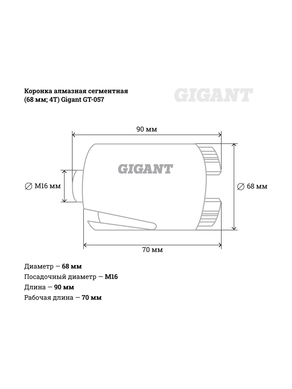 Коронка алмазная сегментная (68 мм; 4T) Gigant GT-057 предназначена для сверления отверстий в бетоне, кирпичной кладке, силикатном кирпиче с помощью перфоратора. Специальные компенсационные отверстия позволяют погасить вибрацию, значительно снижают уровень шума при работе, способствуют быстрому охлаждению инструмента, а также используются для удаления керна.