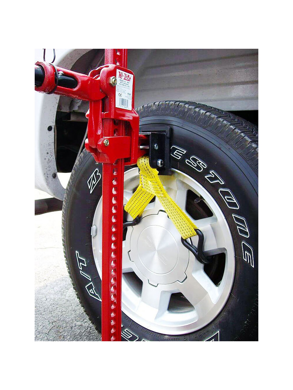 Крюк для реечного домкрата предназначен для подъёма автомобиля за колесо. Устройство надежно фиксируется на колесе, имеет упорную площадку для контакта с боковиной шины и прорезиненные крюки для надежного и безопасного контакта с колесным диском.