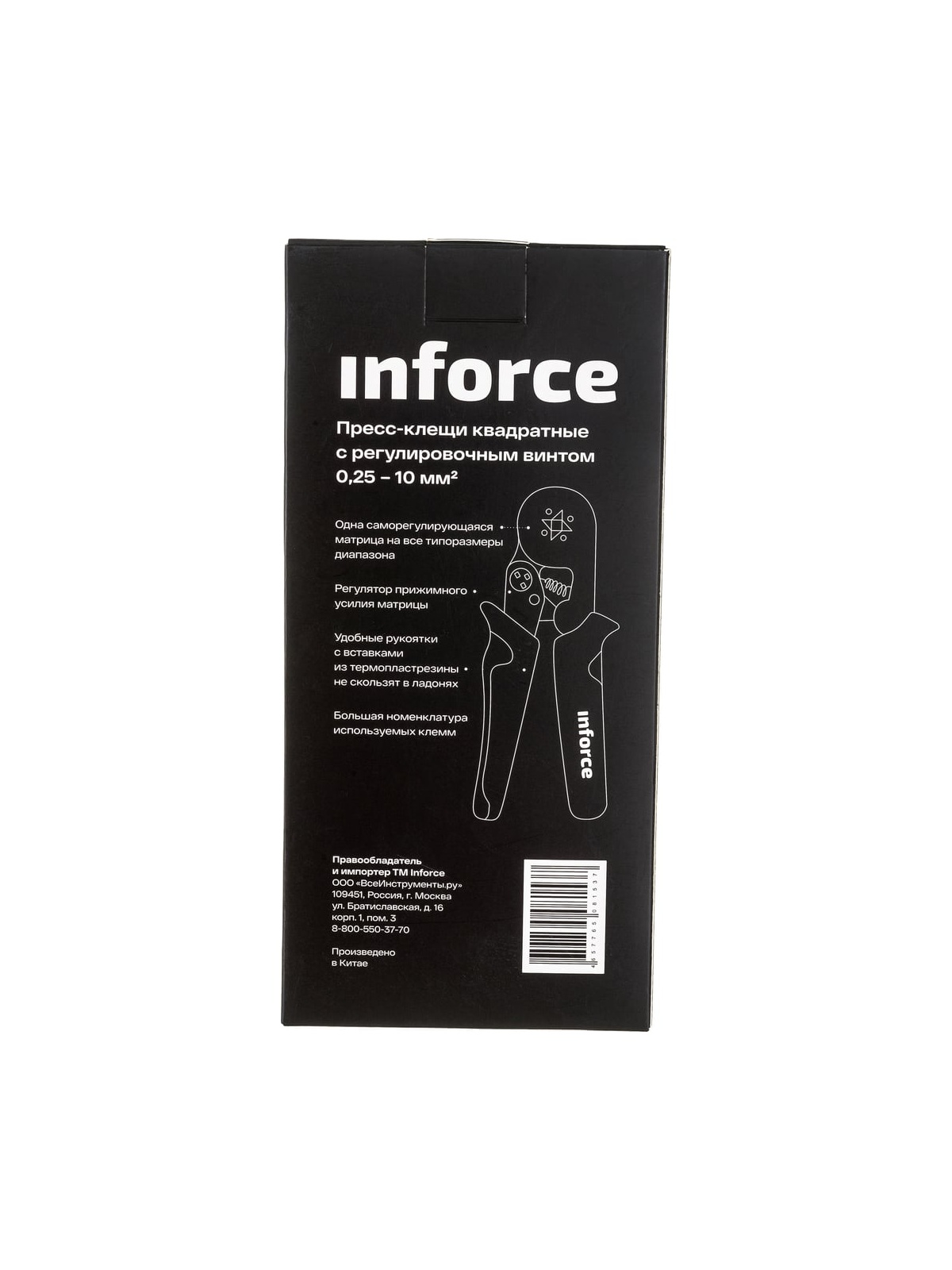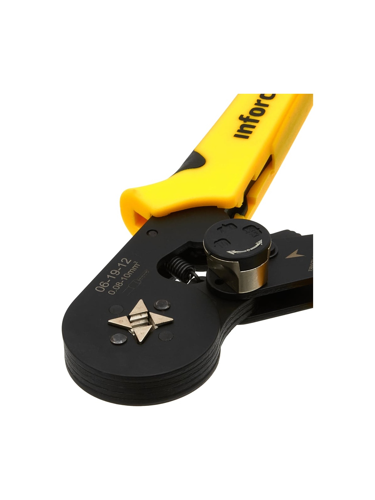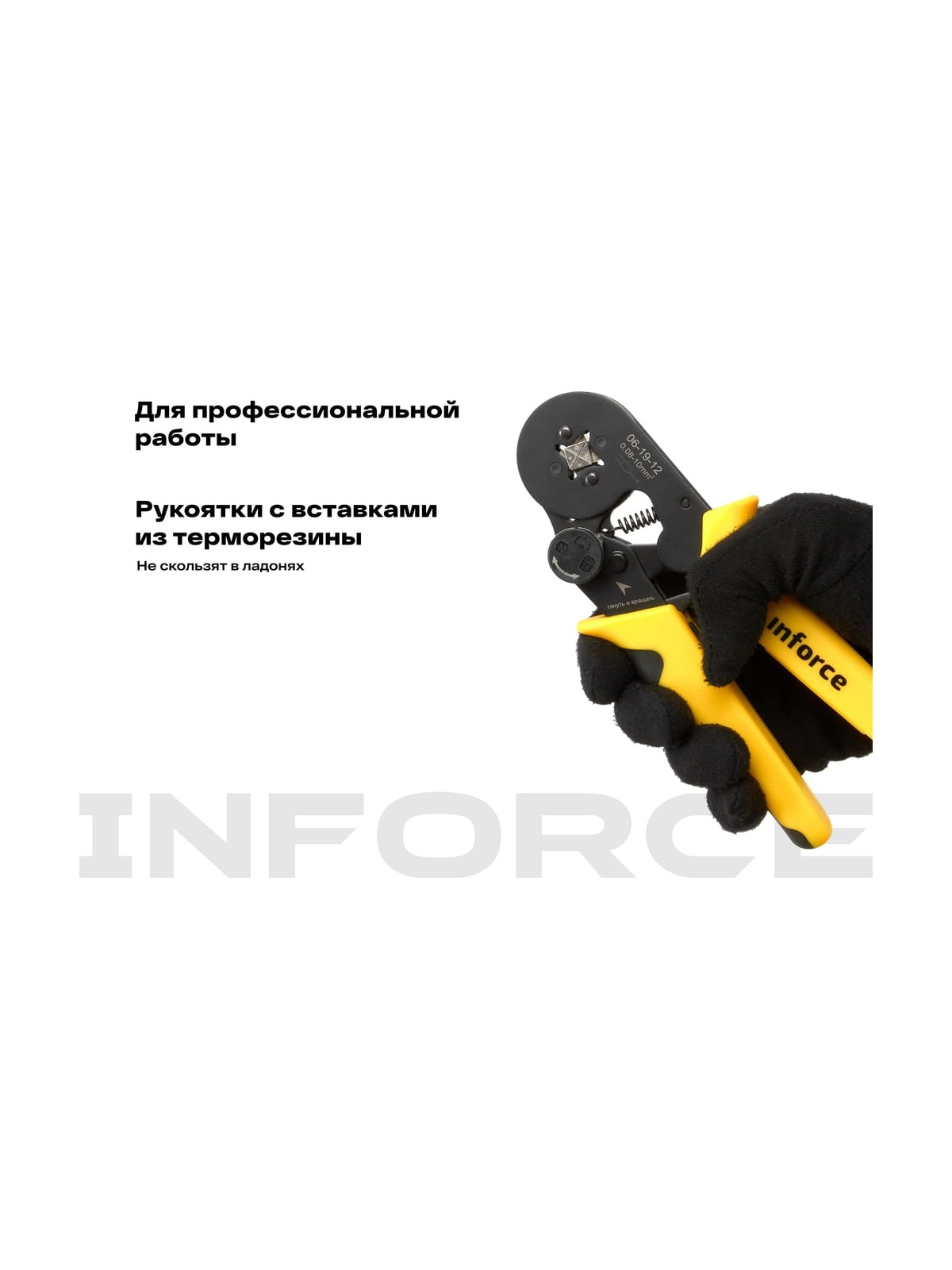 Квадратные пресс-клещи Inforce с регулировочным винтом, 0.08-10 мм2 06-19-12 оснащены саморегулирующейся матрицей. Накладки на рукоятках позволяют снизить нагрузку на запястье и облегчить работу. Предусмотрен винт для экстренной разблокировки. Пресс-клещи предназначены для профессионального использования и имеют повышенный ресурс. Регулятор прижимных усилий позволяет менять степень сжатия матриц либо в сторону увеличения, либо в сторону уменьшения. Храповой механизм Inforce обеспечивает качественный обжим. Одна саморегулирующаяся матрица на все типоразмеры диапазона. Инструмент перекрывает диапазон из 17 размеров втулочных наконечников. Работа с проводами сечением 0,08 – 10 мм².