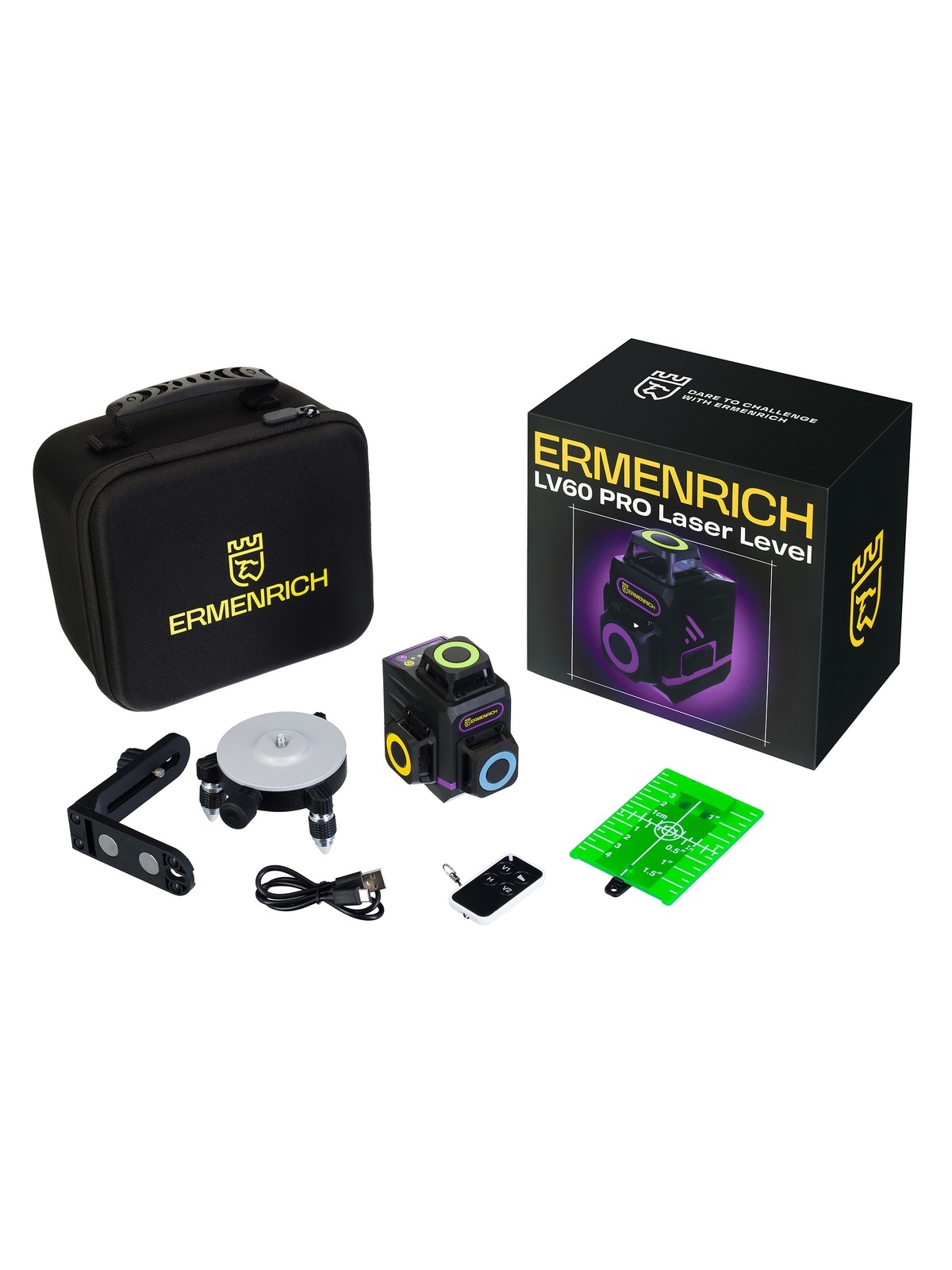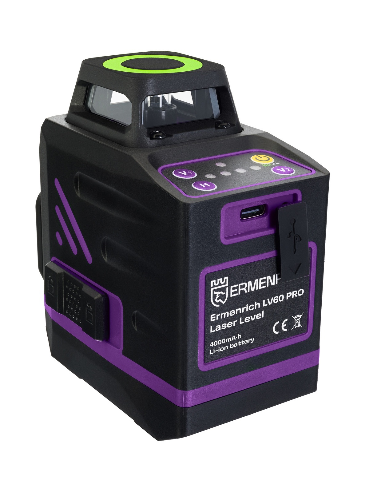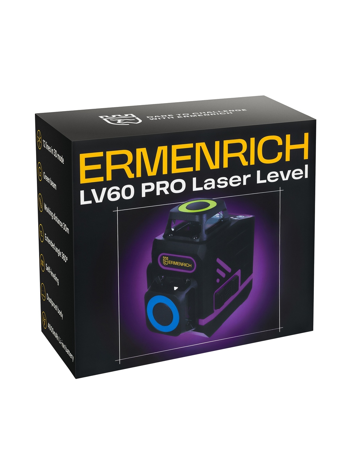 Основное преимущество портативного лазерного уровня Ermenrich PRO LV60 – невероятно компактный размер и маленький вес. Он не обременяет в дороге, легко транспортируется в рабочей сумке, может уместиться даже на ладони. Габариты прибора: 7х7х9,5 см. Вес: 340 грамм. Лазерный уровень работает в трех проекциях, формируя 12 линий зеленого цвета. Это отличный инструмент для строителя, монтажника, мастера по гипсокартонным и другим отделочным работам.