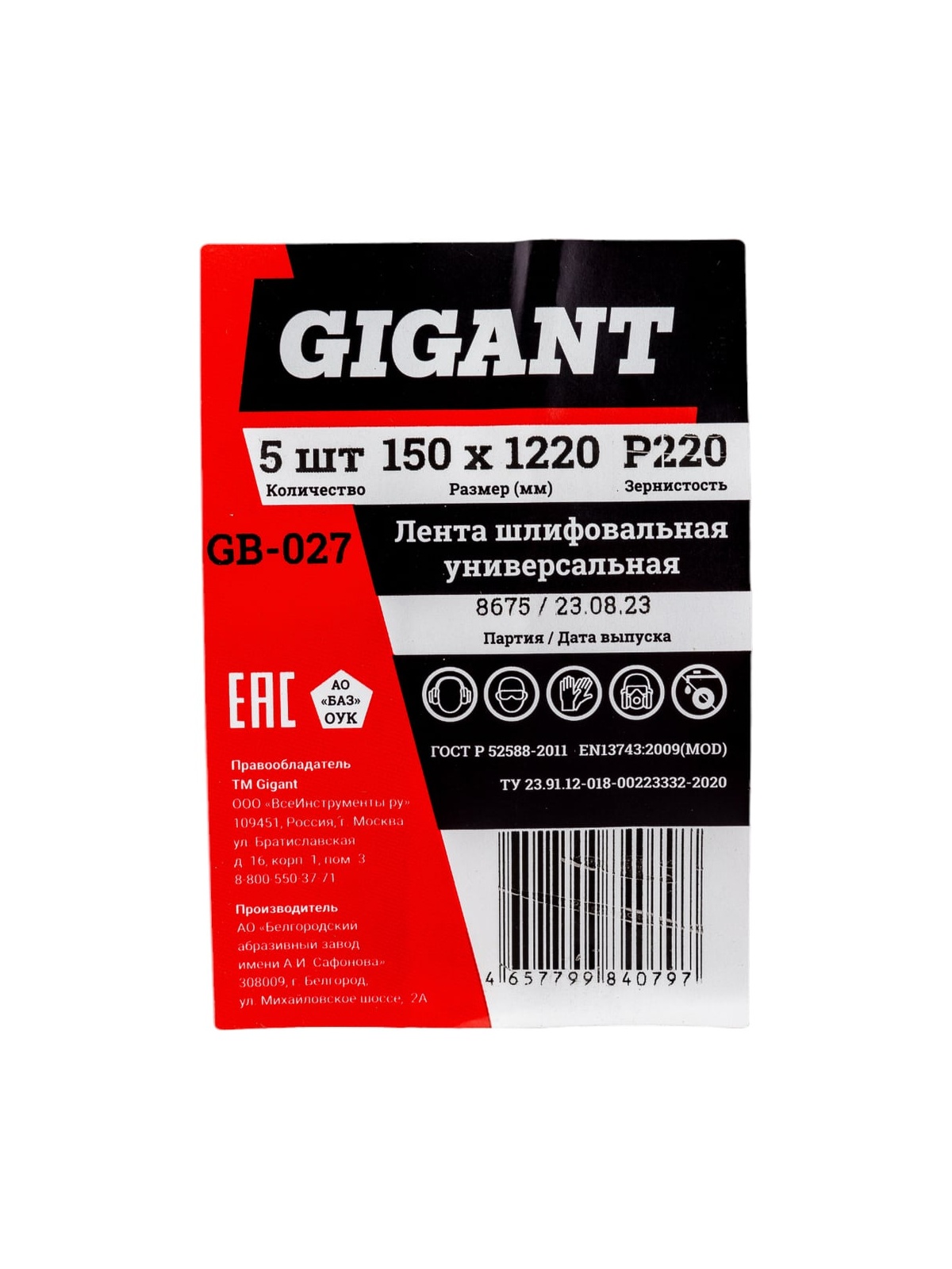 Лента шлифовальная 150x1220 мм, P220, 5 шт Gigant GB-027