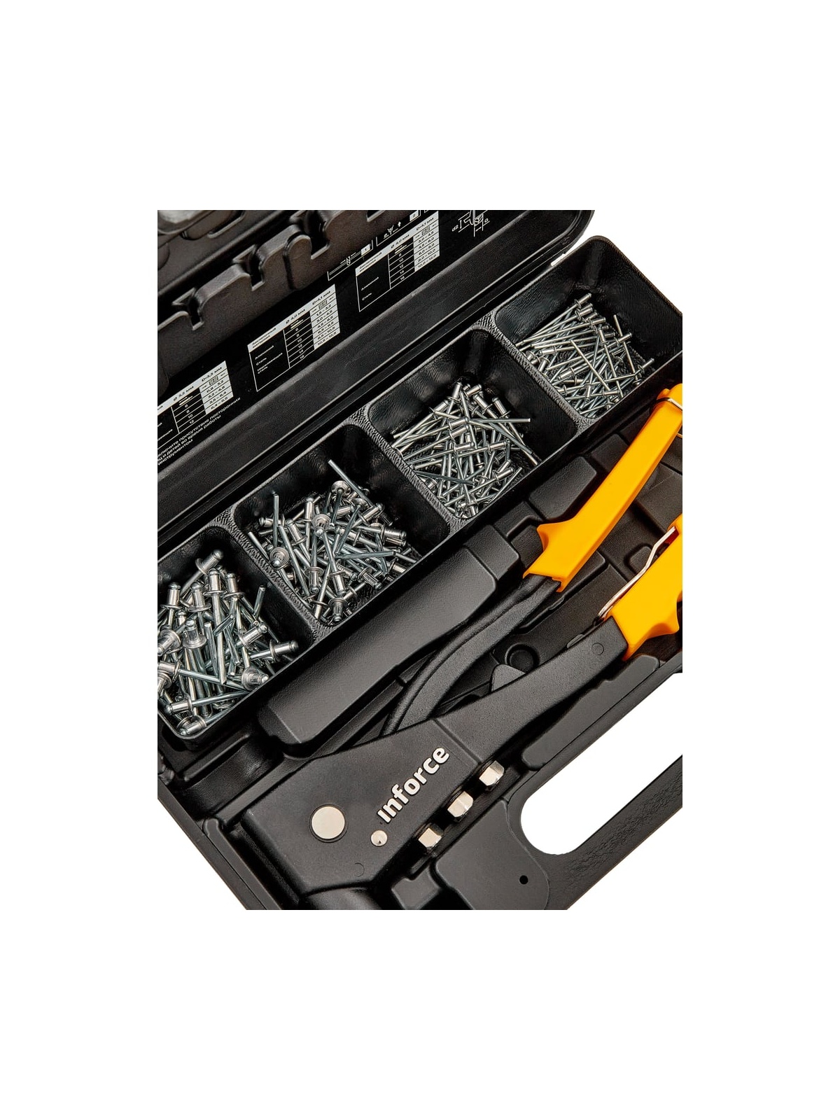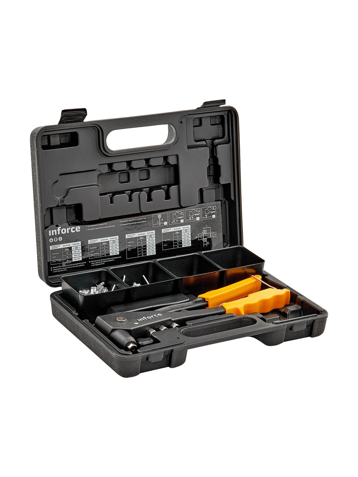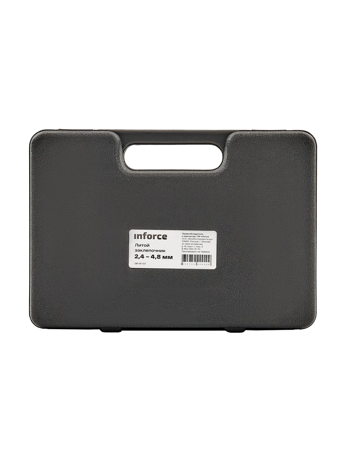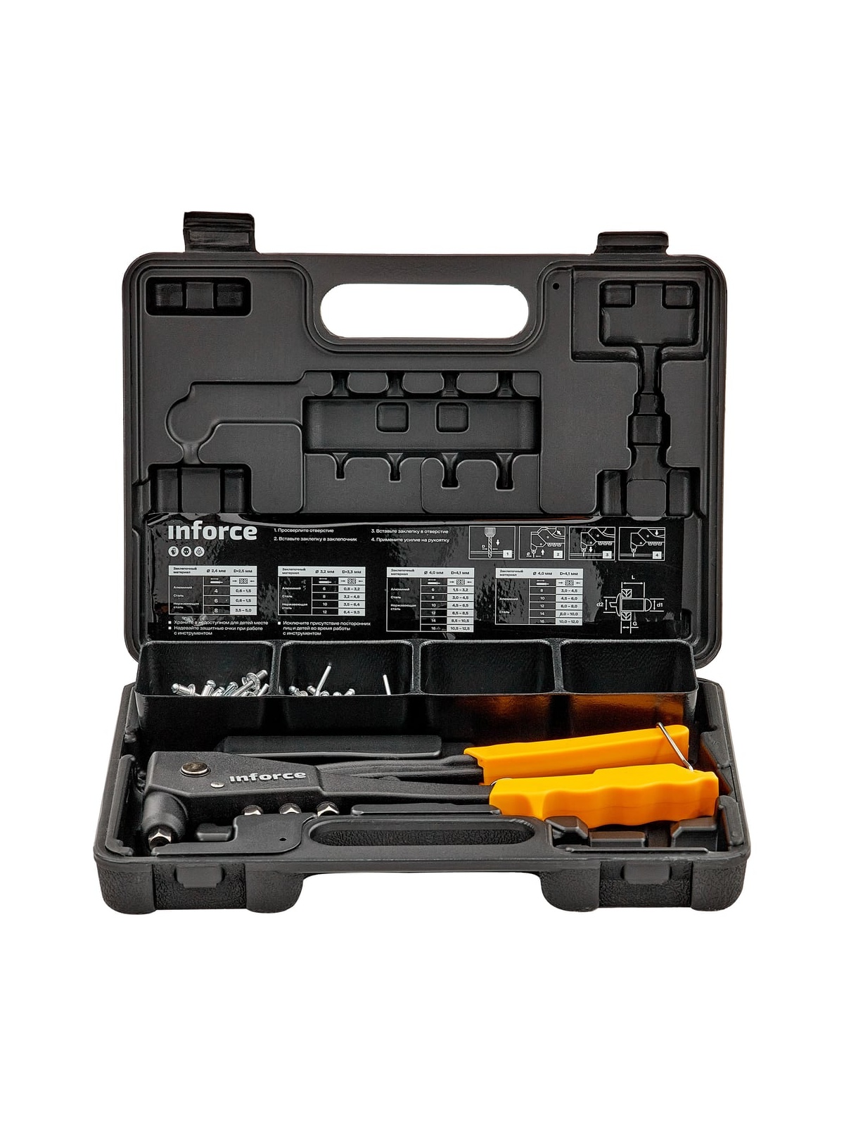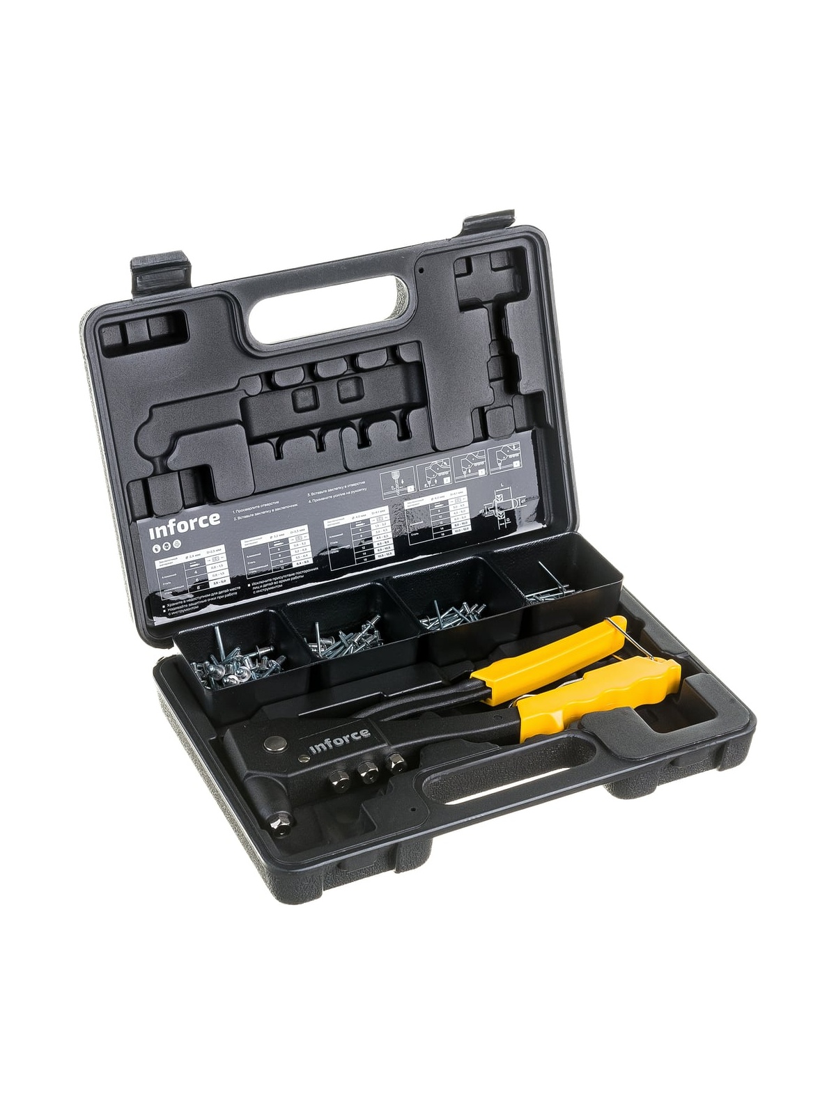 Литой ручной заклепочник Inforce в кейсе, с набором заклепок 2.4-4.8 мм 06-14-101 позволяет быстро и без особых усилий соединить между собой несколько слоев листового материала или закрепить его на жесткой основе. Удобные рукоятки облегчают эксплуатацию и исключают приложение больших усилий.