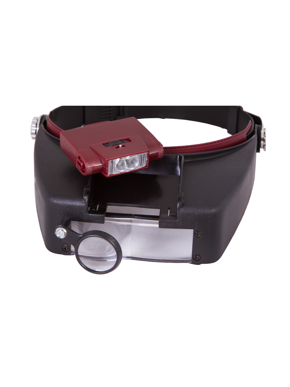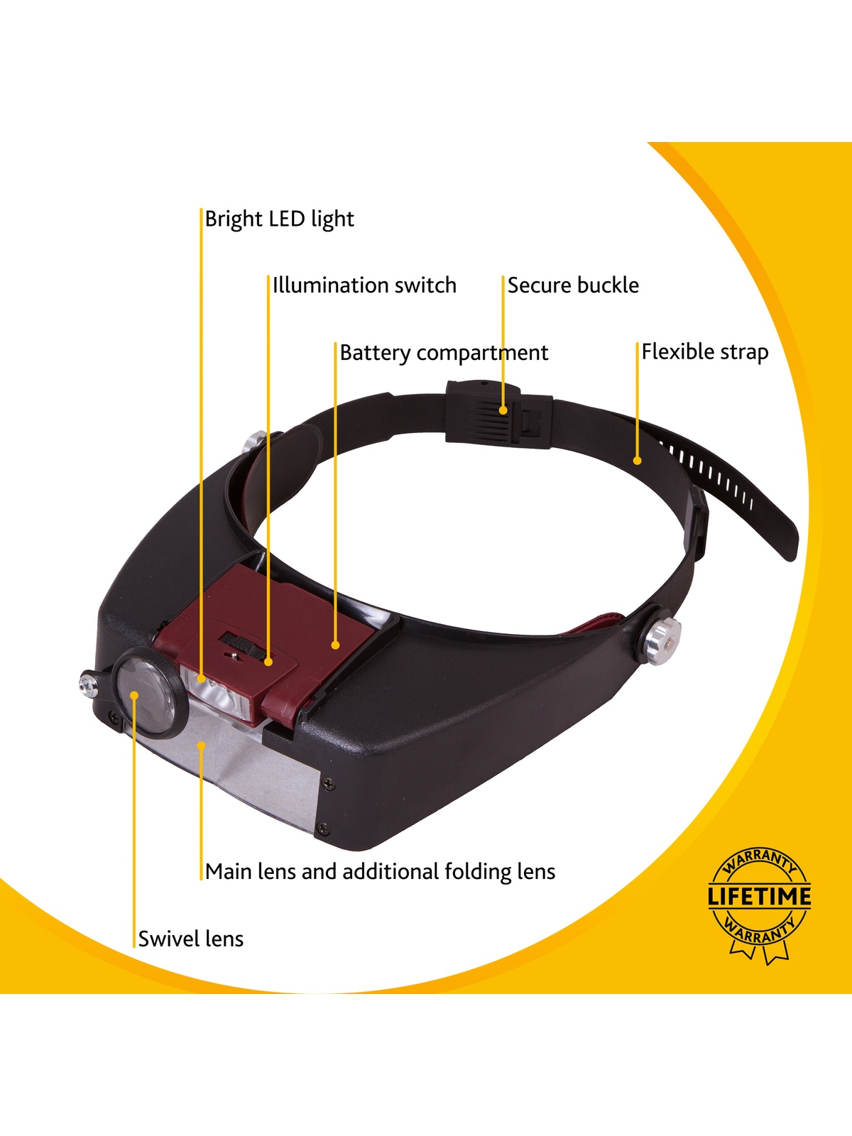 Лупа Levenhuk Zeno Vizor H2 – это налобная лупа для проведения точных работ с мелкими деталями или предметами. Ее можно использовать в профессиональных целях или для выполнения домашних дел. Лупа удобно фиксируется на голове при помощи гибкого ремня и позволяет выбирать одно из четырех фиксированных увеличений в диапазоне от 1,5х до 8х. Смена кратности происходит путем замены основной линзы. Для правого глаза есть отдельная поворотная линза.