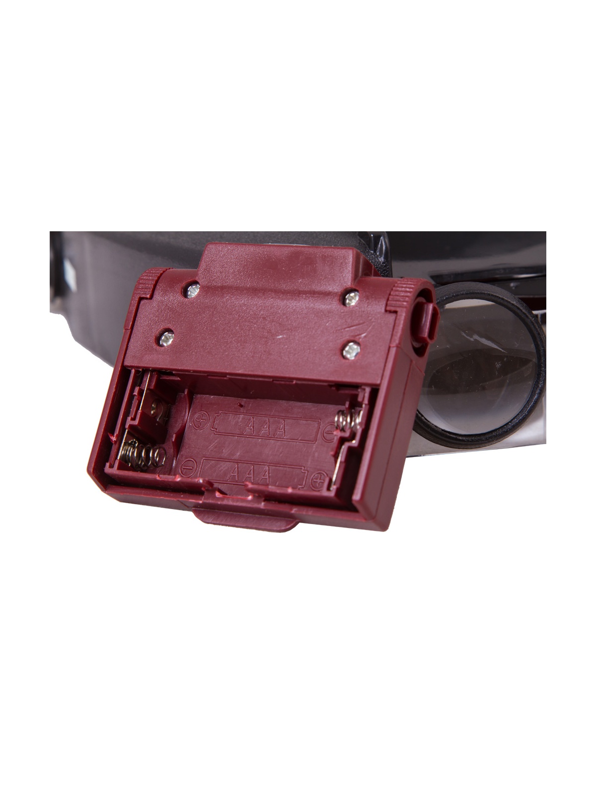 Лупа Levenhuk Zeno Vizor H2 имеет встроенную подсветку. Ее удобно включать и выключать тумблером на корпусе. Яркости светодиодов вполне хватит для работы при плохом освещении или даже в условиях его полного отсутствия. Для работы подсветки требуются батарейки (в комплект не входят).
