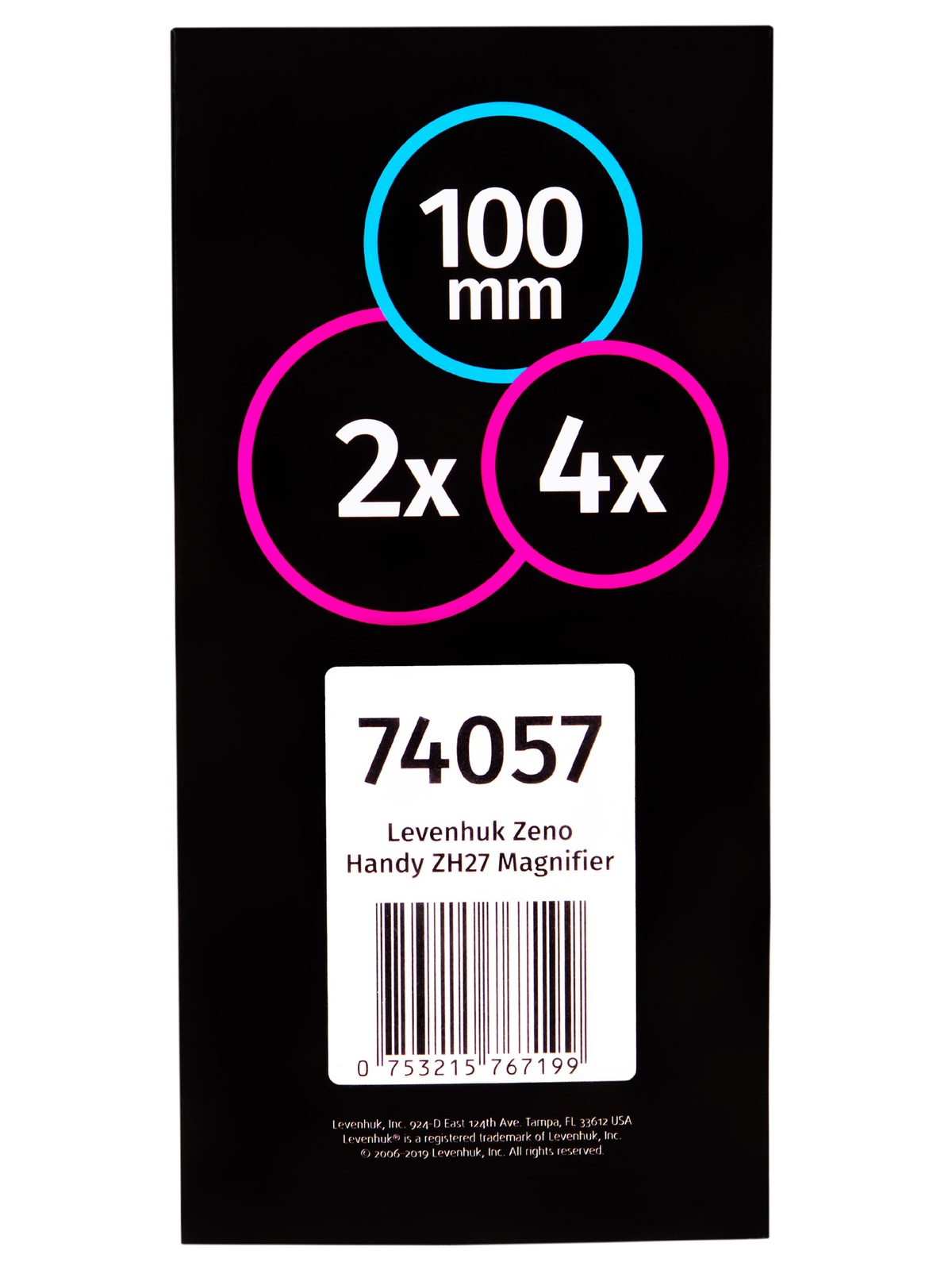 Ручная лупа Levenhuk Zeno Handy ZH27 – оптический прибор с бифокальной линзой. Ее основная особенность – два увеличения (2 и 4 крата). Меньшее доступно по всей площади основной линзы (100 мм), большее – только на области диаметром 20 мм. Лупа хорошо подходит и для рассматривания фотографий, и для чтения мелкого текста, и для изучения мелких объектов на разном увеличении.