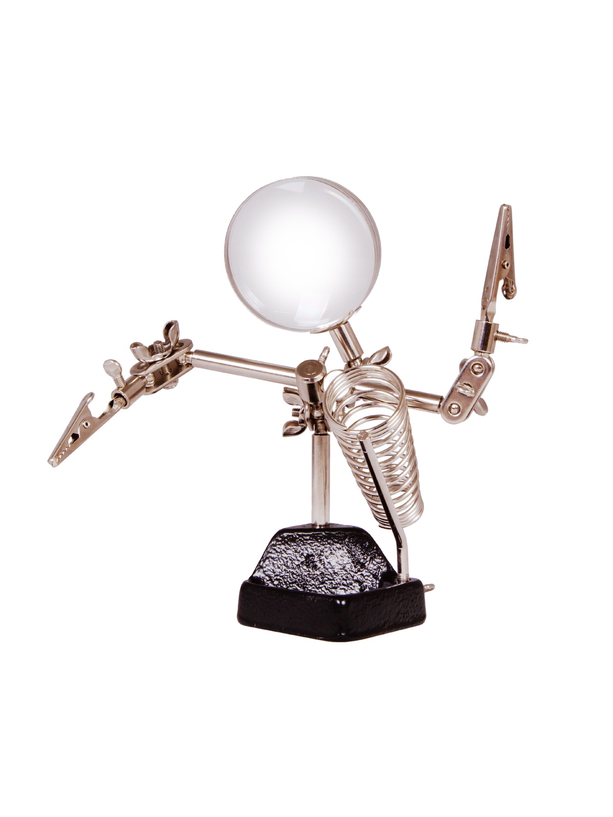 Линза штативной лупы Levenhuk Zeno Refit ZF11 дает 4-кратное увеличение. Она выполнена из оптического пластика, а оправа и корпус – из металла. Еще одно преимущество лупы – возможность перемещать линзу по горизонтали и наклонять под разными углами. В конструкции предусмотрен отдельный держатель для паяльника. В устойчивом основании лупы расположен лоток для размещения мелких деталей и инструментов.