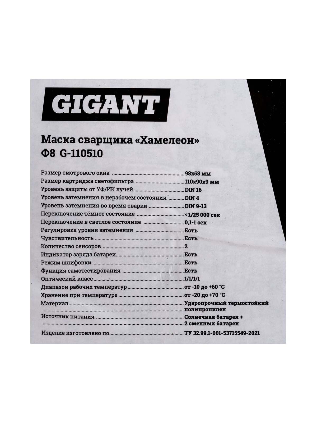 Маска сварщика Хамелеон Ф8-СБ Gigant G-110510 применяется для защиты лица и глаз от расплавленного металла и искр, а также от вредного воздействия инфракрасного и ультрафиолетового излучения во время проведения сварочных работ. Диапазон регулировки охвата головы - 50-60 см. Корпус сварочной маски имеет удобную обтекаемую форму, что обеспечивает постоянную защиту и комфорт всем областям головы и шеи. Данная модель комплектуется профессиональным и эргономичным оголовьем, которое регулируется в шести положениях и позволяет распределять вес маски по всей голове, что снижает нагрузку и повышает удобство во время длительных сварочных работ. Подходит для следующих типов сварки: MMA, MIG/MAG, TIG, CUT. Продукция представлена профессиональными и бытовыми инструментами, имеет доступную цену и высокое качество. При изготовлении товаров Gigant используется современное оборудование и прочные материалы. Производство осуществляется на современных предприятиях России и Азии. Тестирование товаров осуществляется в два этапа, каждая партия инструментов проходит проверку на соответствие стандартам и заявленным техническим характеристикам. Это является залогом качества и надежности готового продукта. Продукция представлена широкой линейкой инструментов. У нас можно приобрести ручной инструмент, строительный, садовый, сантехнический, климатический, крепежный, автогаражный, а также станки, расходные материалы и многое другое.