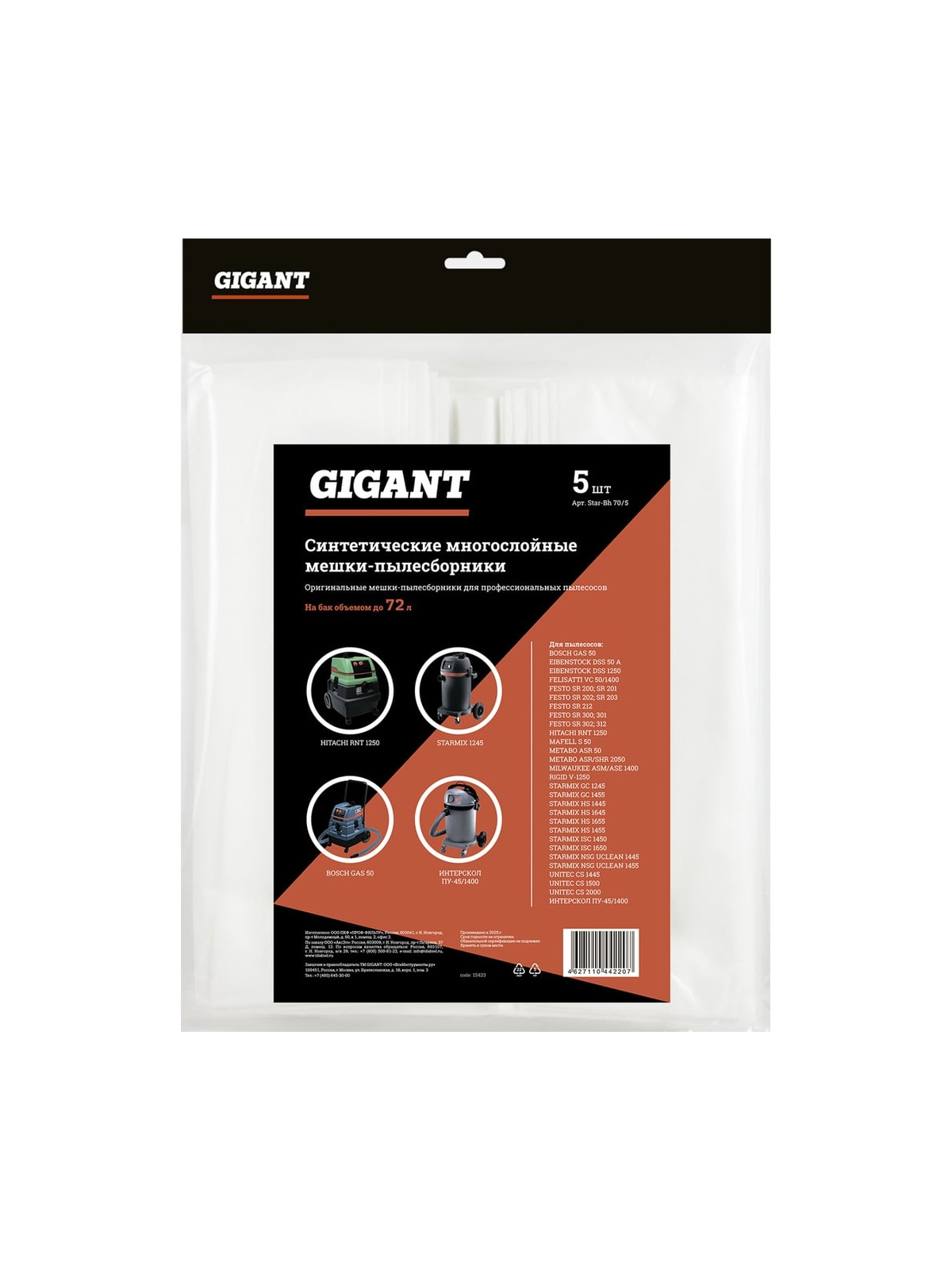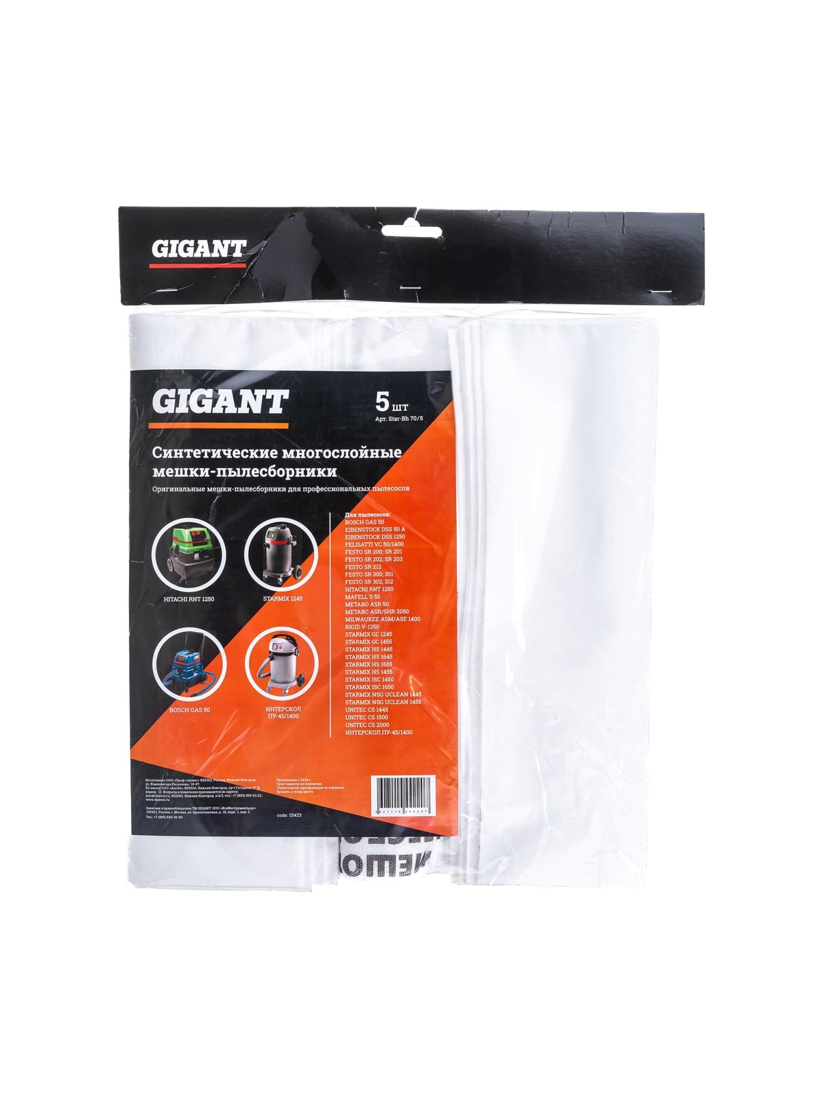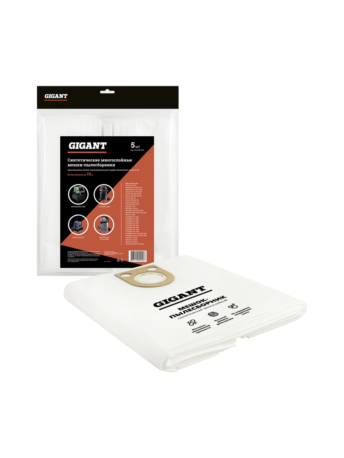 Мешки Gigant Star-Bh 70/5 изготовлены из синтетического материала, обладающего большей механической прочностью, по сравнению с бумажными пылесборниками. Не теряют фильтрующих качеств даже при работе с влажным мусором. При использовании данных пылесборников двигатель пылесоса работает без перегрузок. В комплекте 5 штук. Мешки используются в качестве расходного материла в профессиональных пылесосах: BOSCH GAS 50 EIBENSTOCK DSS 50 A,DSS 1250 FELISATTI VC 50/1400 FESTO SR 200; SR 201,SR 202; SR 203,SR 212,SR 300; SR 301,SR 302; SR 312 HITACHI RNT 1250 MAFELL S 50 METABO ASR 50,ASR/SHR 2050 MILWAUKEE ASM/ASE 1400 RIDGID V-1250 STARMIX GC 1245,GC 1455,HS 1445,HS 1645,HS 1655,HS 1455,ISC 1450,ISC 1650,NSG UNCLEAN 1445,NSG UNCLEAN 1455 UNITEC CS 1445,CS 1500,CS 2000 ИНТЕРСКОЛ ПУ-45/1400