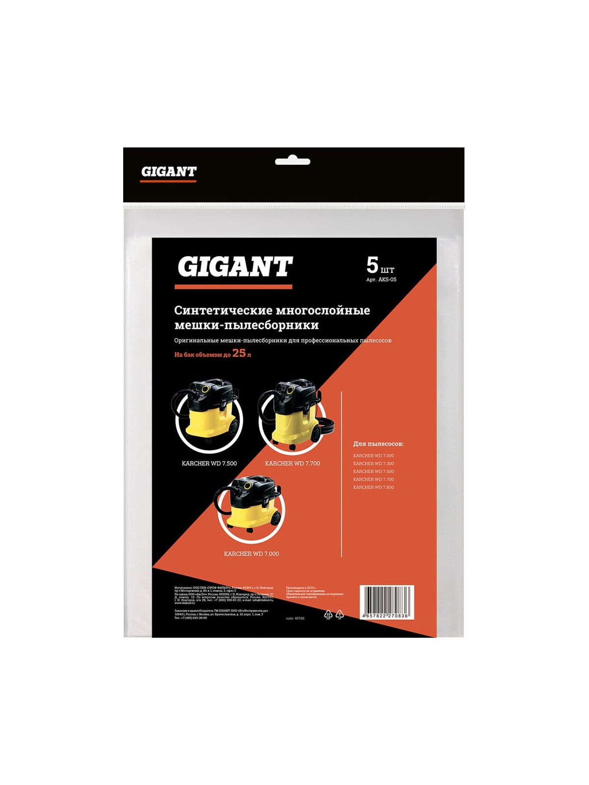 Мешок-пылесборник синтетический трехслойный до 30л, 5 шт Gigant AKS-05 подходит для строительных и промышленных пылесосов. Выполнен из трехслойного нетканого синтетического волокна MicroFib, что обеспечивает тонкую фильтрацию воздуха от мельчайшей пыли. Пылесборник не боится влаги и острых предметов за счет своей высокой прочности.