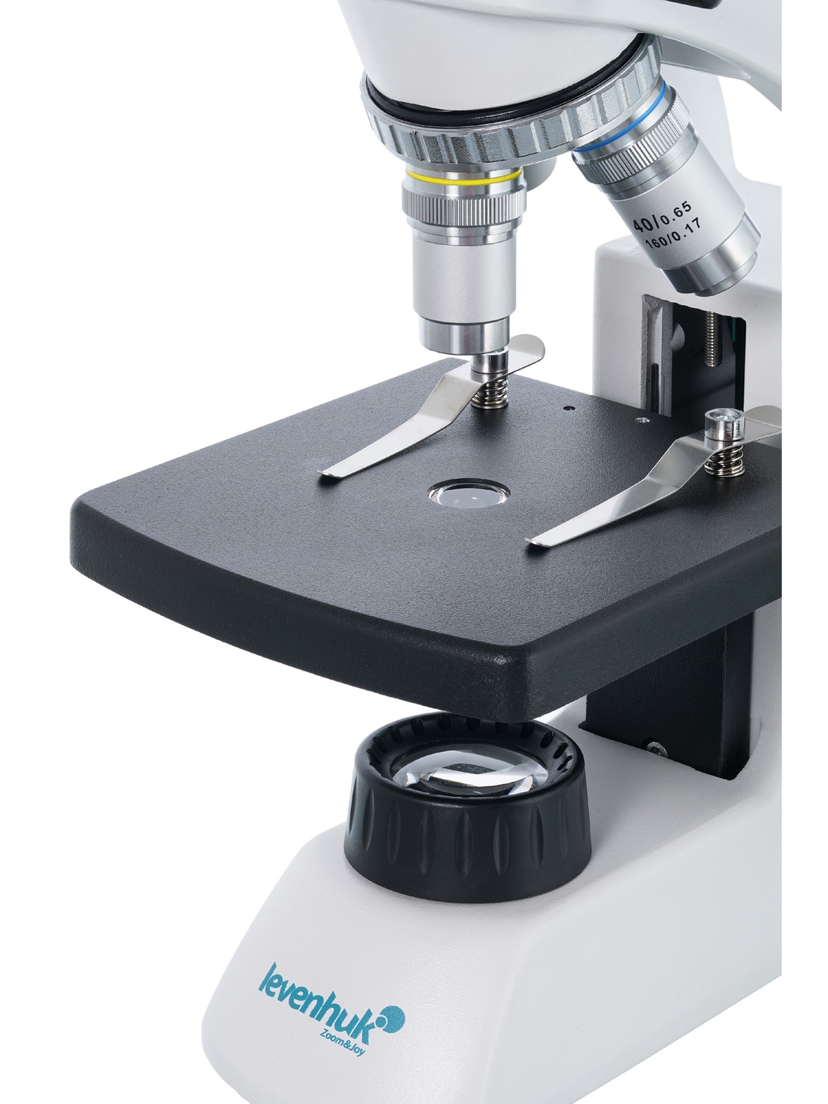 Предметный столик снабжен двумя зажимами для микропрепаратов. Рядом со столиком расположен коаксиальный механизм фокусировки – ручки грубой и точной настройки. Подсветка находится внизу: она состоит из галогенной лампочки и коллектора. Есть настройка яркости. Дополнительно освещенность можно регулировать при помощи конденсора с ирисовой диафрагмой. Для светофильтров предусмотрен специальный держатель.
