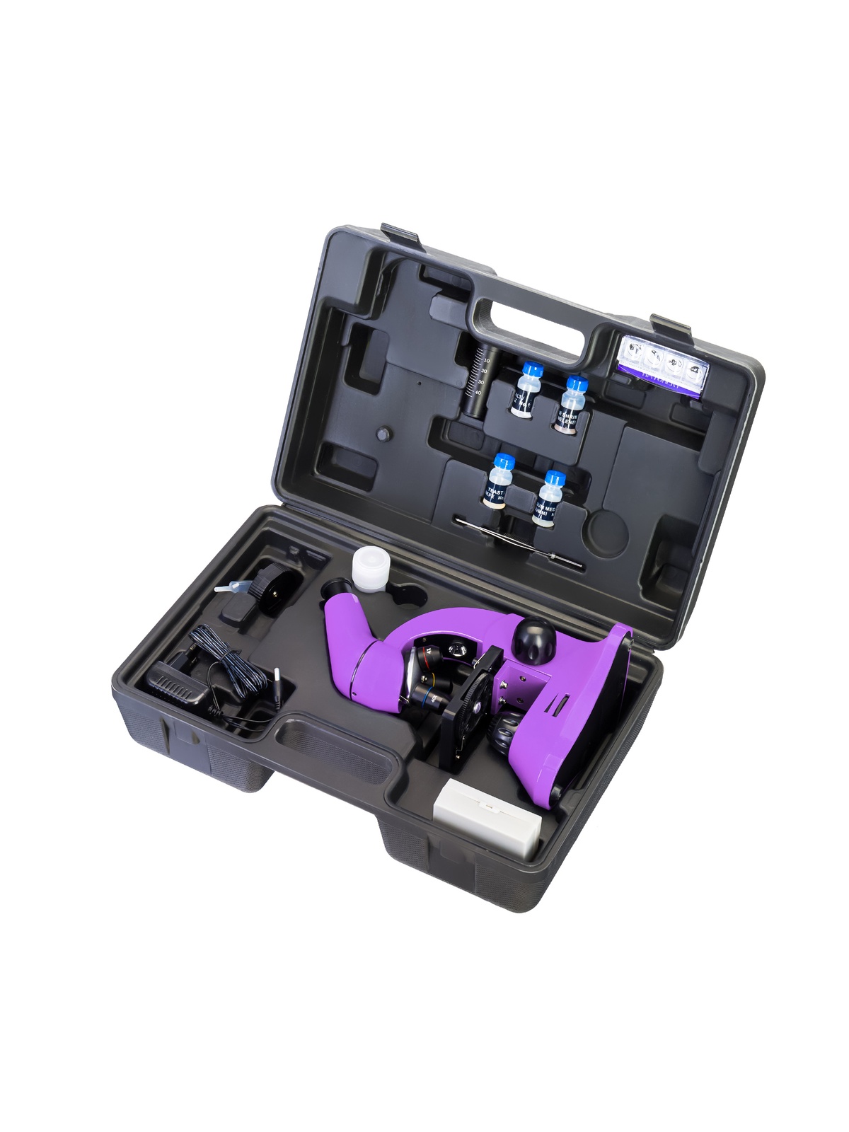 Микроскоп поставляется в прочном пластиковом кейсе, который надежно защищает прибор от пыли и механических повреждений.