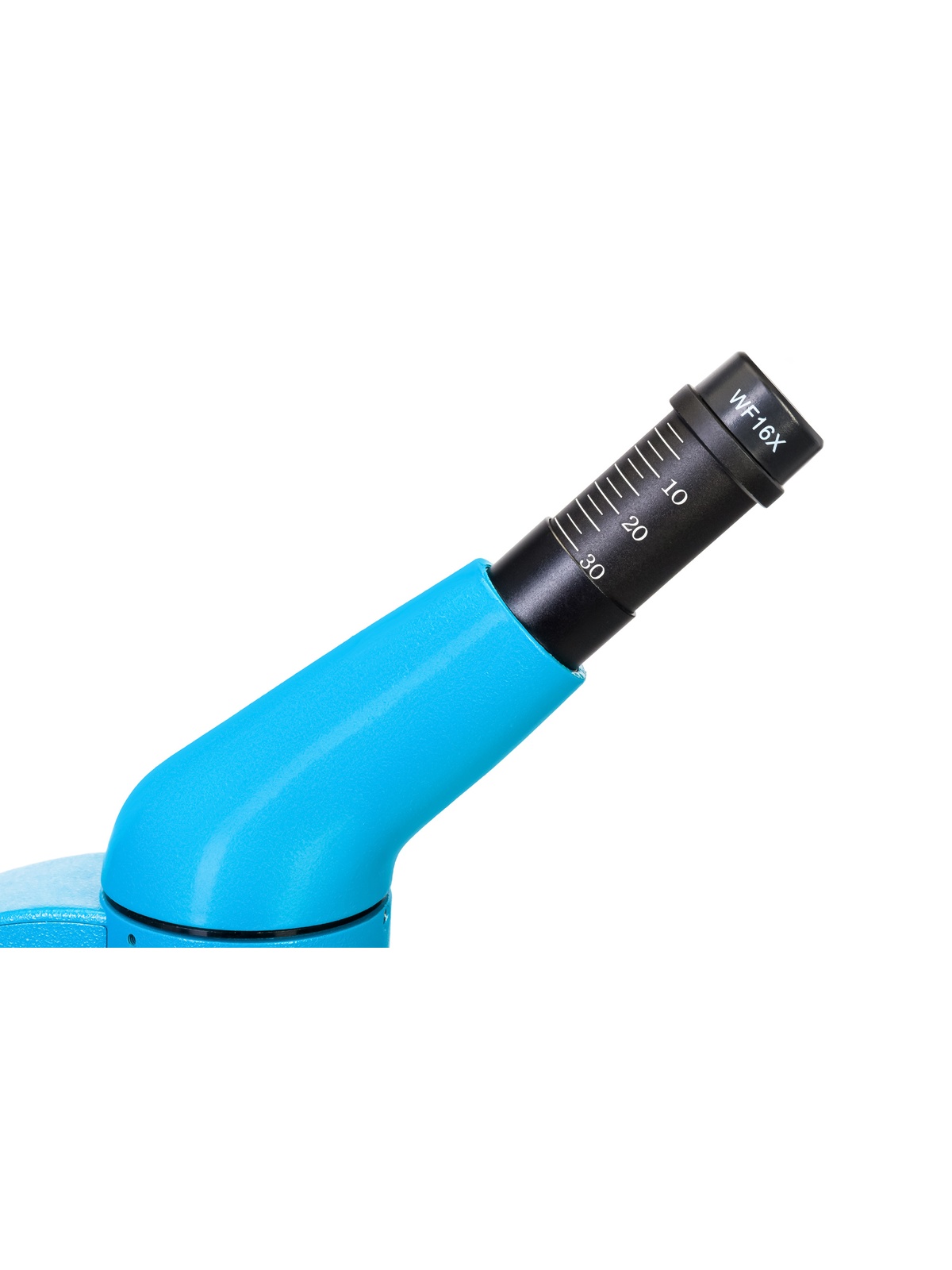Корпус изготовлен из металла – микроскоп отличается высокой прочностью и прекрасно подходит для частого использования. Для комфортной работы окулярная насадка наклонена под углом 45°. Кроме того, насадка вращается на 360° вокруг оси – при групповых занятиях поверните ее в нужную сторону, не перемещая сам микроскоп.