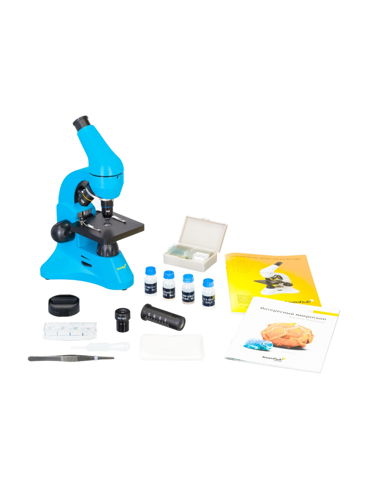 В комплект входит набор для опытов LevenhukK50, в котором есть готовые препараты, инструменты для изготовления собственных образцов и подробное руководство с полезной информацией о работе микроскопа и описанием экспериментов.