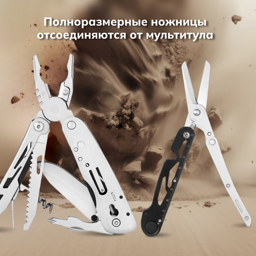 Ножницы вместе с сантиметровой линейкой отделяются от мультитула и становятся самостоятельным инструментом. Для изготовления клинка с прямым лезвием применена сталь 5CR13. Благодаря этому твердость клинка находится в значении 57 HRC. Сталь дополнительно легирована молибденом, хромом и ванадием. Благодаря этим элементам нож долго держит остроту режущей кромки, легко поддается заточке и сохраняет хорошие коррозионностойкие свойства. Корпус мультитула и вспомогательные инструменты изготовлены из нержавеющей стали. Сплав отлично справляется с преждевременным возникновением коррозии.