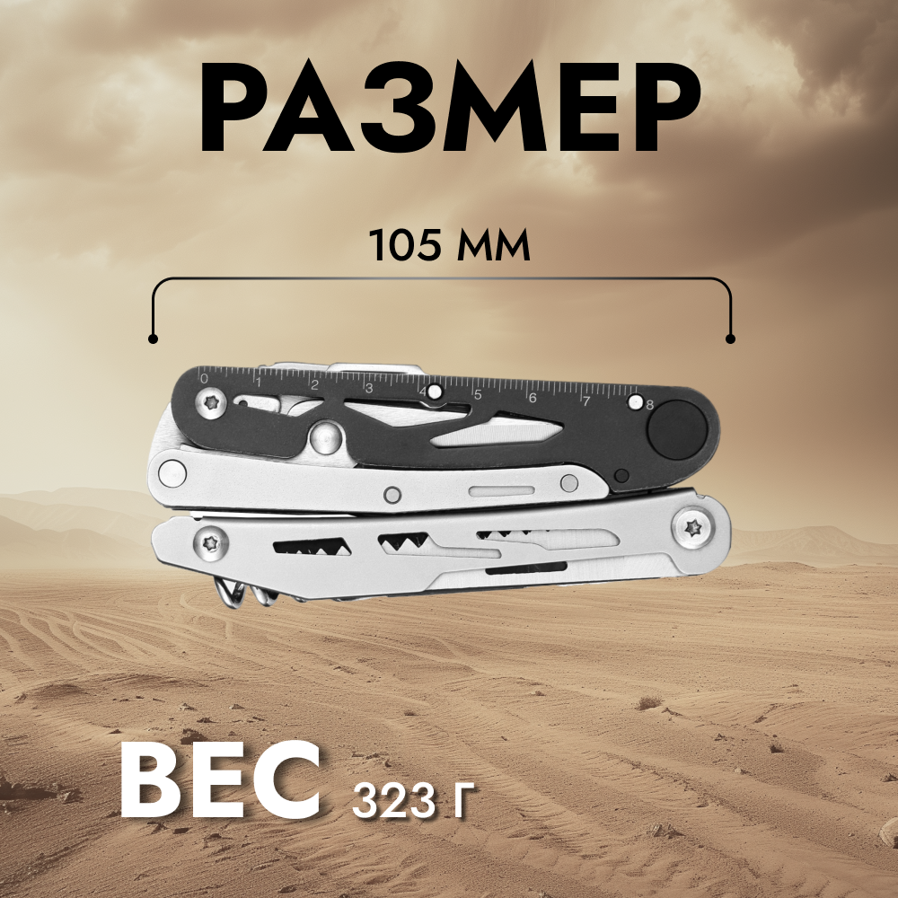 Ручки мультитула имеют знакомый всем “скелетонизированный” дизайн. Небольшие отверстия в рукоятке облегчают инструмент, поэтому мультитул весит всего 323 грамма. Для раскрытия любого инструмента нужно нажать на верхнюю часть мультитула и вытянуть нужную деталь. В раскрытом виде длина мультитула составляет 160 миллиметров, а в закрытом 105 миллиметра.