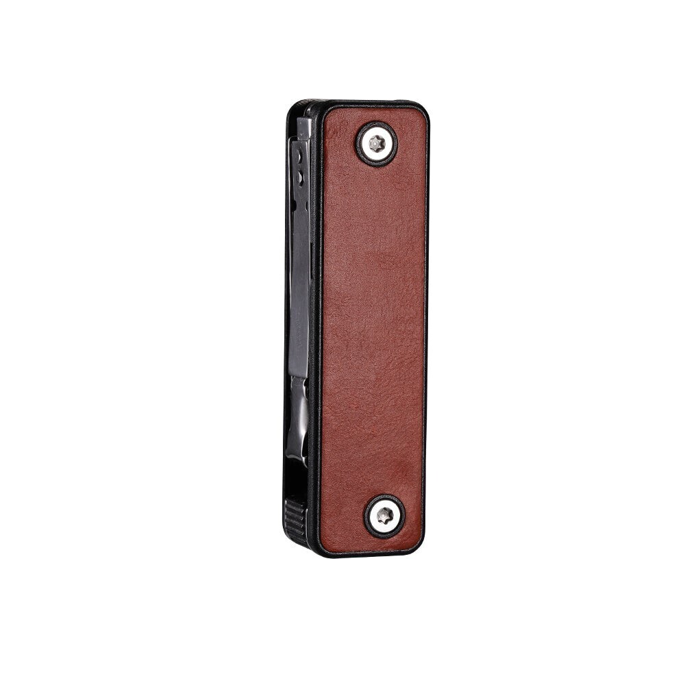 Клинок ножа выполнен из прочной нержавеющей стали 5Cr15MoV. Лезвие долго держит остроту режущей кромки, хорошо сопротивляется коррозии и отлично справляется с работой, требующей силовые нагрузки. Остальные детали состоят из нержавеющих сталей 3Cr13 и 2Cr13. Рукоятка многофункционального ножа изготовлена из АБС-пластика с кожаными вставками, что добавляет ножу стильное оформление. Компактные размеры этой модели в закрытом виде не превышают 70х19х16 мм, а вес составляет всего 64 грамма.
