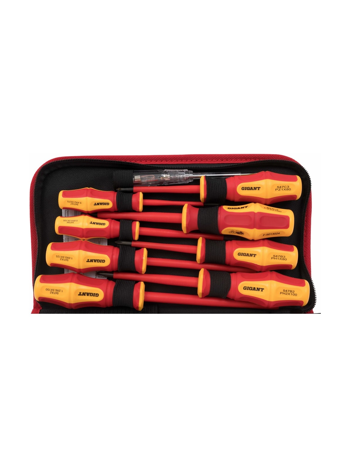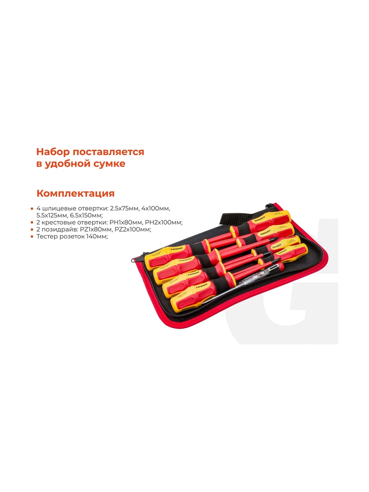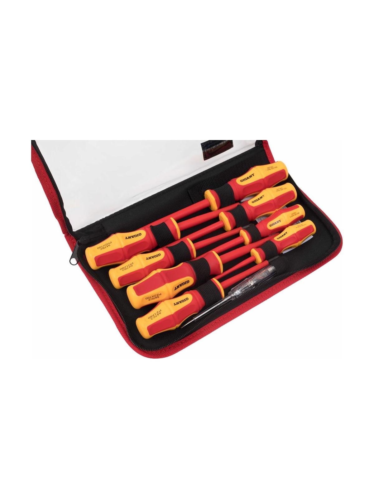 Набор диэлектрических отверток Gigant GBSD-5 рассчитан на работу с мелким и крупным крепежом с пазом типа Philips и шлицевым. Рукоятки выполнены из двухкомпонентного материала и отлично подходят для работ под напряжением до 1000 В. Есть отвертка-индикатор, которая помогает определить наличие тока в розетке или проводах.