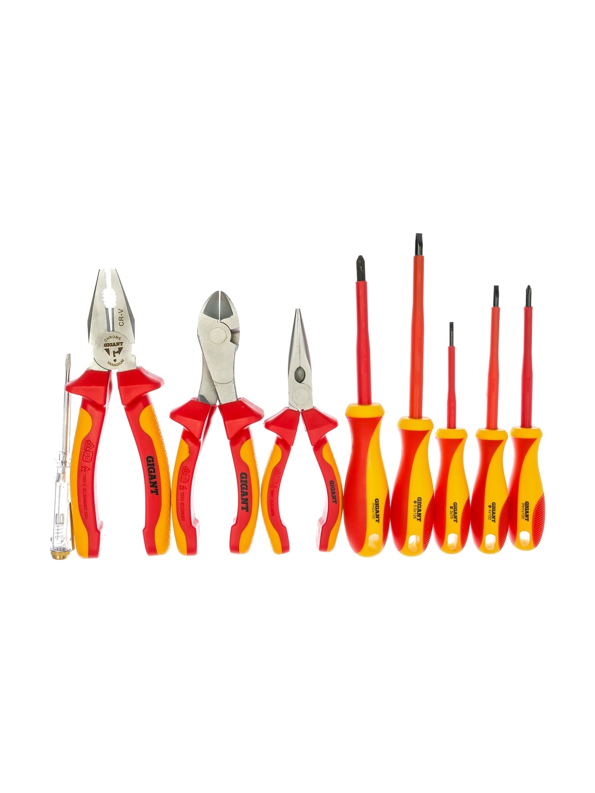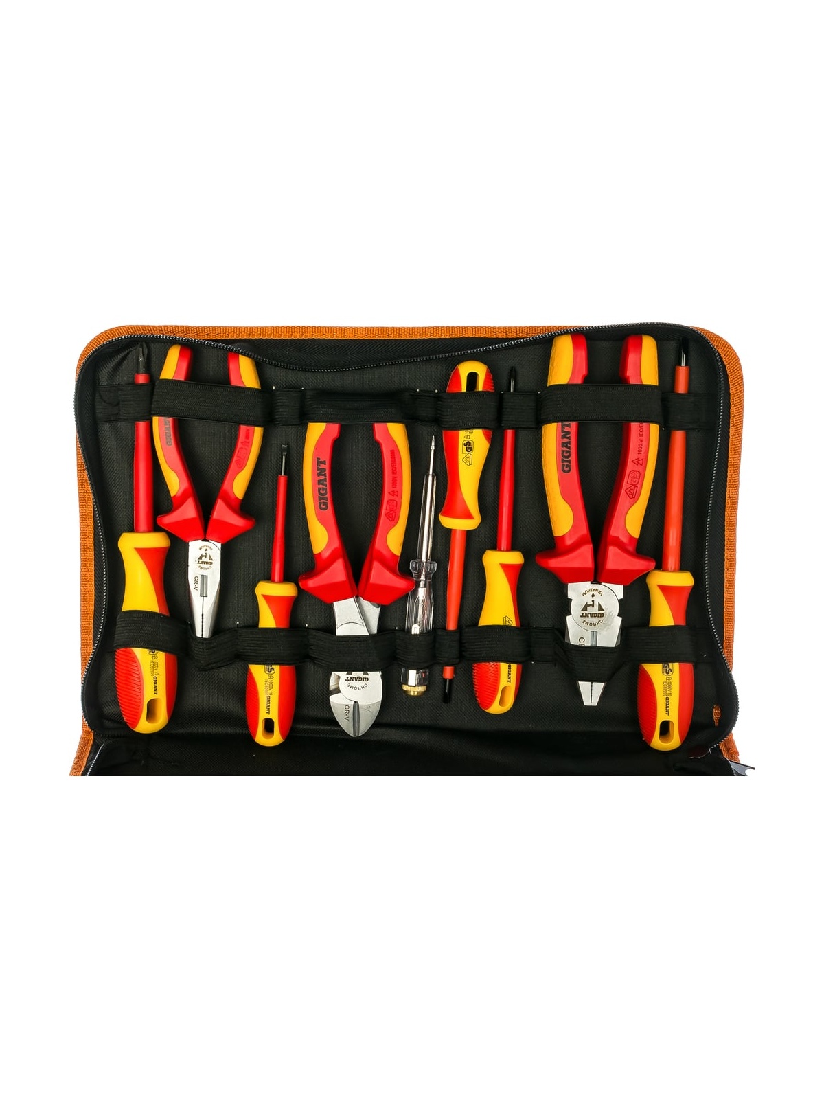 Набор электромонтажных инструментов Gigant 9 предметов ELS9 представляет собой комплект профессионального оборудования. Подходит для работы под напряжением до 1000 В. Имеются отверстия для подвешивания с целью рационального хранения. Набор поставляется в сумке для удобного хранения и транспортировки. Отвертки из набора электромонтажных инструментов Gigant 9 предметов ELS9 выполнены из инструментальной стали с повышенным содержанием углерода; Пассатижи, бокорезы и длинногубцы изготовлены из хромованадиевой стали; Диэлектрическое покрытие инструментов позволяет работать с напряжением до 1000 В.