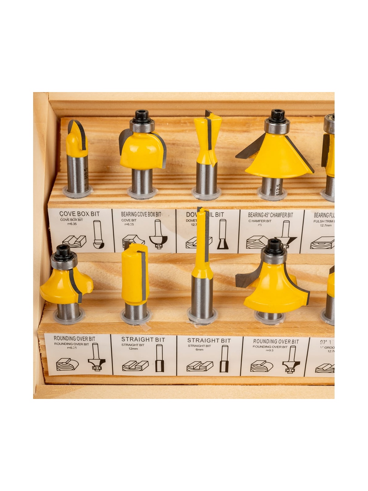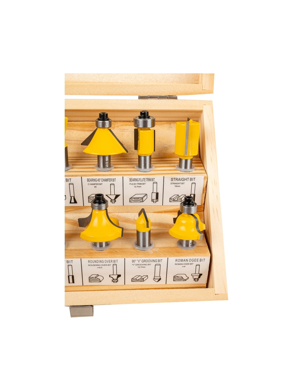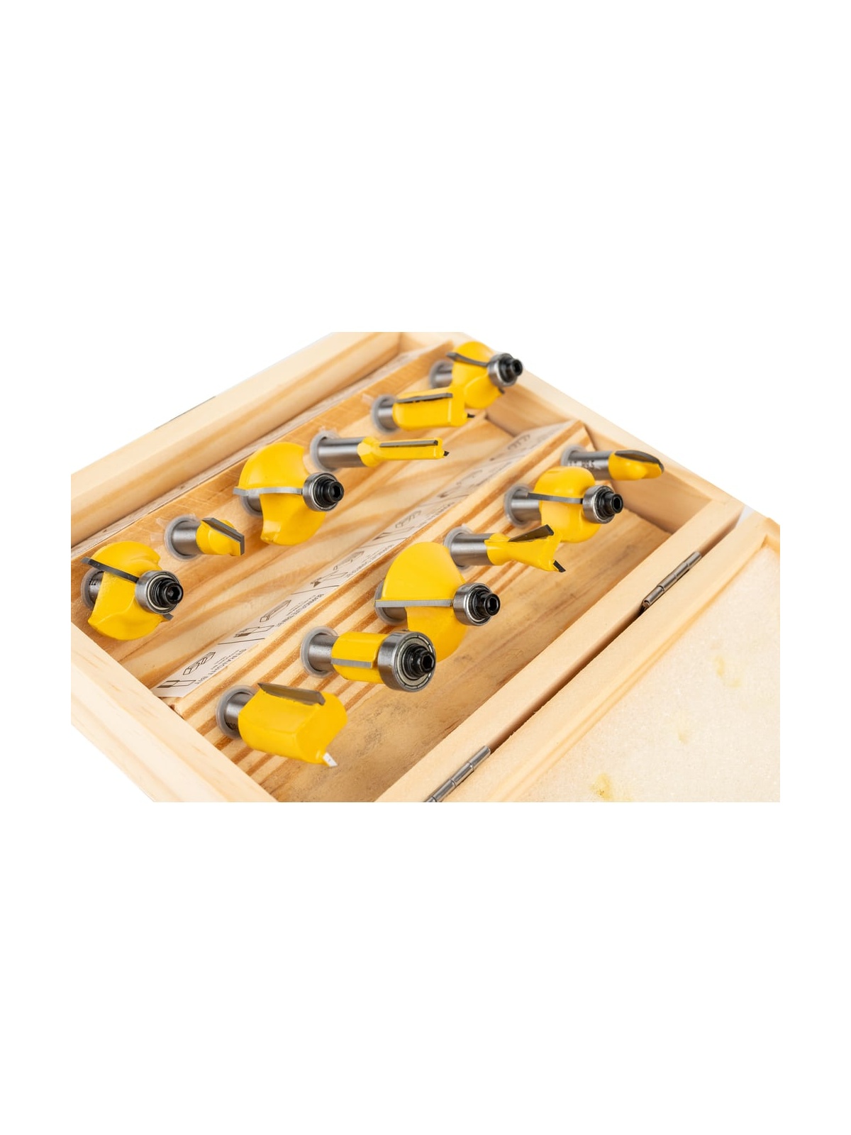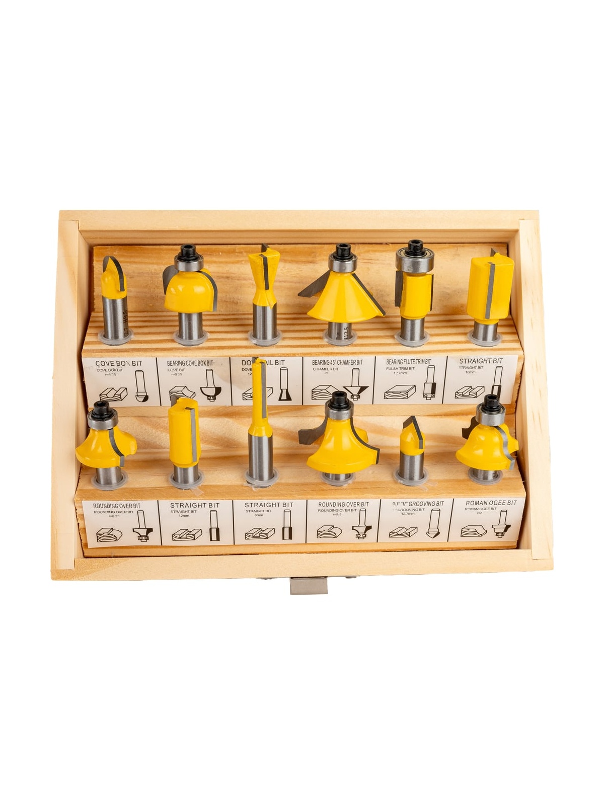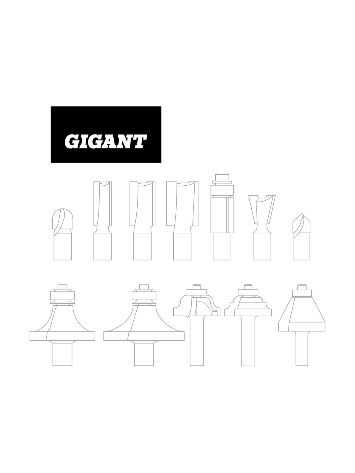 Набор фрез 12 шт. для декоративного применения Gigant GC-0075 состоит из трех пазовых прямых фрез, кромочной прямой фрезы, двух пазовых галтельных фрез, пазовой фрезы "ласточкин хвост", кромочной конусной фрезы и четырех кромочных калевочных.