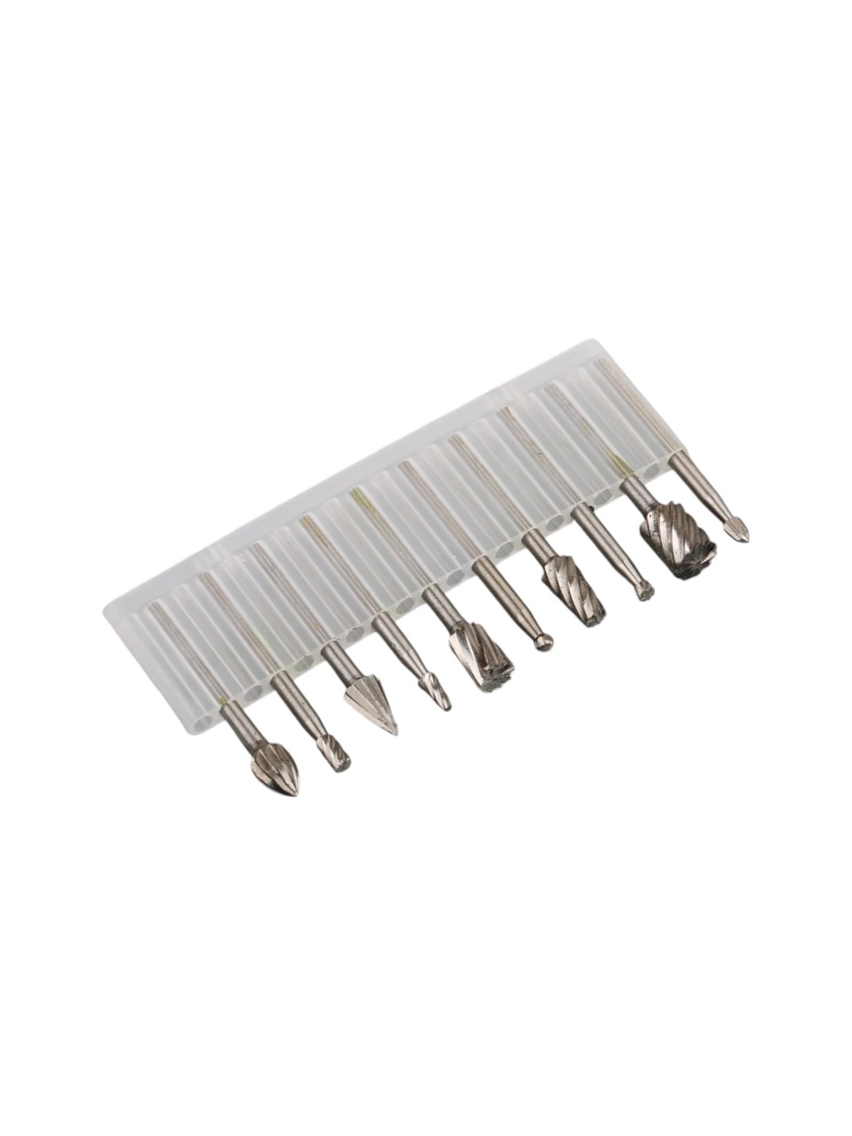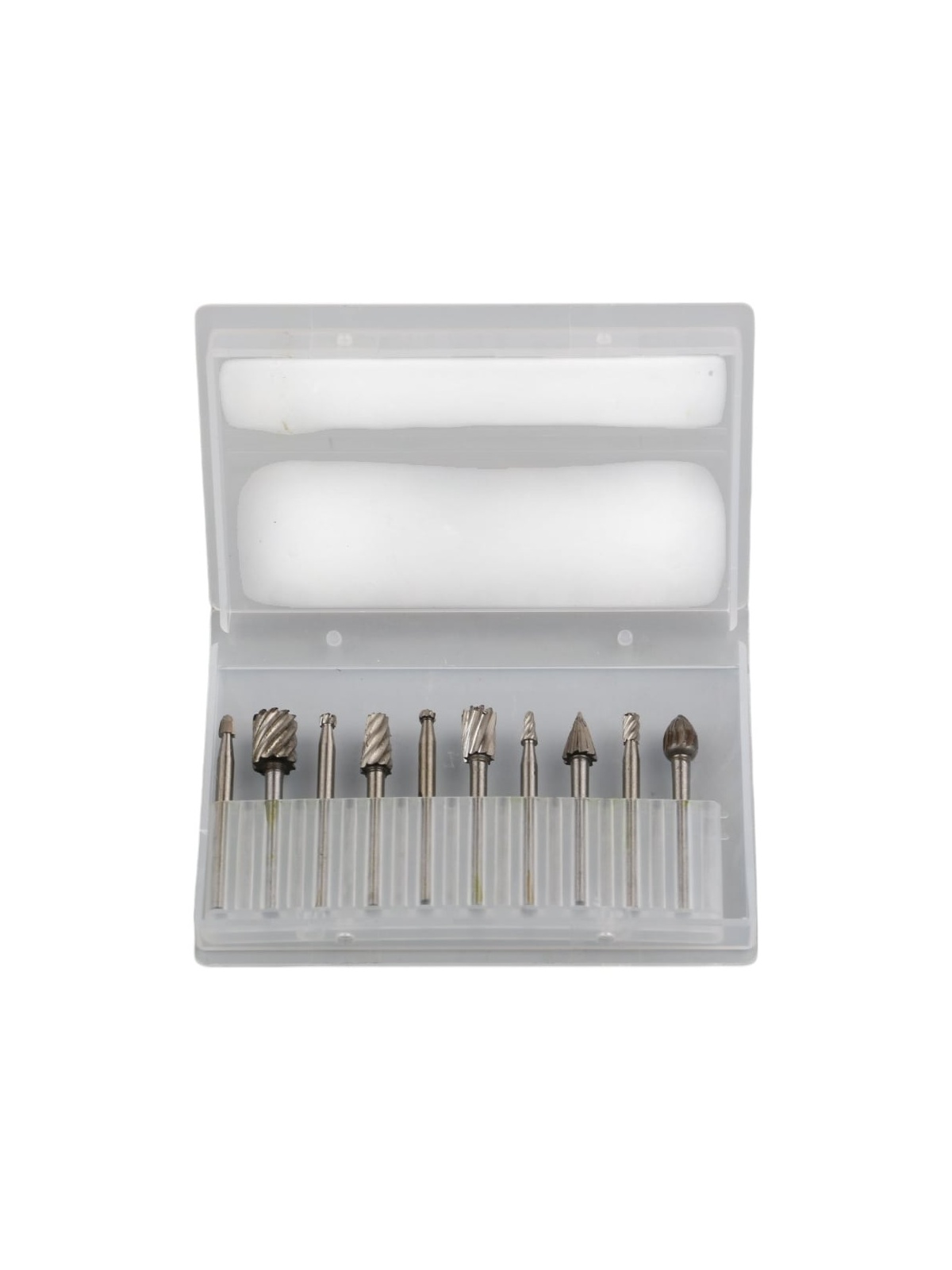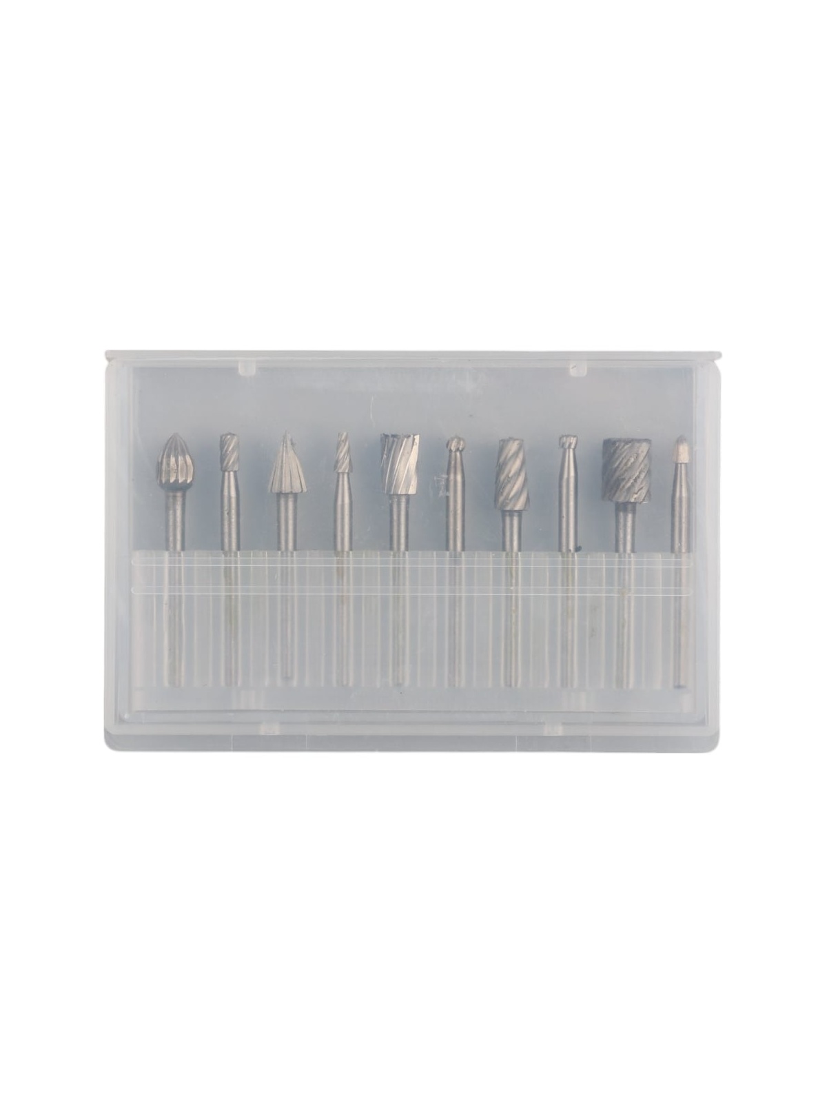 В наборе 10 твердосплавных фрез по дереву с диаметром хвостовика 3 мм. Фрезы поставляются в пластиковом кейсе для удобного хранения и переноски.