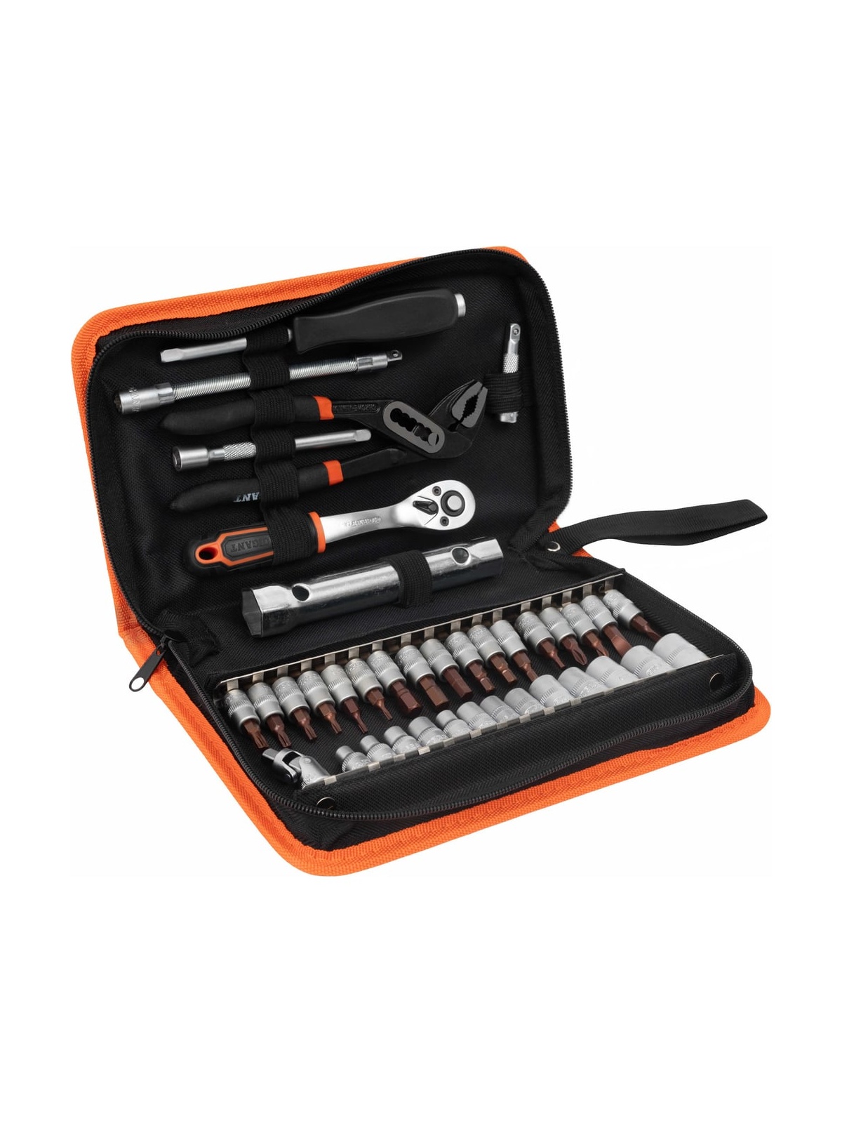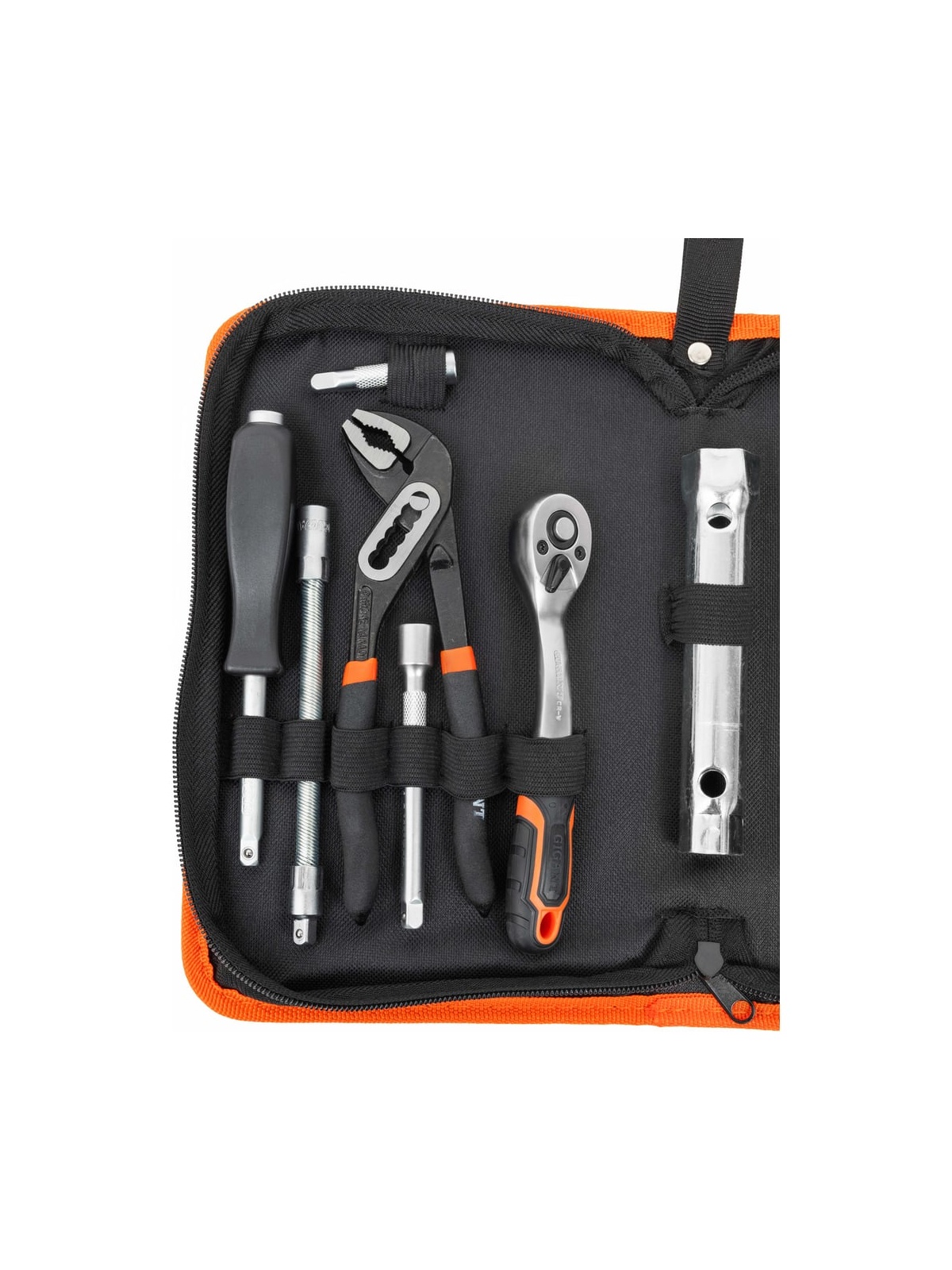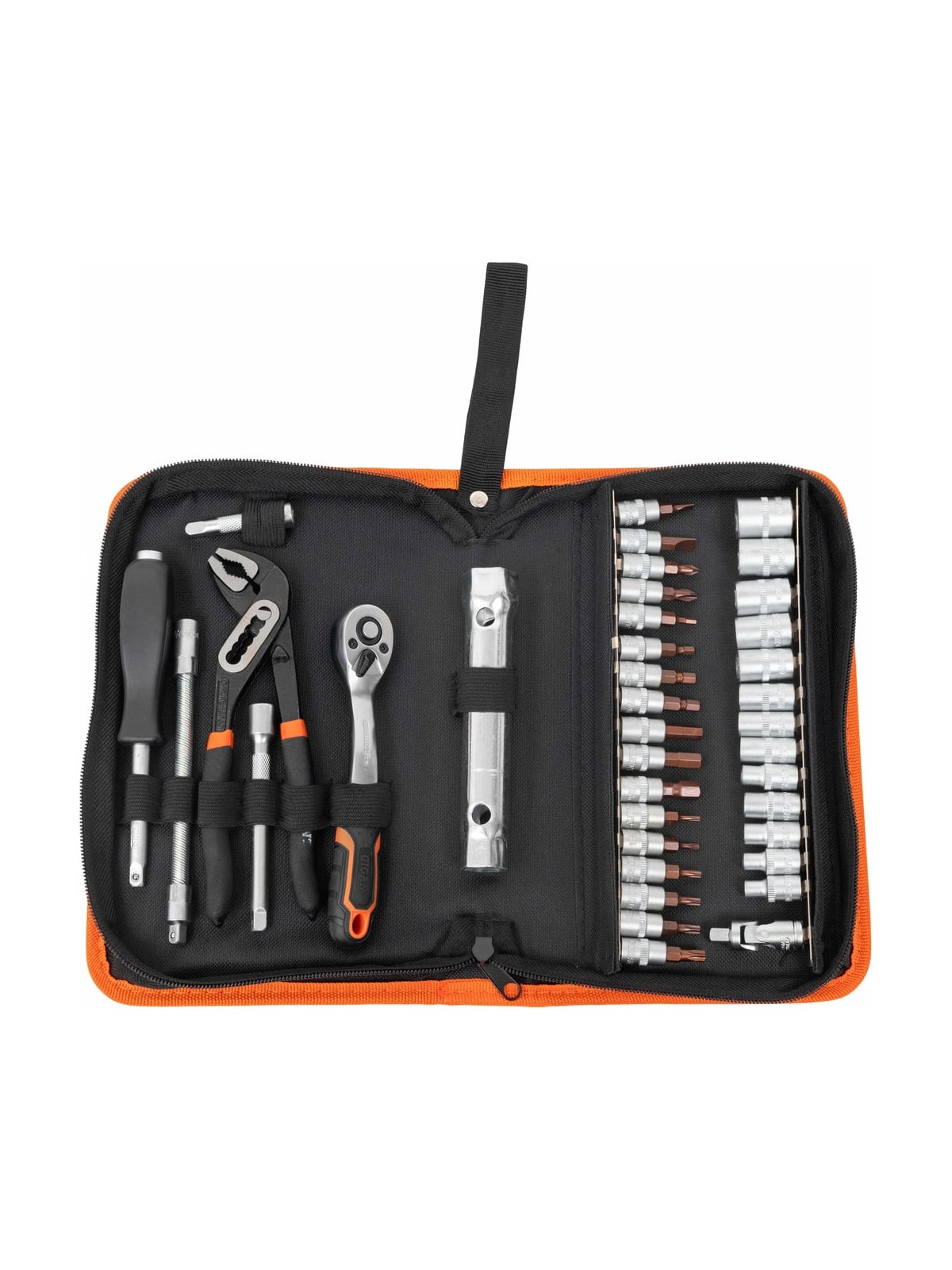 Набор головок Gigant 1/4 дюйма с инструментом в сумке, 37 предметов GAS-37 подходит для обслуживания мотоциклов, автомобилей и выполнения других работ. Сложенная сумка легко помещается в кофре мотоцикла.