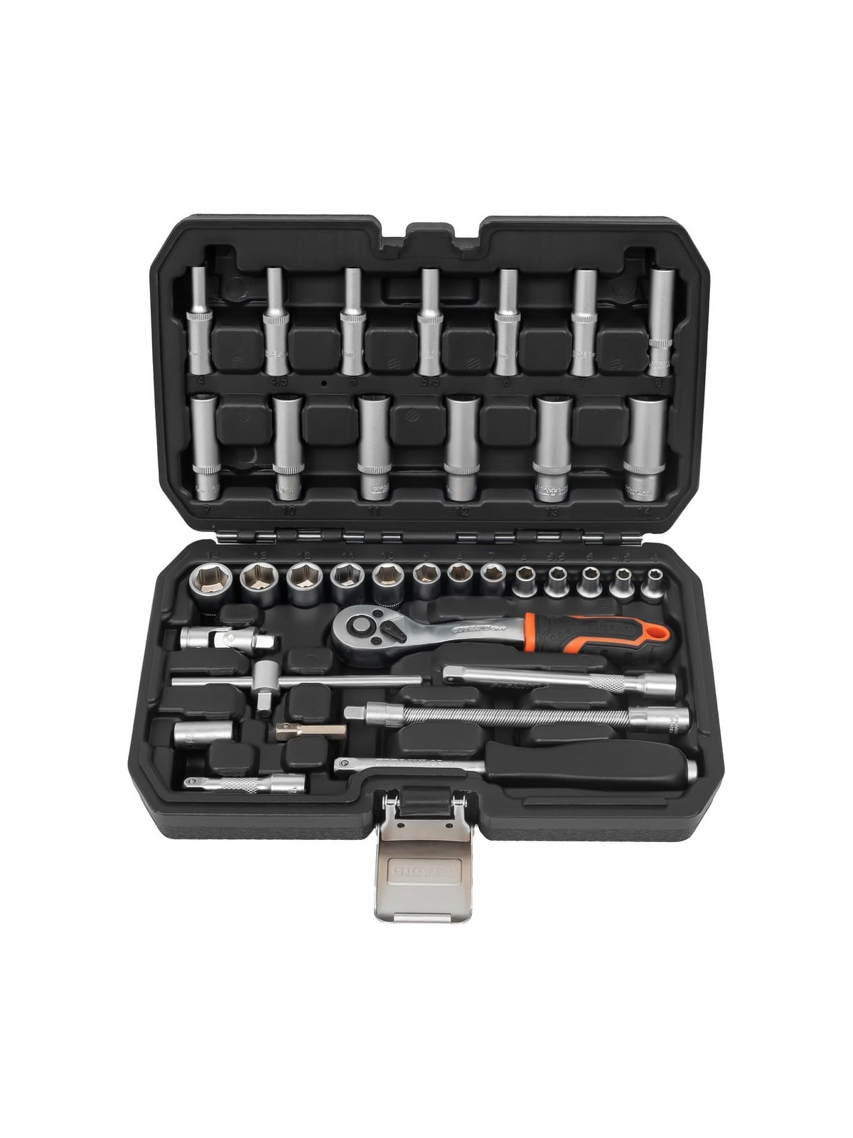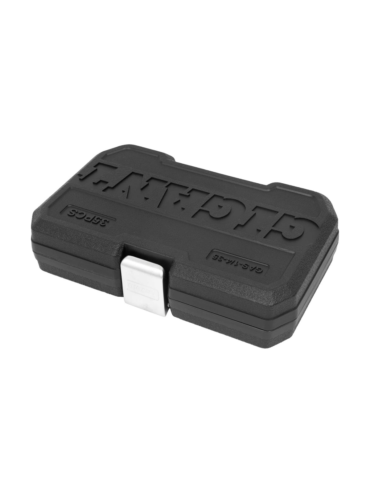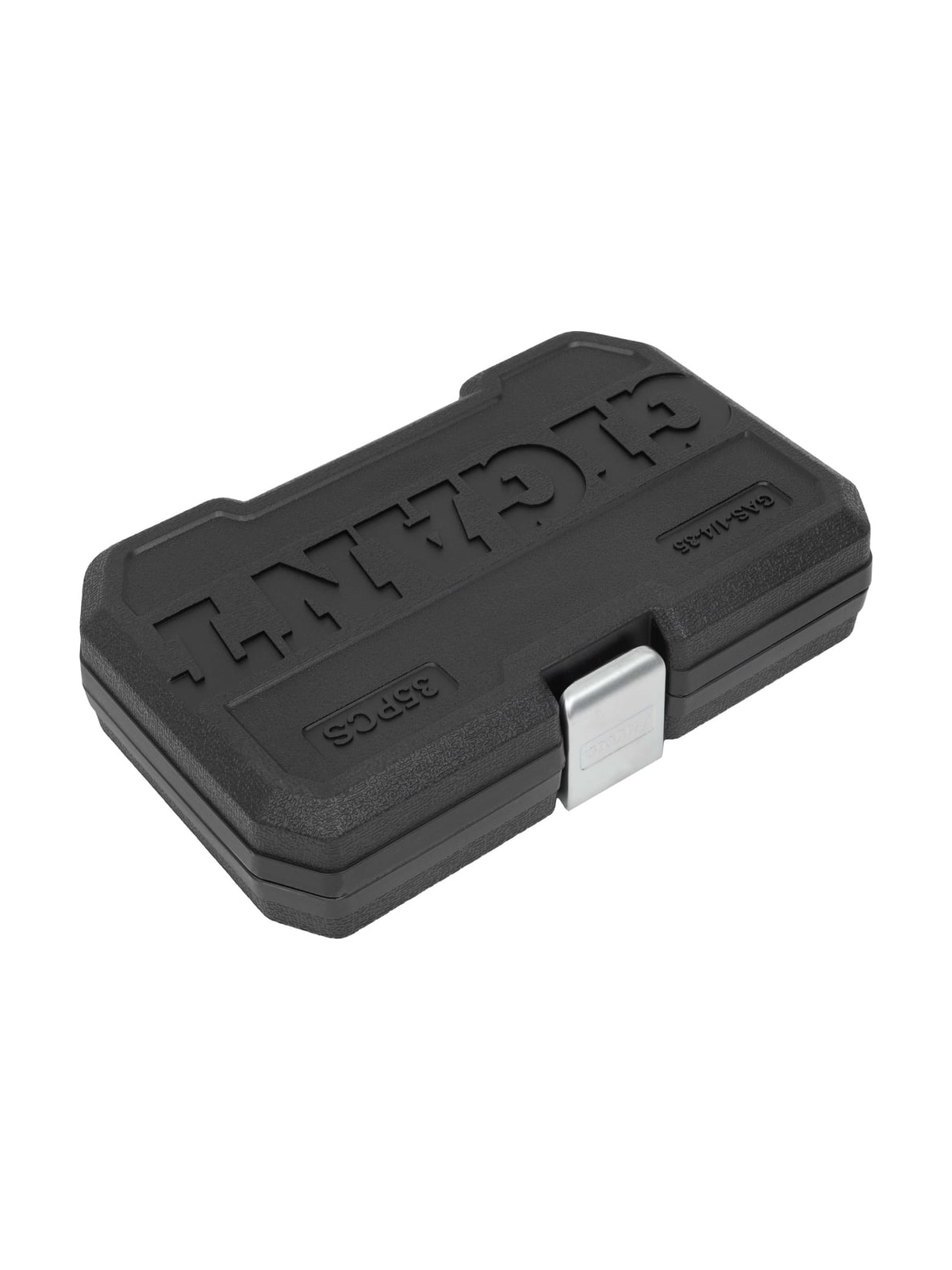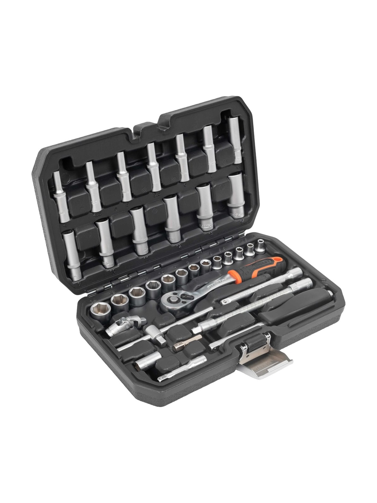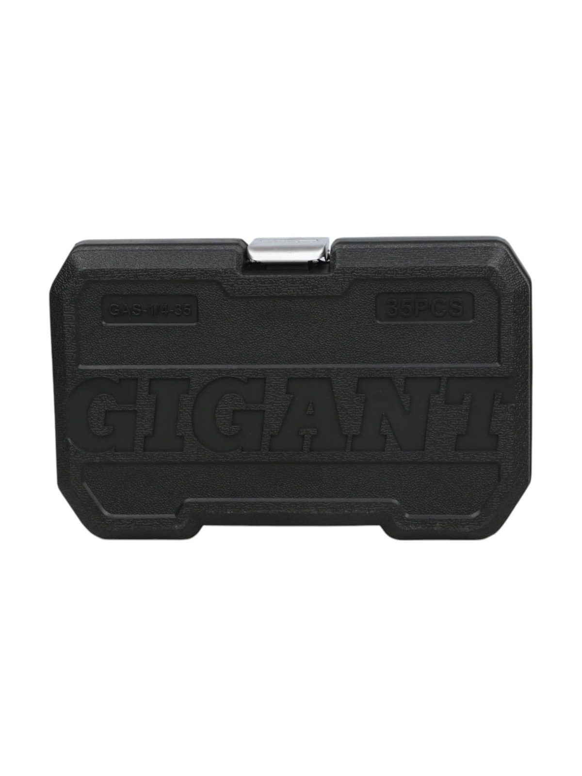 Набор головок и принадлежностей Gigant 1/4 дюйма, 35 предметов GAS-1/4-35 используется при ремонте автомобилей, а также при работе с шестигранным крепежом различного размера и сложности. Длина головок существенно отличается и при необходимости можно использовать как обычные, так и глубокие головки. Прочный пластиковый кейс упрощает транспортировку набора. Все инструменты выполнены из хромованадиевой стали высокой твердости (45-47 HRC).