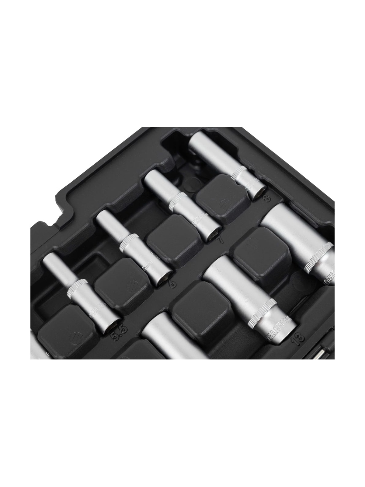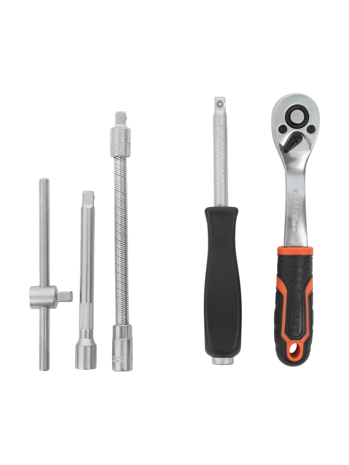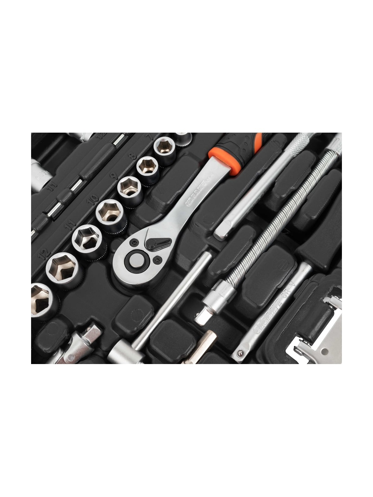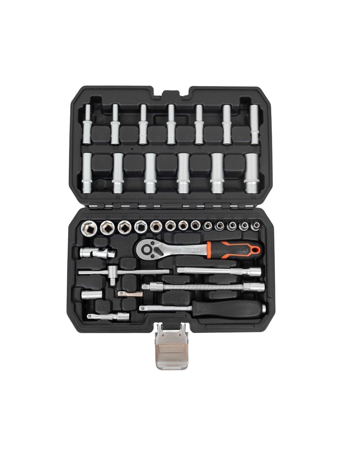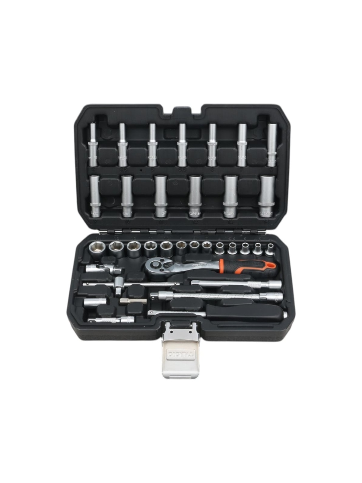 Набор головок и принадлежностей Gigant 1/4 дюйма, 35 предметов GAS-1/4-35 используется при ремонте автомобилей, а также при работе с шестигранным крепежом различного размера и сложности. Длина головок существенно отличается и при необходимости можно использовать как обычные, так и глубокие головки. Прочный пластиковый кейс упрощает транспортировку набора. Все инструменты выполнены из хромованадиевой стали высокой твердости (45-47 HRC).